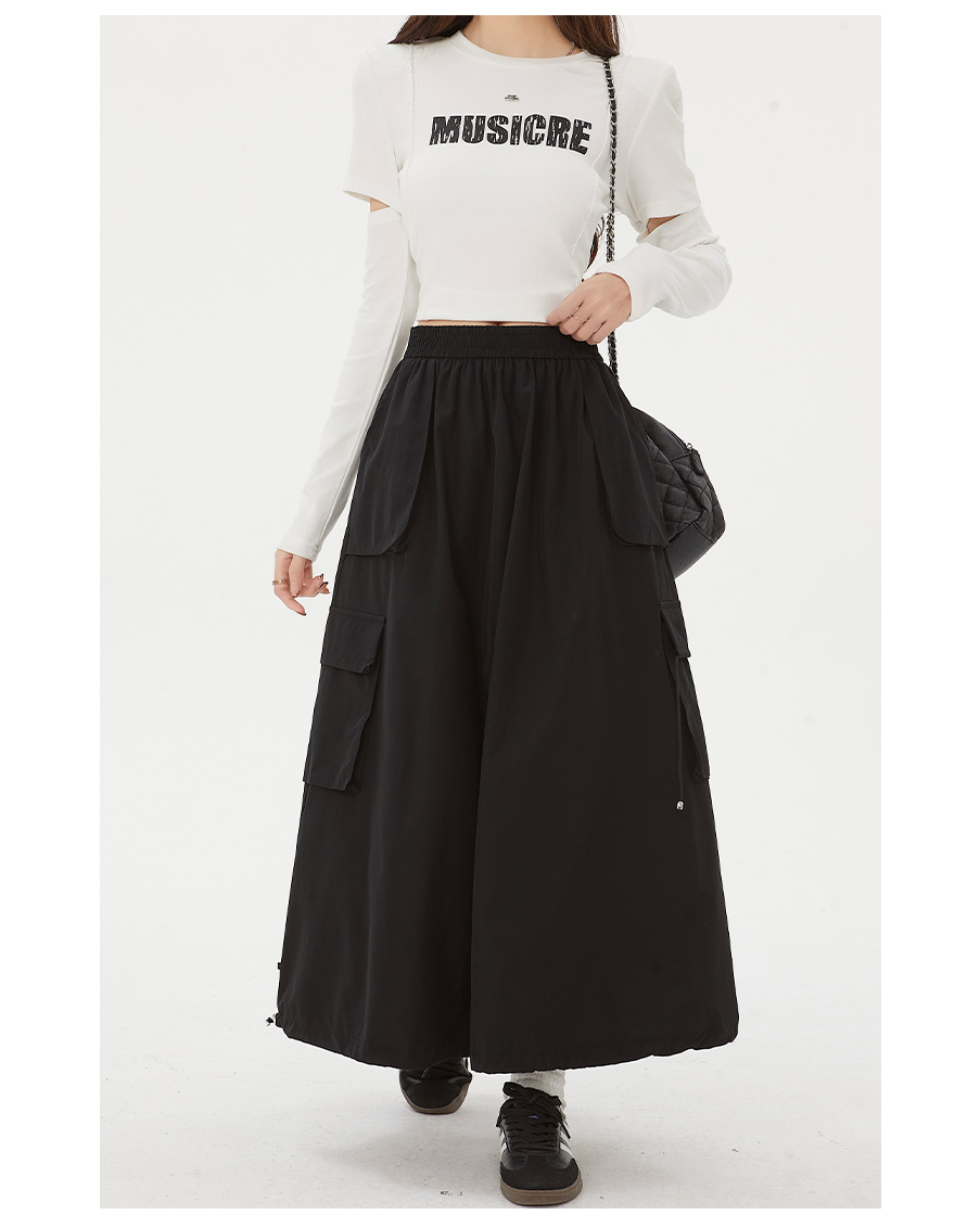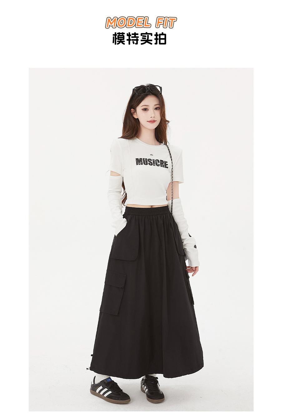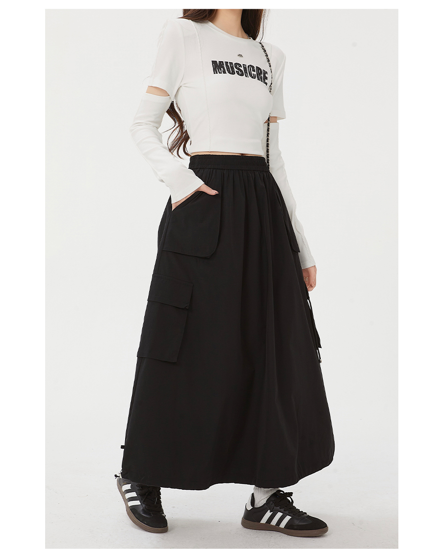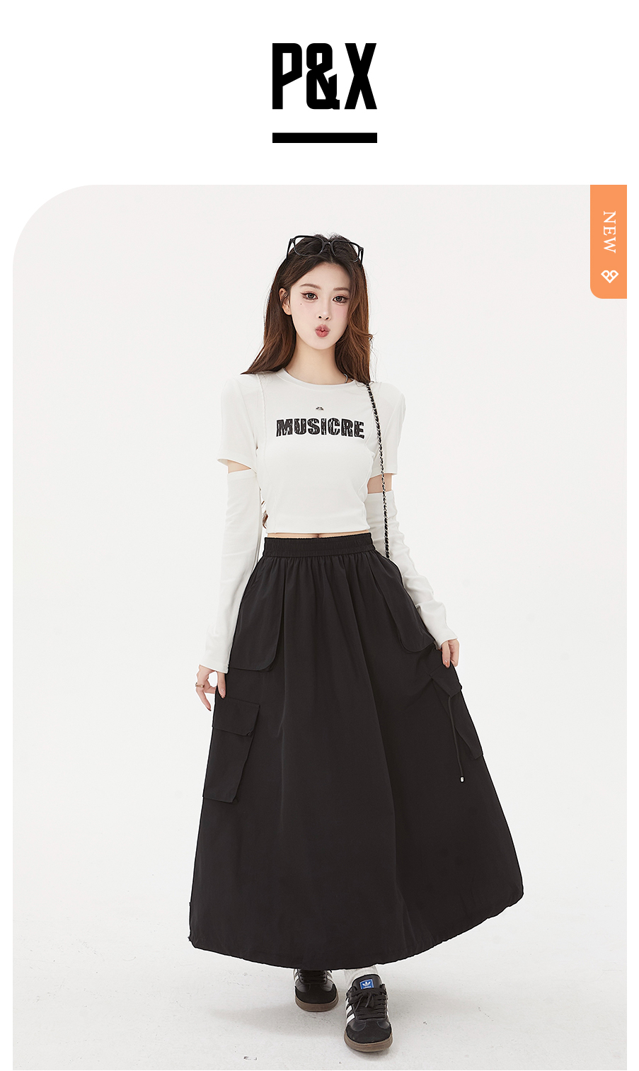 P&X设计师女装 新款工装休闲梭织半身长裙松紧腰825107087 黑色