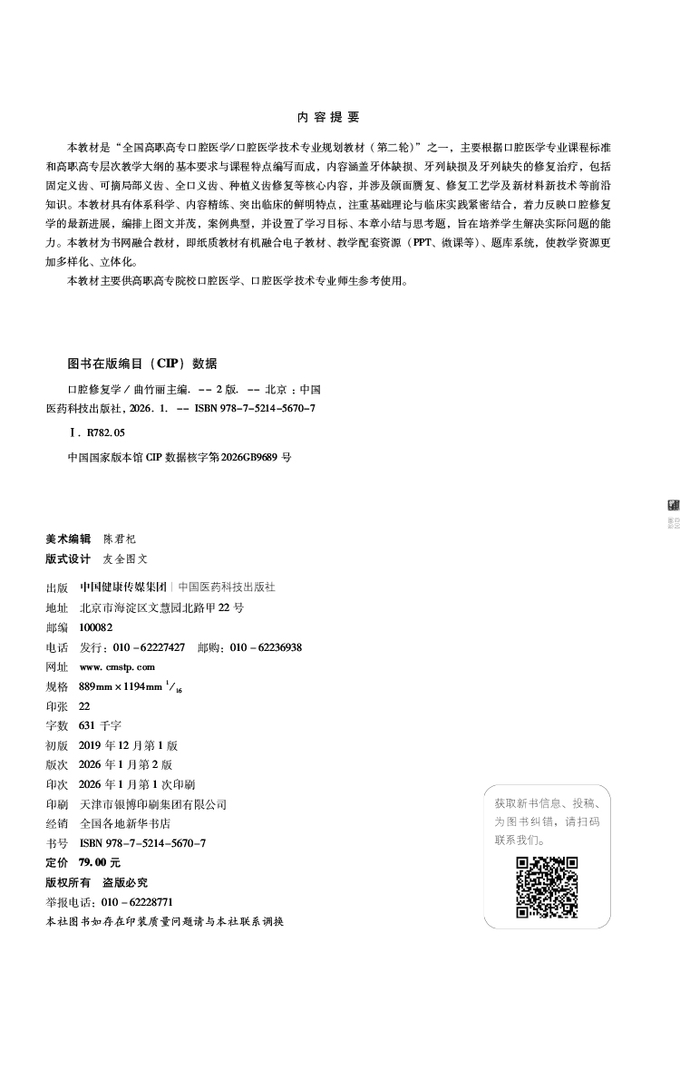 口腔修复学 第2二版 口腔医学技术专业规划教材(第二轮) 曲竹丽 供口腔医学、口腔医学技术专业用9787521456707中国医药科技出版社