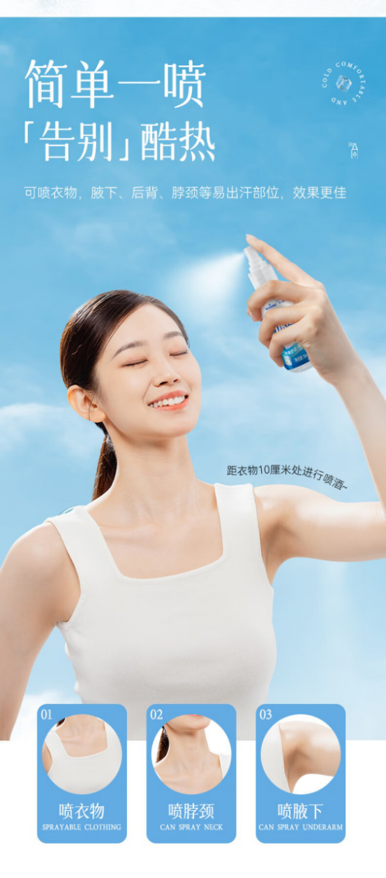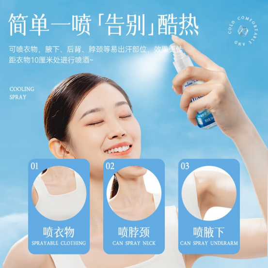赶走闷热 ,凉感持续至皮肤层 清凉干爽不粘腻,轻轻一喷衣物,快速带走热量,体感沁凉 即刻冰爽降温 ,小小一只 轻巧便携 做你行走的小空调