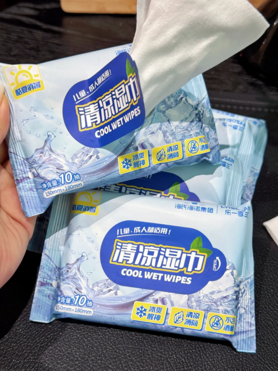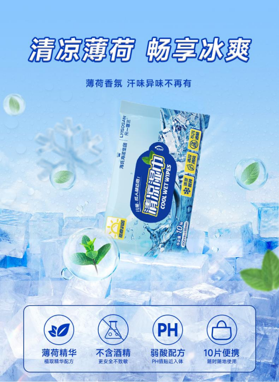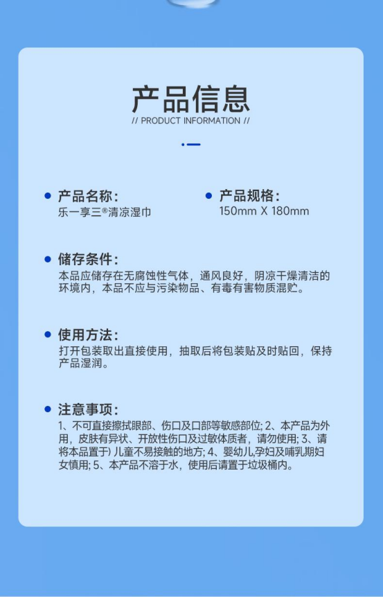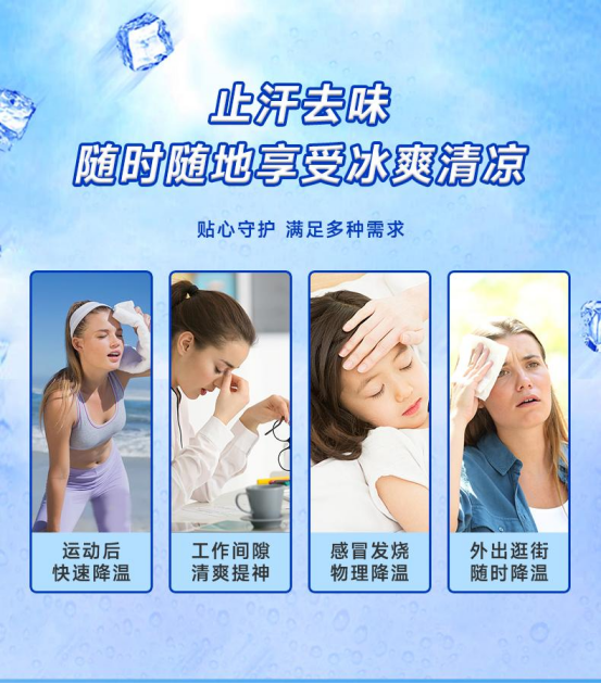 物理降温 擦走汗味 冰爽提神 材质柔韧耐拉扯 细腻亲肤 不易掉毛起絮 随时随地 保持冰爽清凉感 温和配方 肌肤零刺激 无可迁移性荧光增白剂 使用安全放宽心