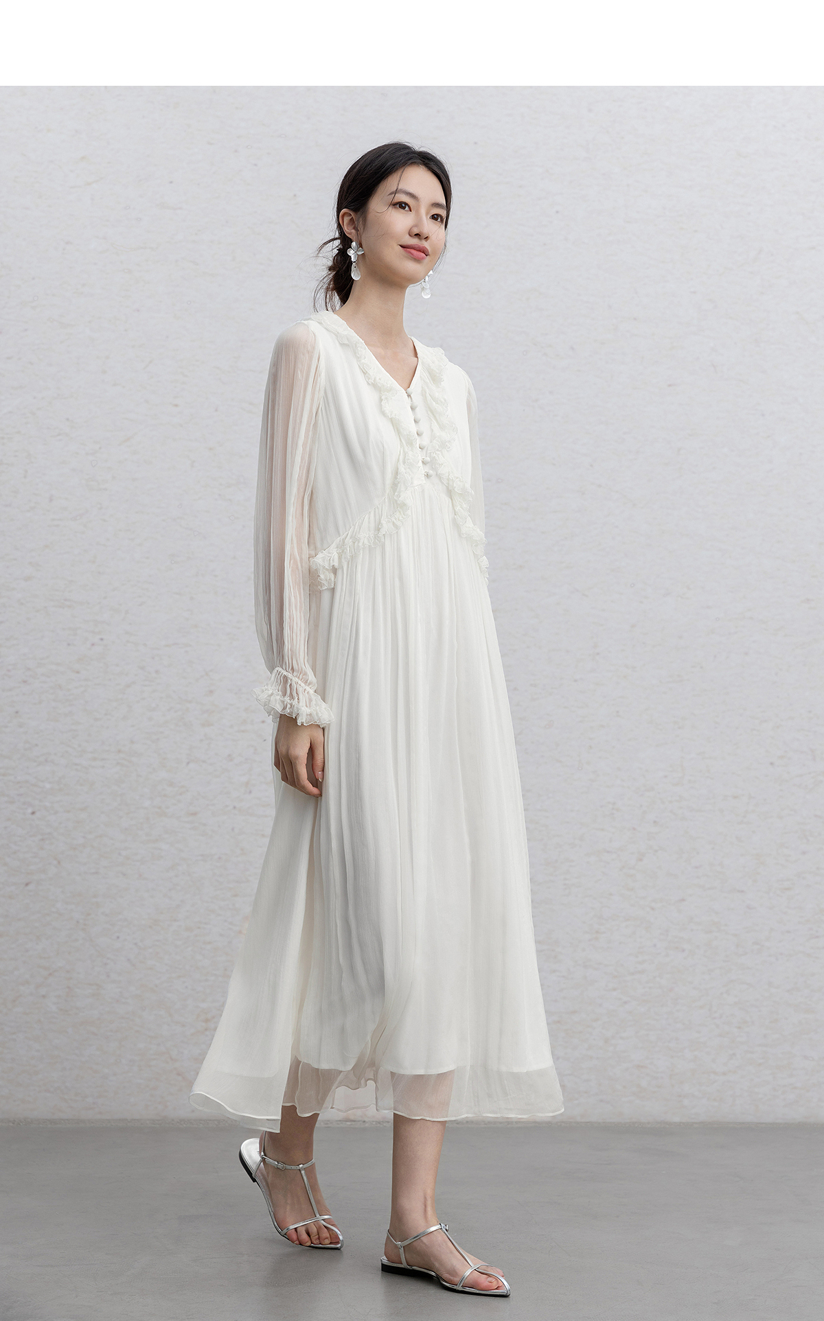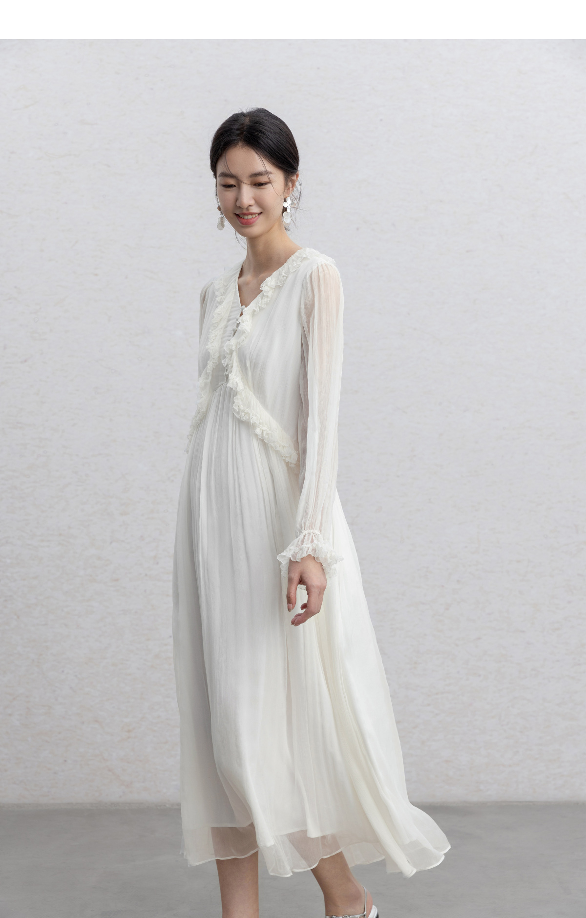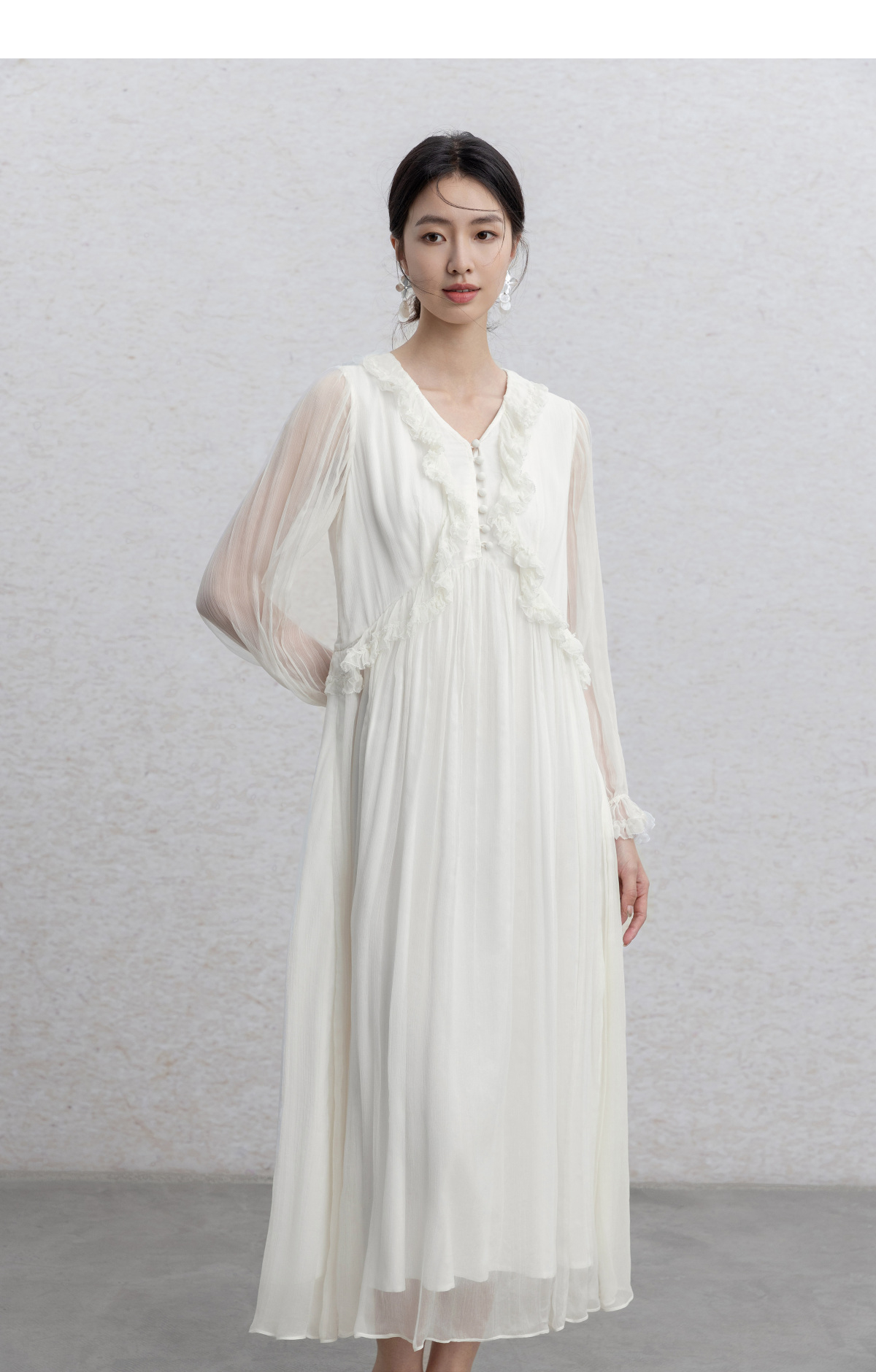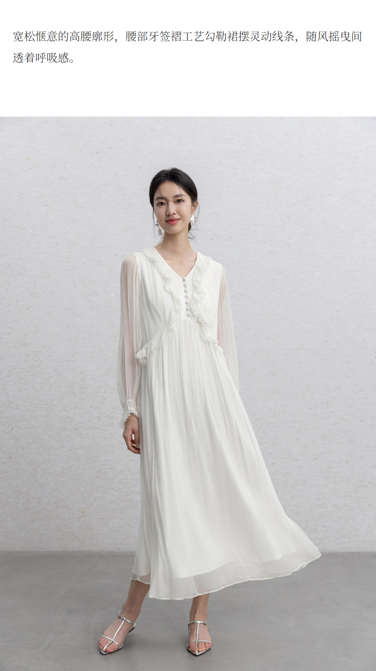 【林栖设计小店】蕾丝花边桑蚕丝牙签褶高腰仙气2026春新款真丝连衣裙1961033
