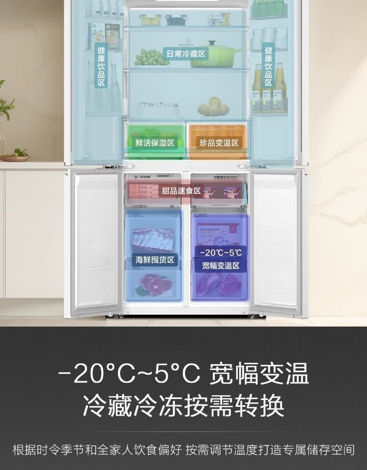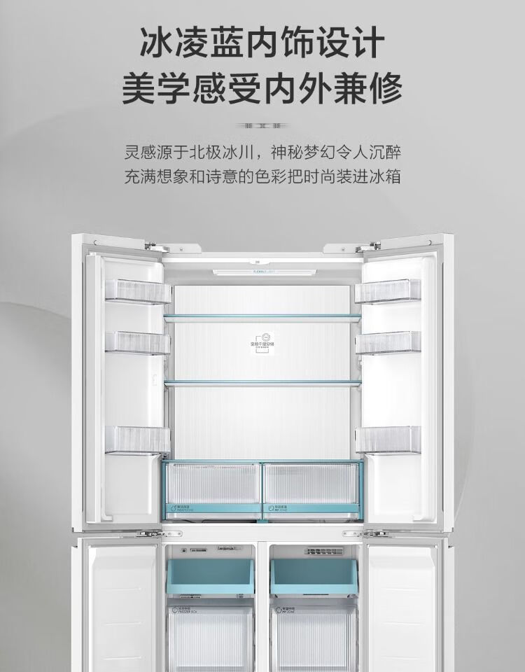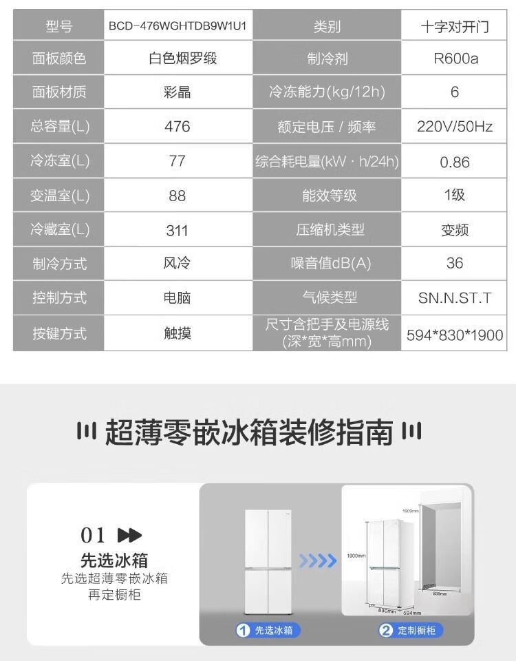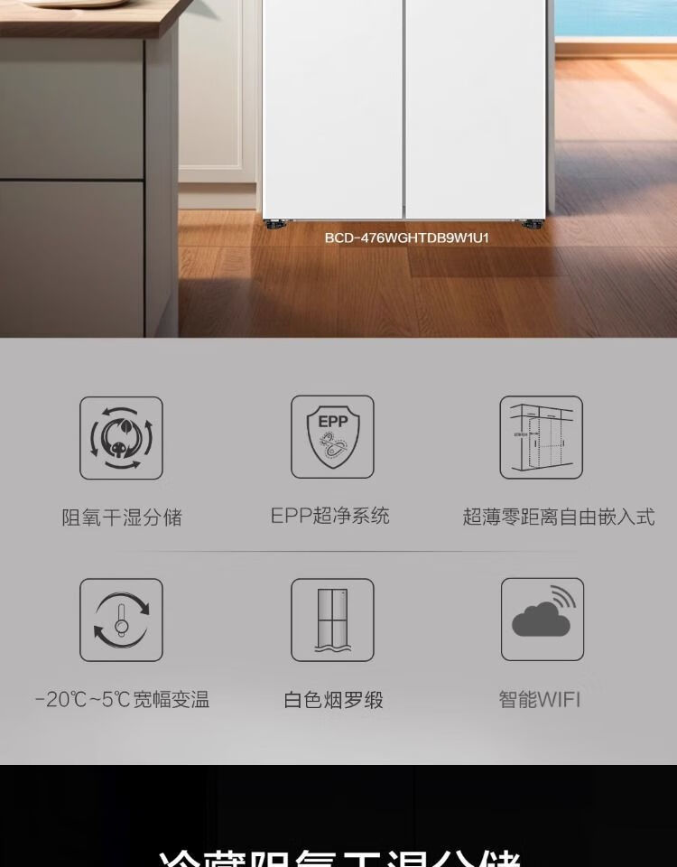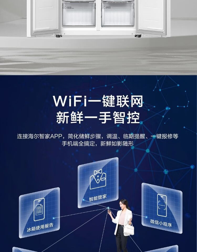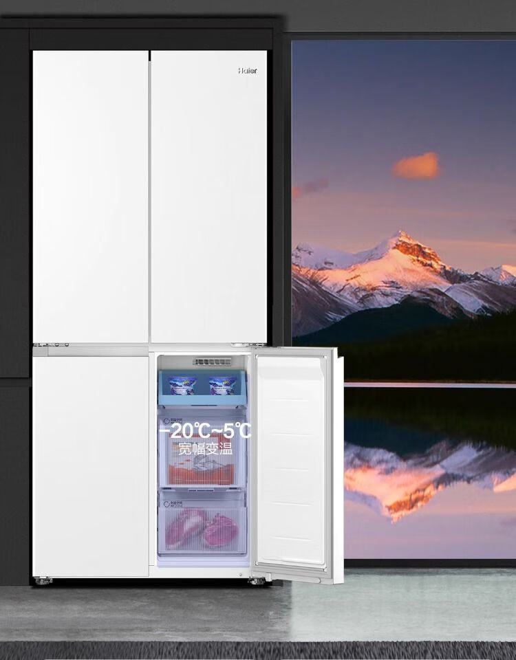 海尔476升十字对开门四门干湿分储一级双变频风冷无霜宽幅变温EPP超净家用冰箱 BCD-476WGHTDB9W1U1玻璃面板