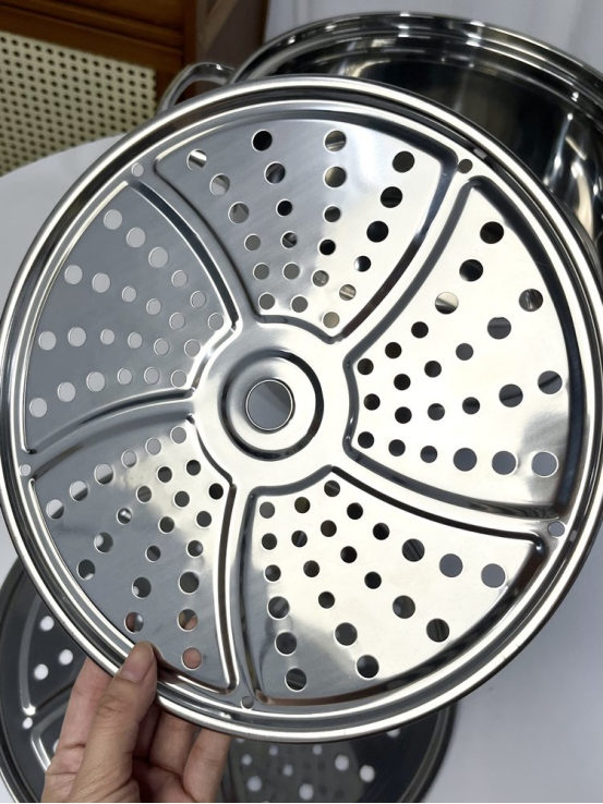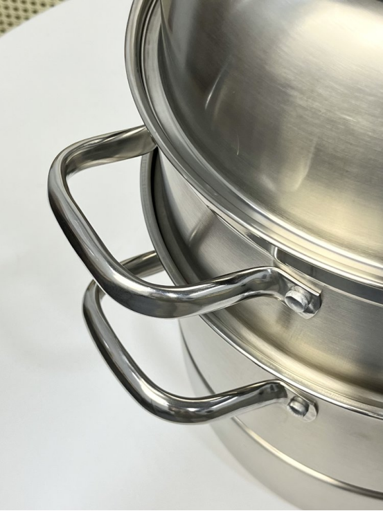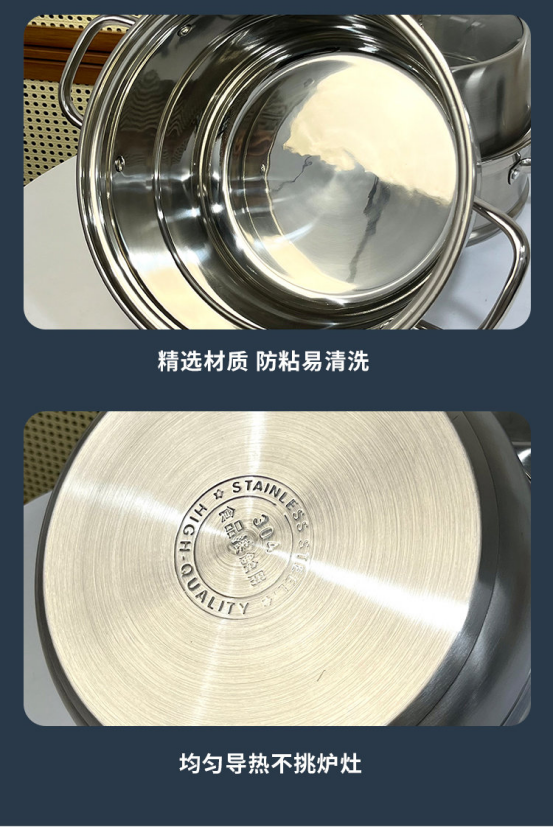再看看细节,铆钉连接 牢固耐用,不易脱落 光洁锅身-清洗便捷省心蒸屉附耳设计方便端拿,便捷使用。
