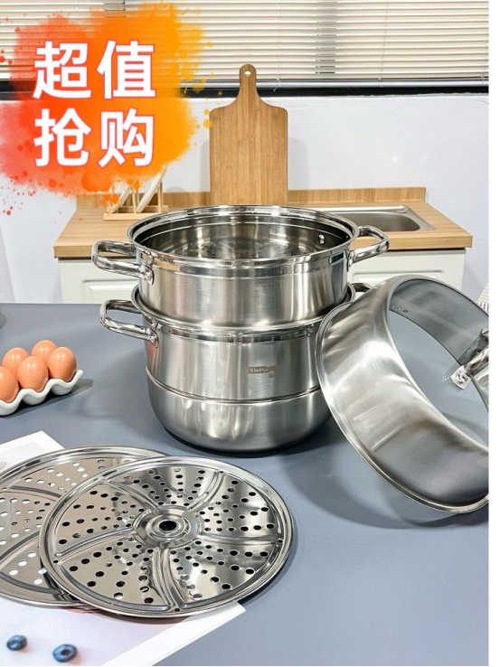 ✅易收纳大容量不锈钢蒸锅 ✅上蒸下煮 热循环设计 加高拱盖 套叠收纳 ✅锅内蒸汽立体循环加速炖煮 鲜人一步 ✅密封热循环设计,形成蒸汽内循环 ✅360°全方位受热新鲜美味不久等