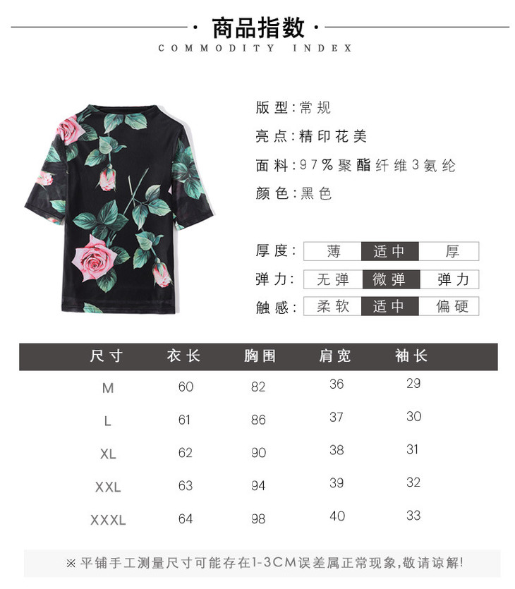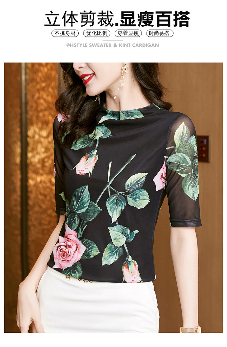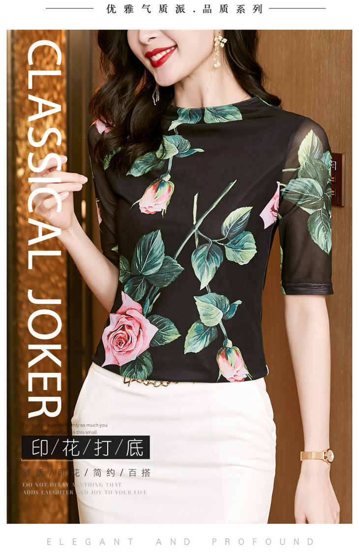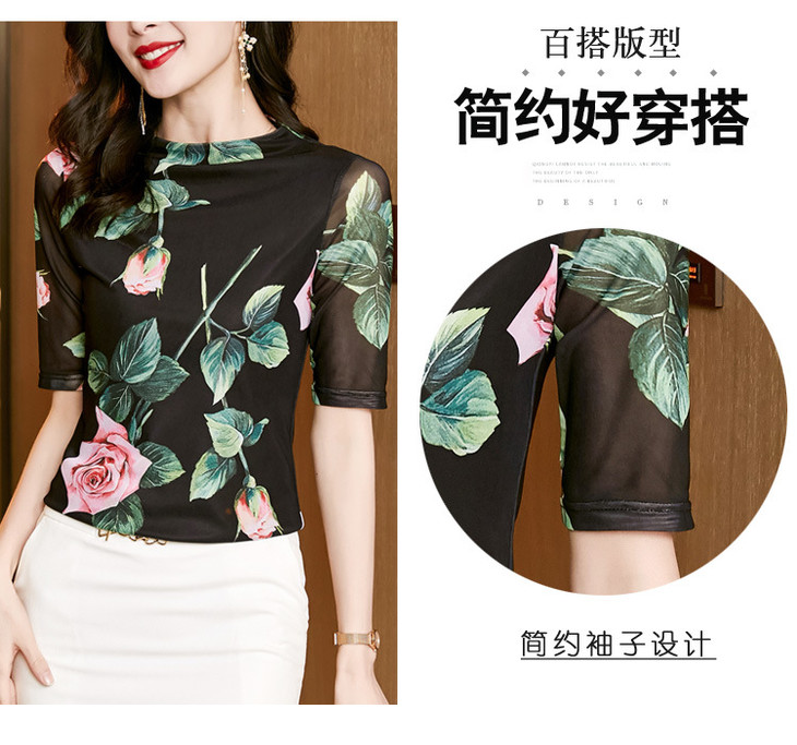 夏季新款显瘦百搭玫瑰印花中袖,时尚网纱打底衫t恤上衣KQL-2311