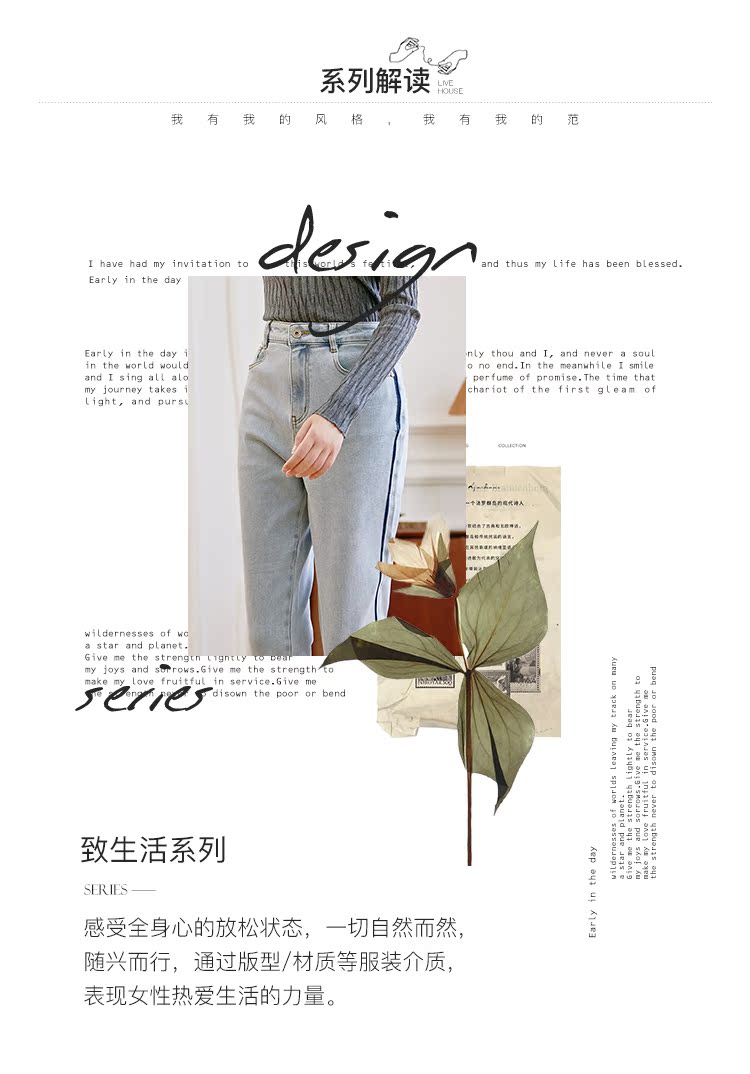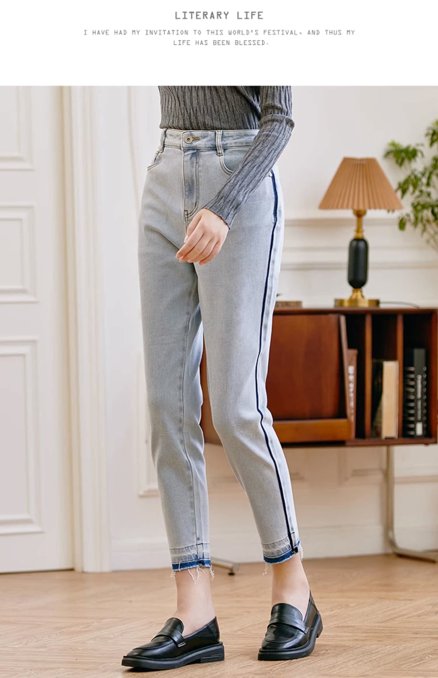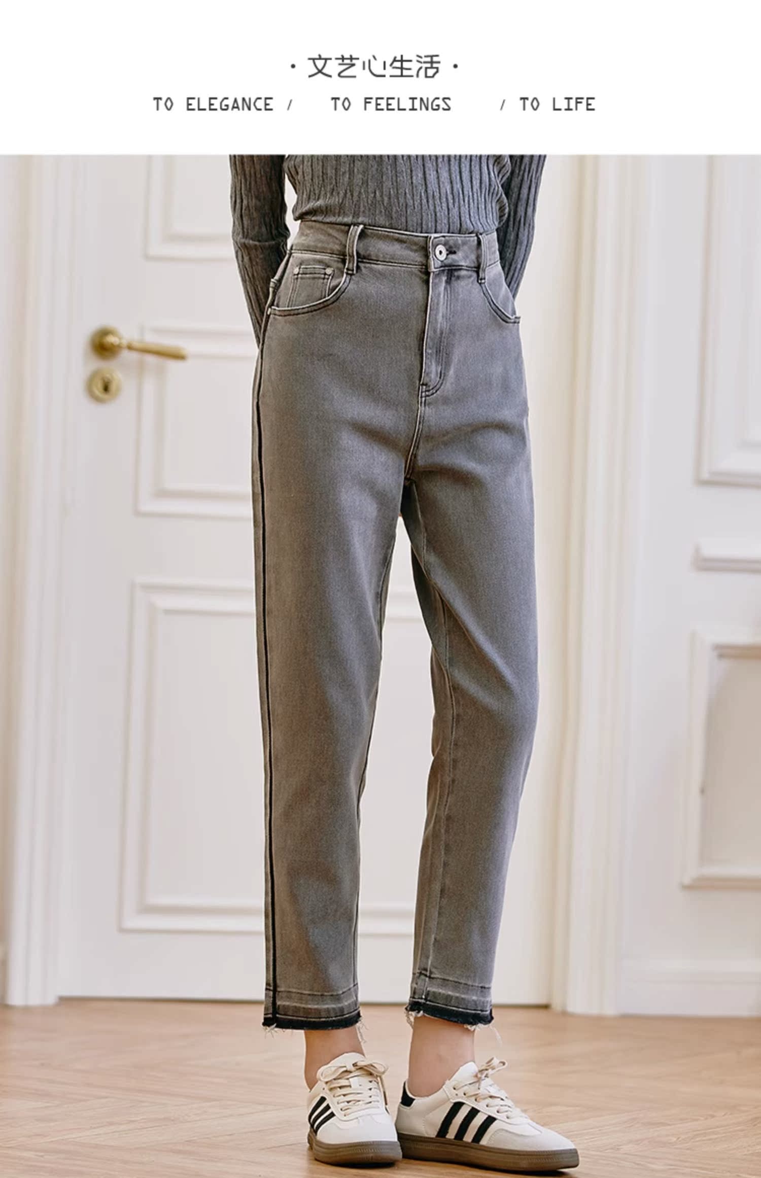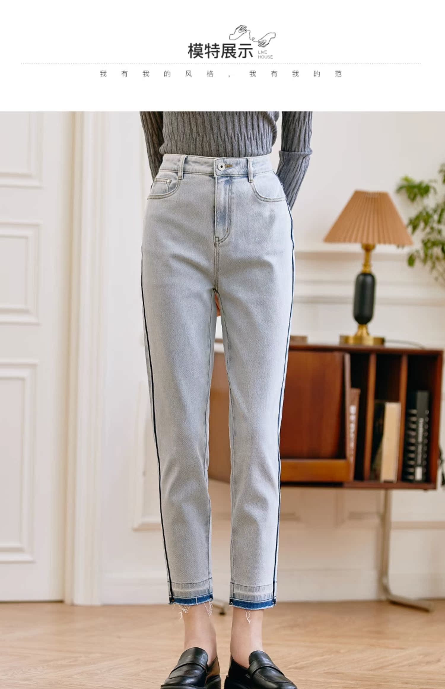 Famecoco范可儿原创水洗做旧浅色牛仔裤女款秋季新品撞色长裤F225GA017