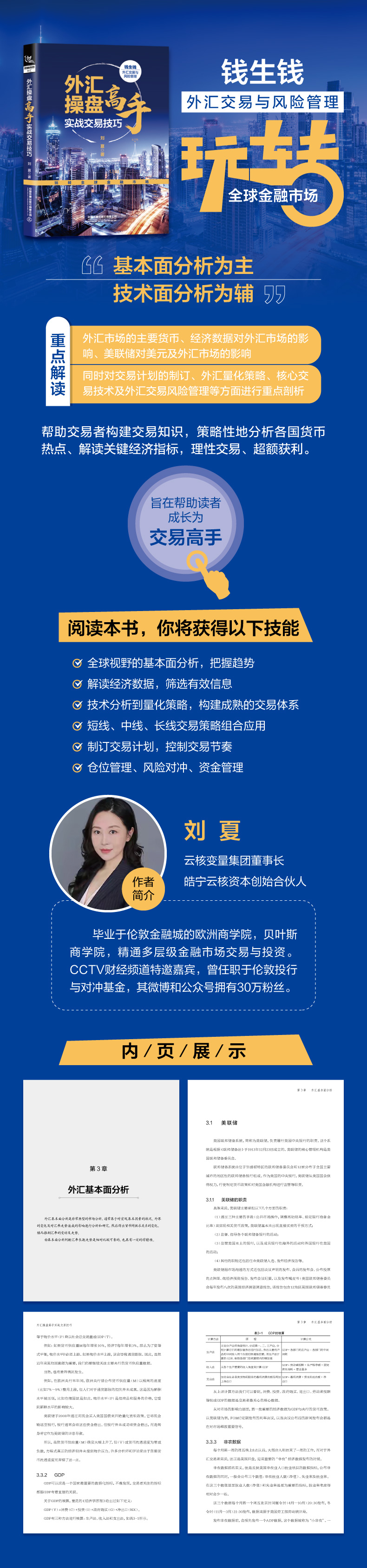 本书旨在引领读者成长为外汇交易高手,全书在“基本面分析为主、技术面分析为辅”的框架下,重点解读外汇市场的主要货币、经济数据对外汇市场的影响、美联储对美元及外汇市场的影响,同时对交易计划的制订、外汇量化策略、核心交易技术及外汇交易风险管理等方面进行重点解读,帮助交易者构建全面的交易知识体系,策略性地分析各国货币热点、解读关键经济指标,使交易者能够理性交易,获得超额收益。