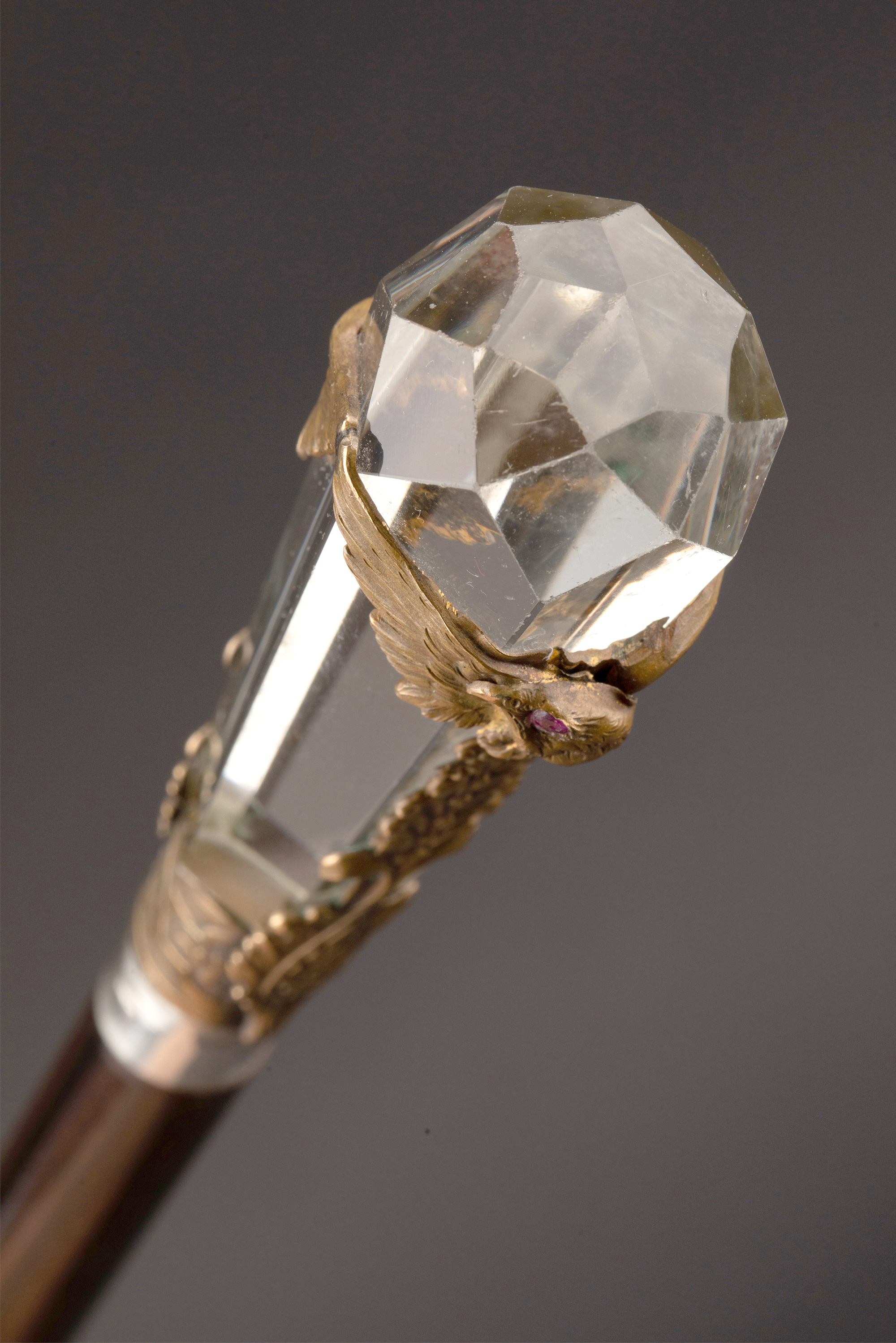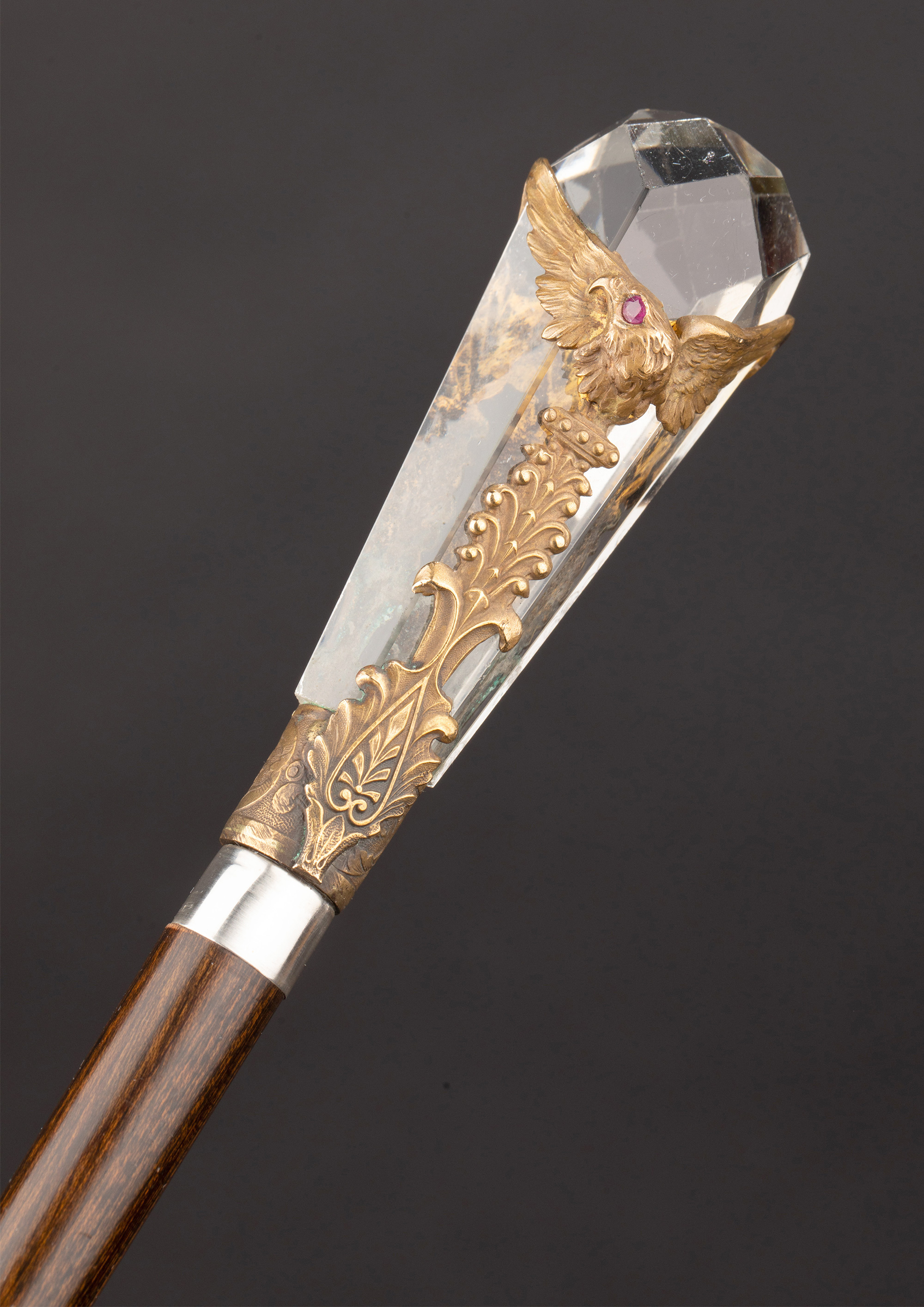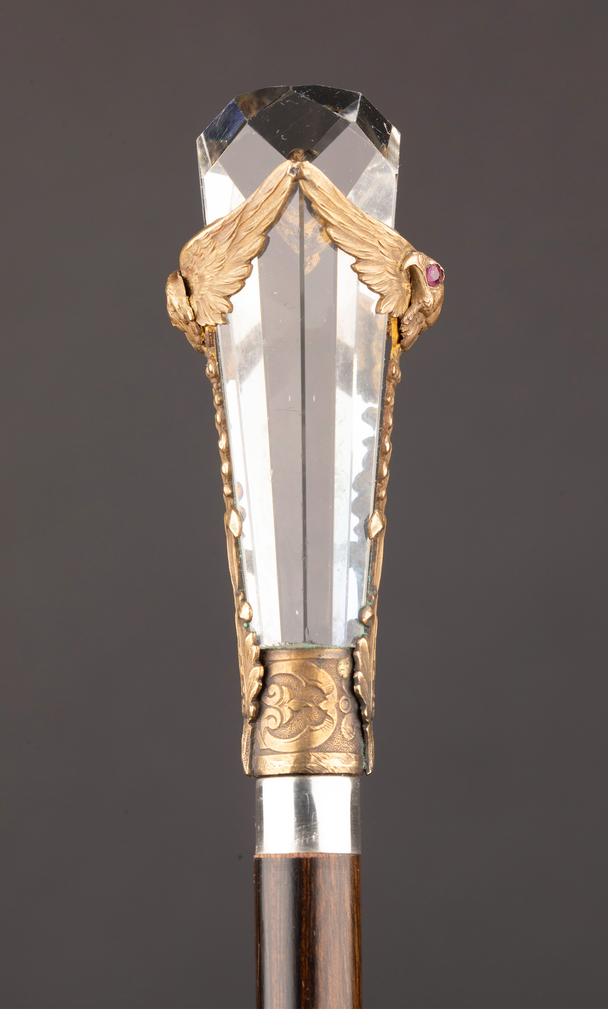 1890年代法国出品镀银精雕镶嵌红宝石双鹰纹主题水晶手柄硬木手杖