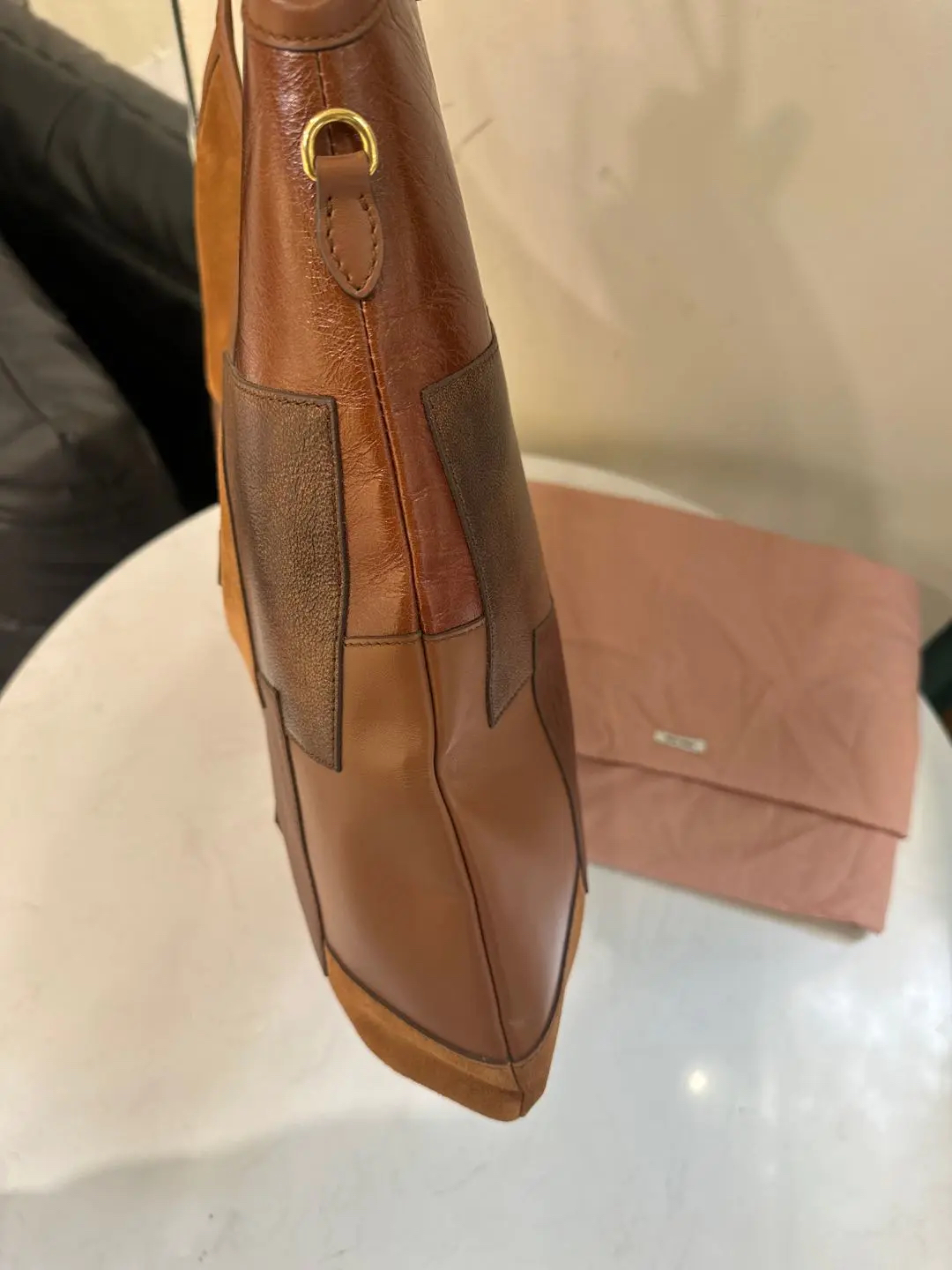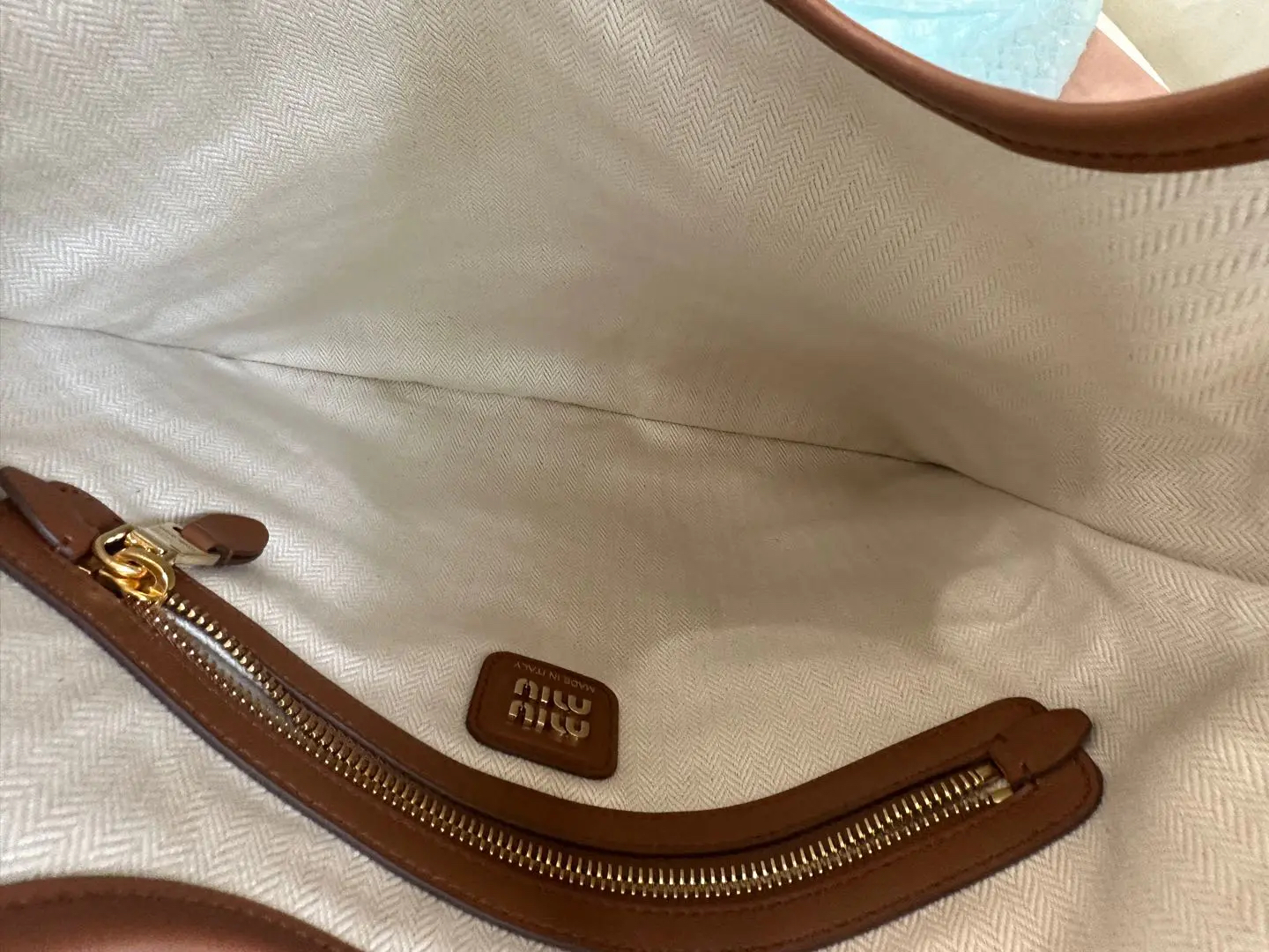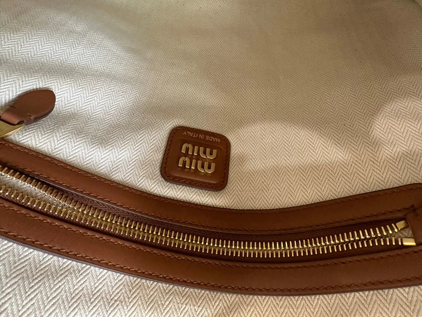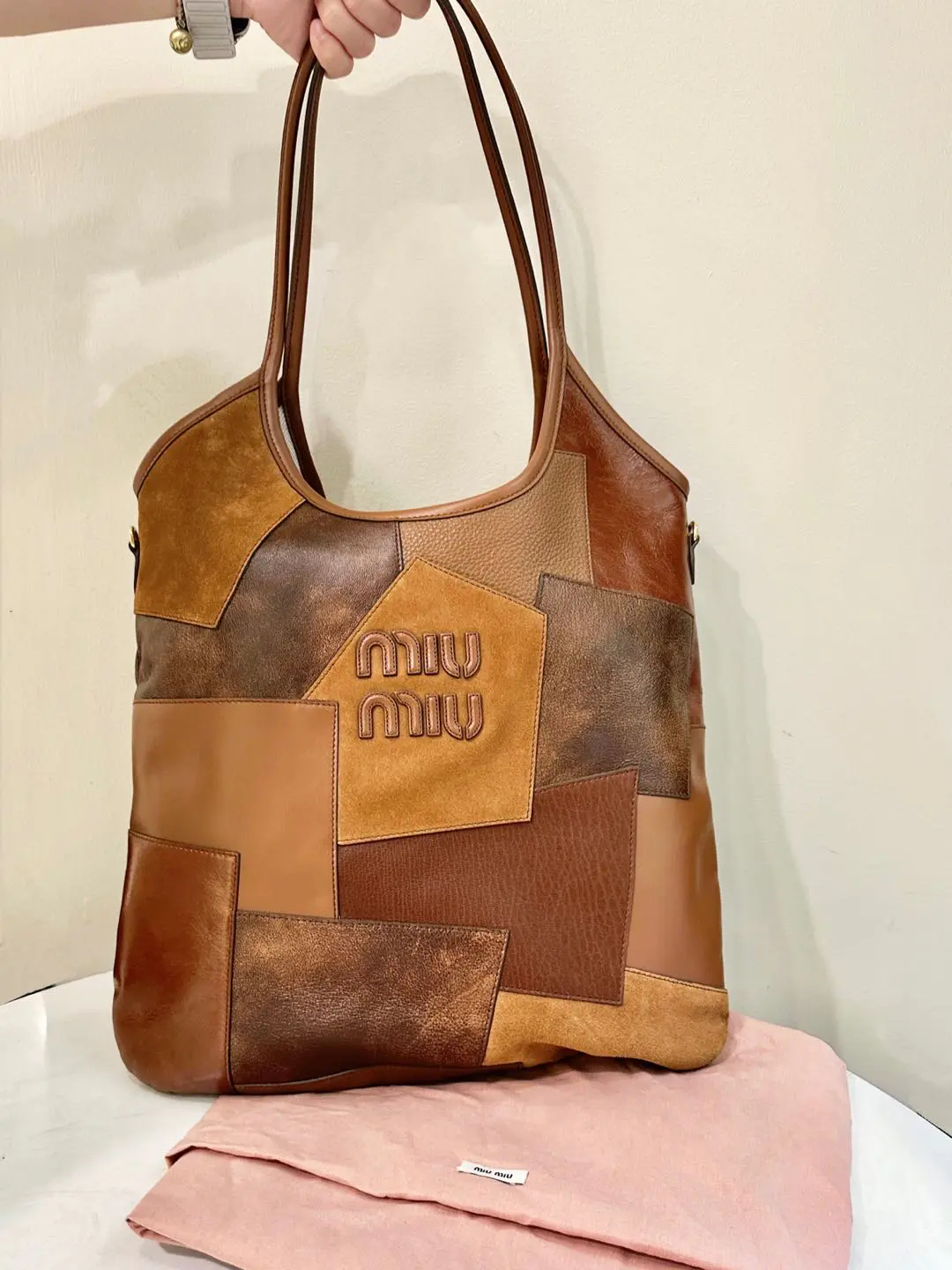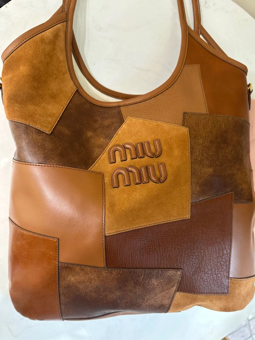 【商品详情】正品二手 缪缪 Ivy皮革拼贴 干邑色 牛皮 单肩包🩷 98新 35×32 配件:卡片 票 防尘袋。今夏复古风