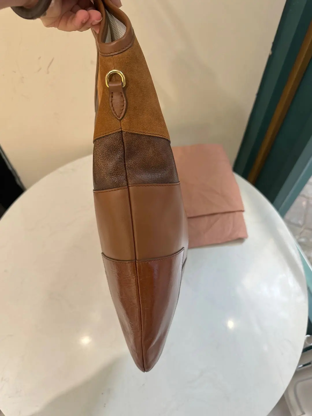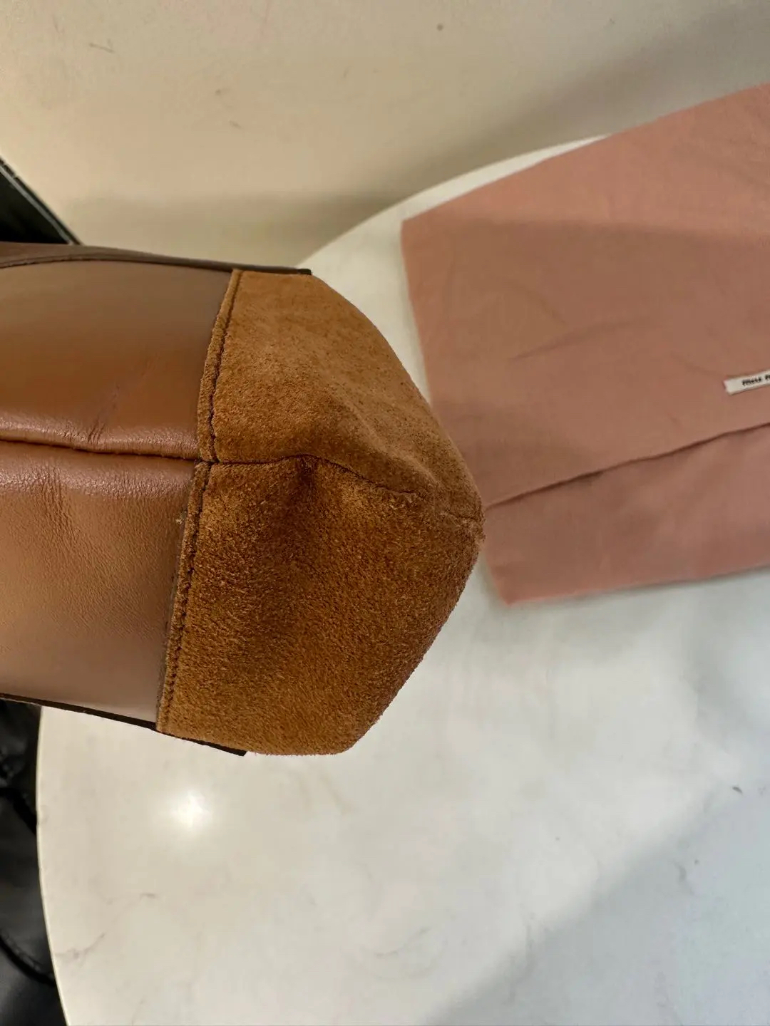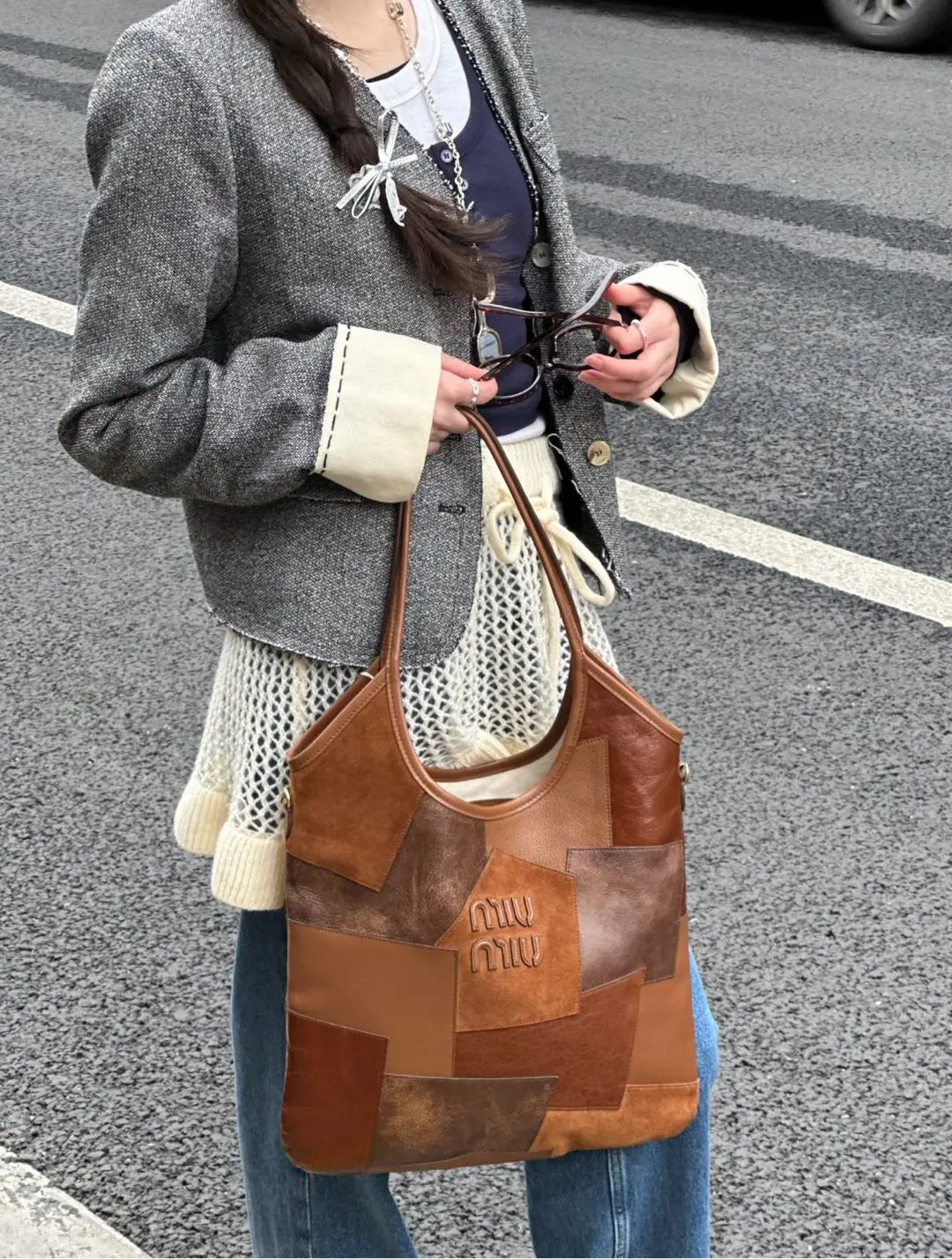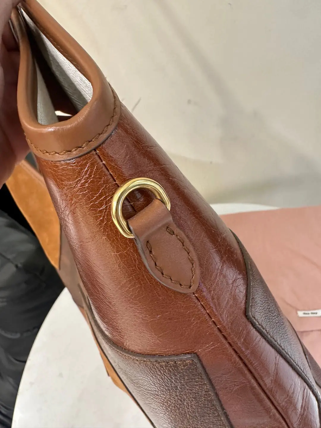 【商品详情】正品二手 缪缪 Ivy皮革拼贴 干邑色 牛皮 单肩包🩷 98新 35×32 配件:卡片 票 防尘袋。今夏复古风