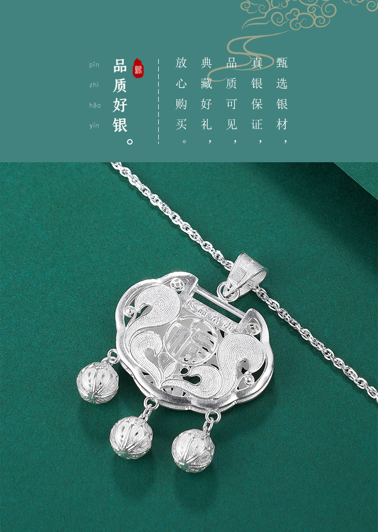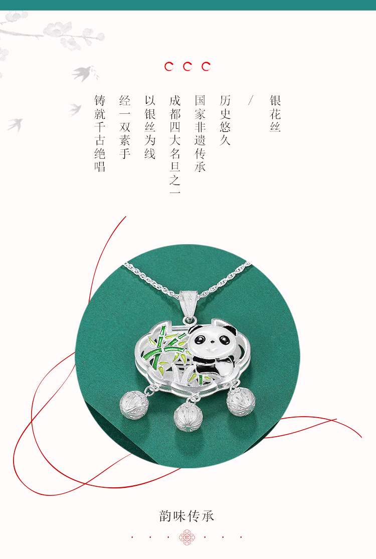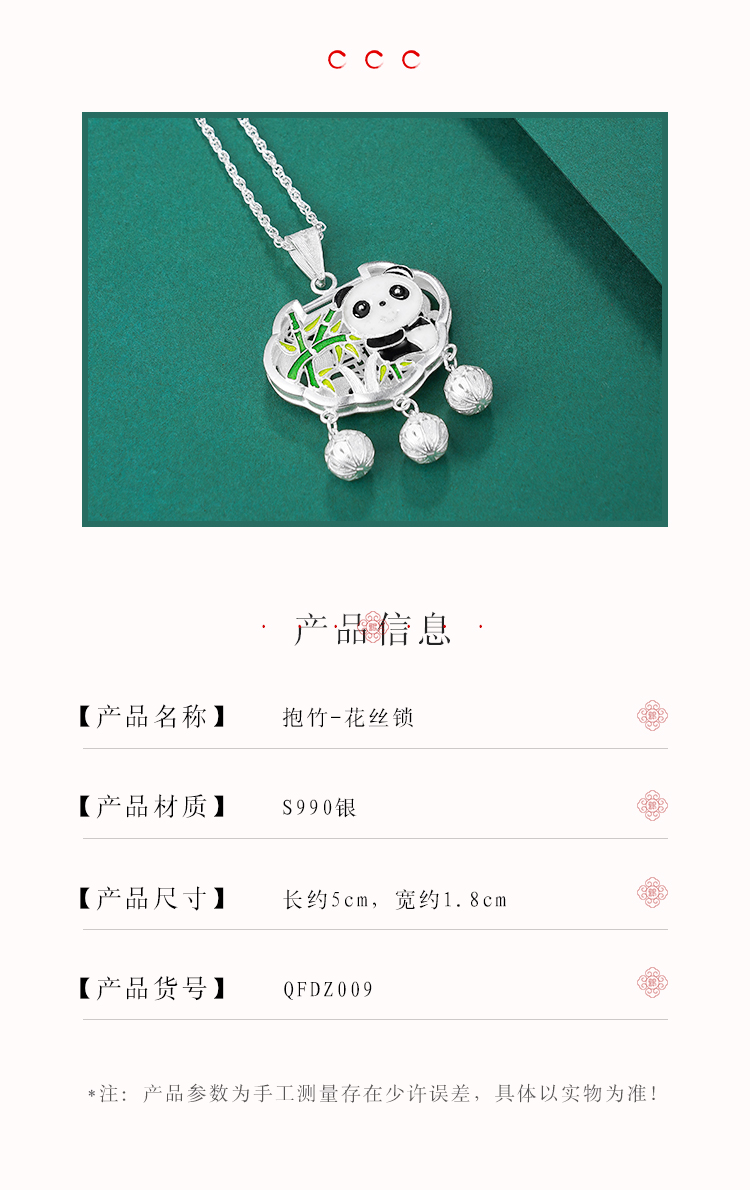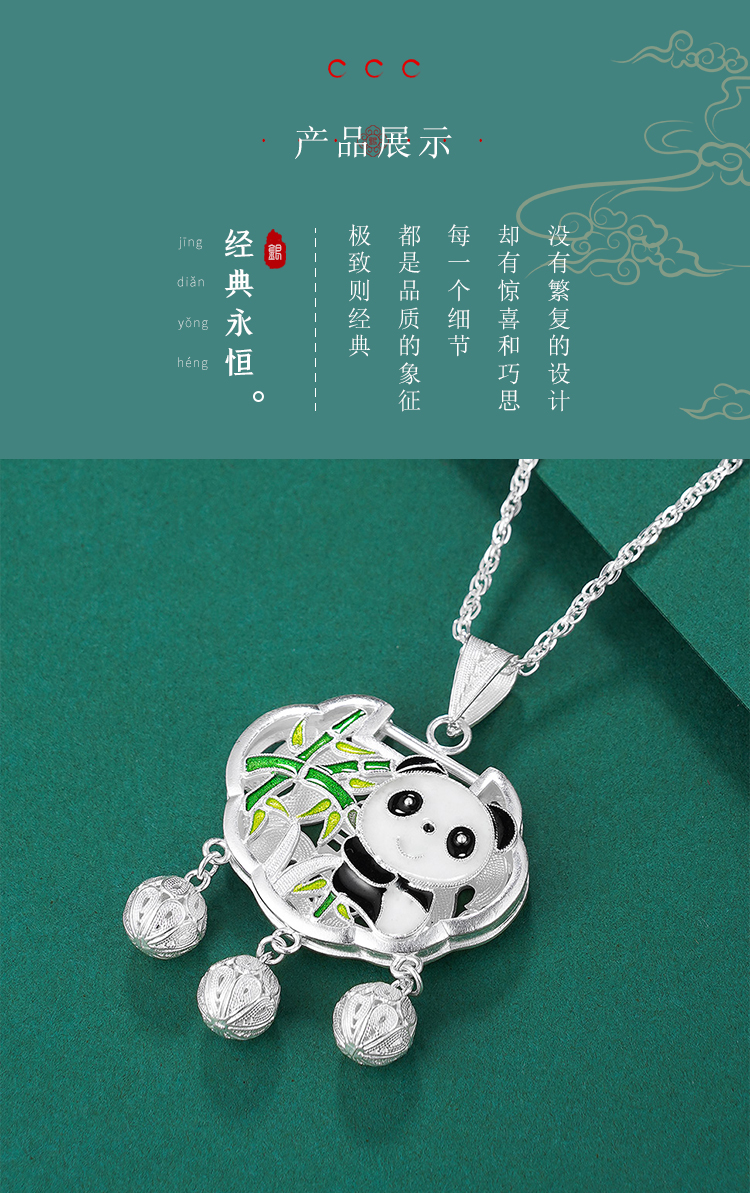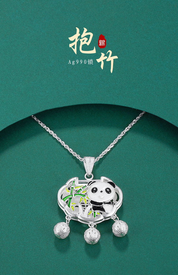 【寓意】:作品以如意锁为造型主体,巧妙融入熊猫与竹元素,将银花丝与景泰蓝工艺精妙糅合打造而成。“福”字点缀,寓意富贵相伴。花丝球坠饰的设计,增添灵动俏皮之感。