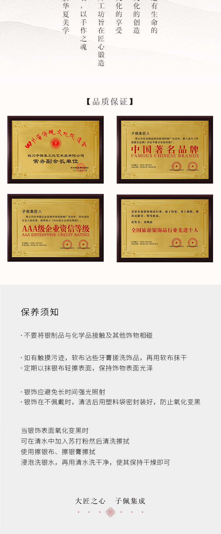 - 国家级非遗项目成都银花丝优秀传承单位 四川工艺美术行业协会副会长单位 四川传统文化促进会常务副会长单位 成都非物质文化遗产保护中心协会会员单位 国货品牌 历史400余年
