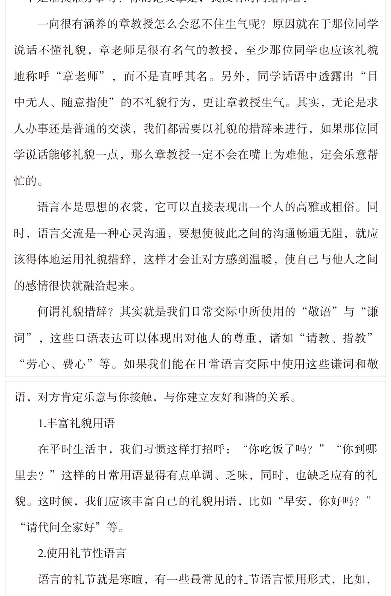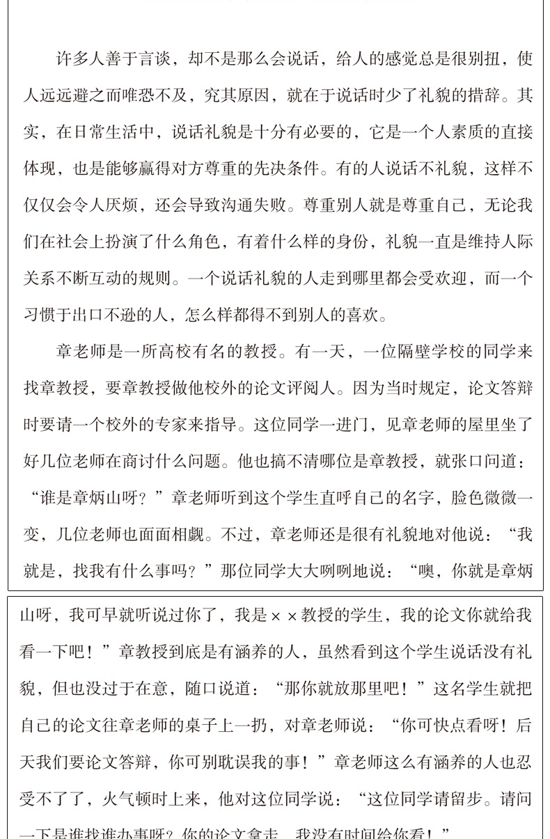 章老师是一所高校有名的教授。有一天,一位隔壁学校的同学来 找章教授,要章教授做他校外的论文评阅人。因为当时规定,论文答辩 时要请一个校外的专家来指导。这位同学一进门,见章老师的屋里坐了 好几位老师在商讨什么问题。他也搞不清哪位是章教授,就张口问道: “谁是章炳山呀?”章老师听到这个学生直呼自己的名字,脸色微微一 变,几位老师也面面相觑。不过,章老师还是很有礼貌地对他说:“我 就是,找我有什么事吗?”那位同学大大咧咧地说:“噢,你就是章炳山呀,我可早就听说过你了,我是××教授的学生,我的论文你就给我 看一下吧!”章教授到底是有涵养的人,虽然看到这个学生说话没有礼 貌,但也没过于在意,随口说道:“那你就放那里吧!”这名学生就把 自己的论文往章老师的桌子上一扔,对章老师说:“你可快点看呀!后 天我们要论文答辩,你可别耽误我的事!”章老师这么有涵养的人也忍 受不了了,火气顿时上来,他对这位同学说:“这位同学请留步。请问 一下是谁找谁办事呀?你的论文拿走,我没有时间给你看!” 一向很有涵养 的 章 教 授 怎 么 会 忍 不 住 生 气 呢 ? 原 因 就 在 于 那 位 同 学 说话不懂礼貌,章老师是很有名气的教授,至少那位同学也应该礼貌 地称呼“章老师”,而不是直呼其名。另外,同学话语中透露出“目 中 无 人 、 随 意指使”的不礼貌行为,更让章教授生气。其实,无论是求 人办事还是普通的交谈,我们都需要以礼貌的措辞来进行,如果那位同 学说话能够礼貌 一 点 , 那 么 章 教 授 一 定 不 会 在 嘴 上 为 难 他 ,定会乐意帮 忙的。