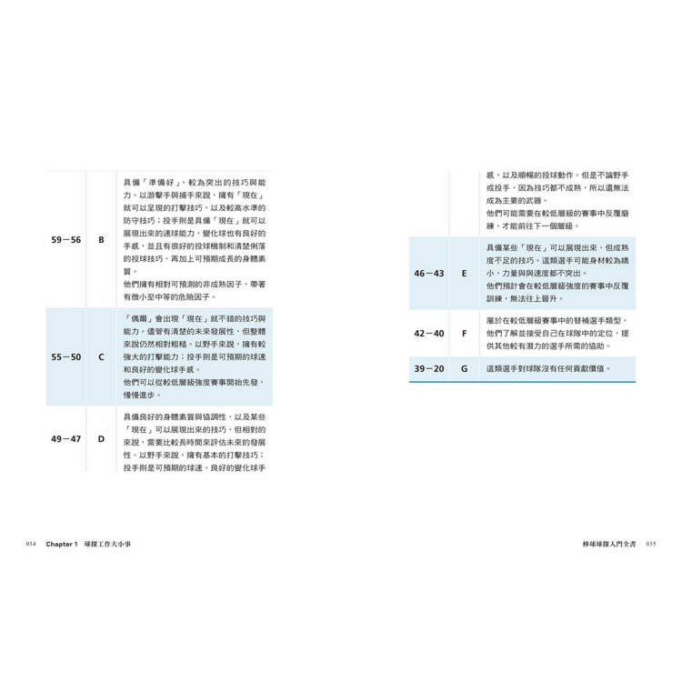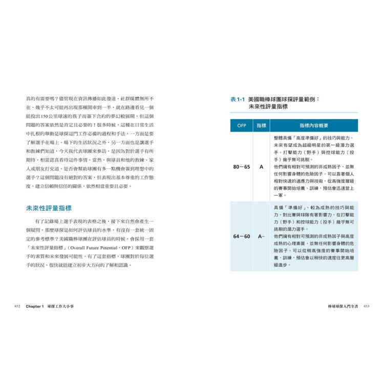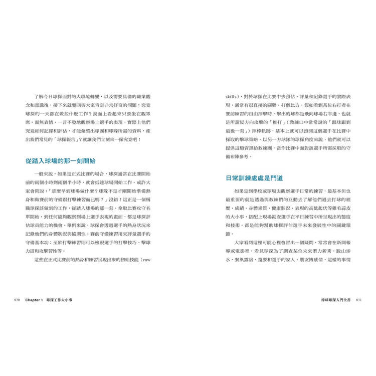 本書由神龍見首不見尾的球探現身說法,親自揭曉百年前美國大聯盟草創時期就誕生的球探,經歷了選秀制度的革新,以及近年來數據革命的衝擊,如何轉變為集傳統眼光與現代科技於一身的棒球專業人員?靠著選手的揮棒軌跡、守備腳步、心理素質等細節,怎麼分析出準確的球員實力和潛能?球團底下有多少球探部門,跟選手「搏感情」又有什麼用?以及令人好奇的問題,究竟怎樣才能成為一名球探,讓我們一同探索這個神祕莫測的棒球領域!