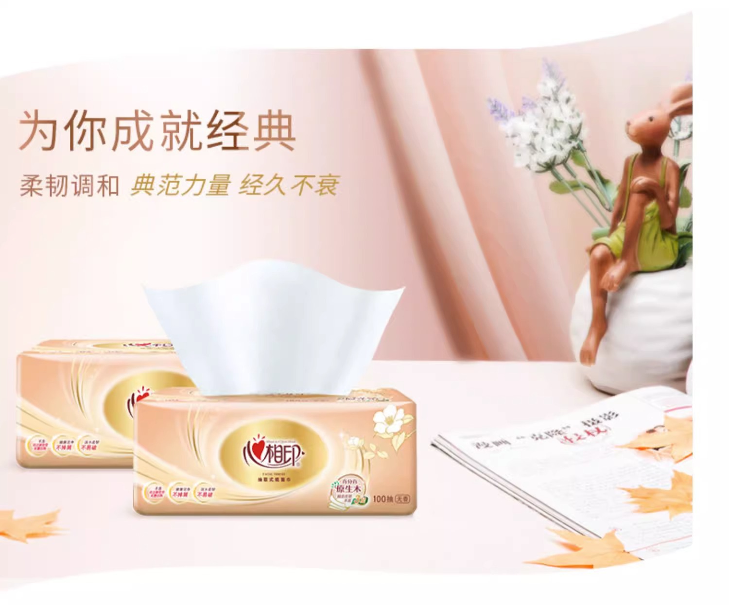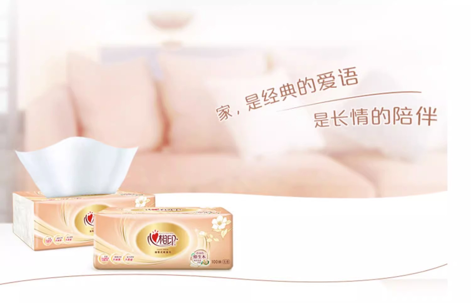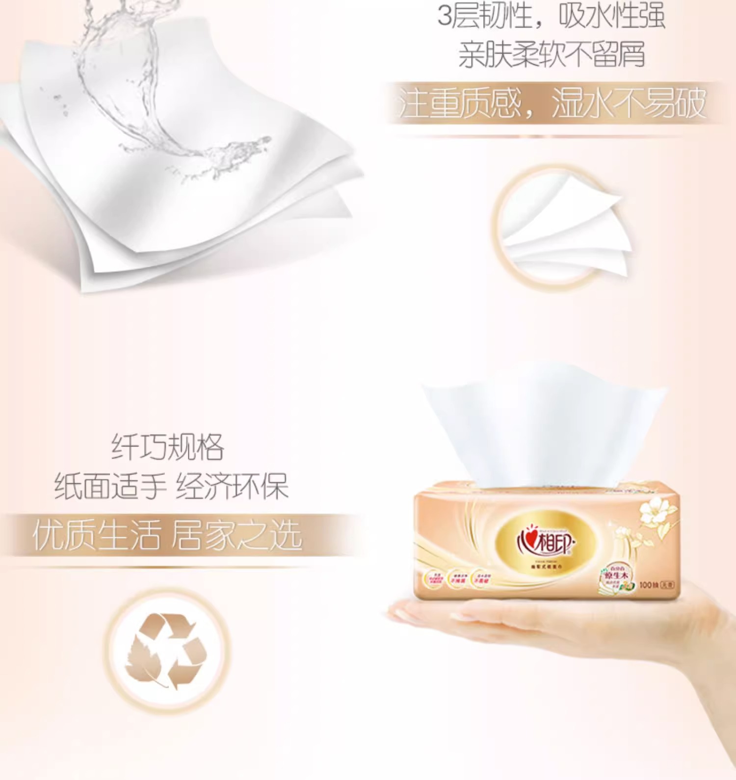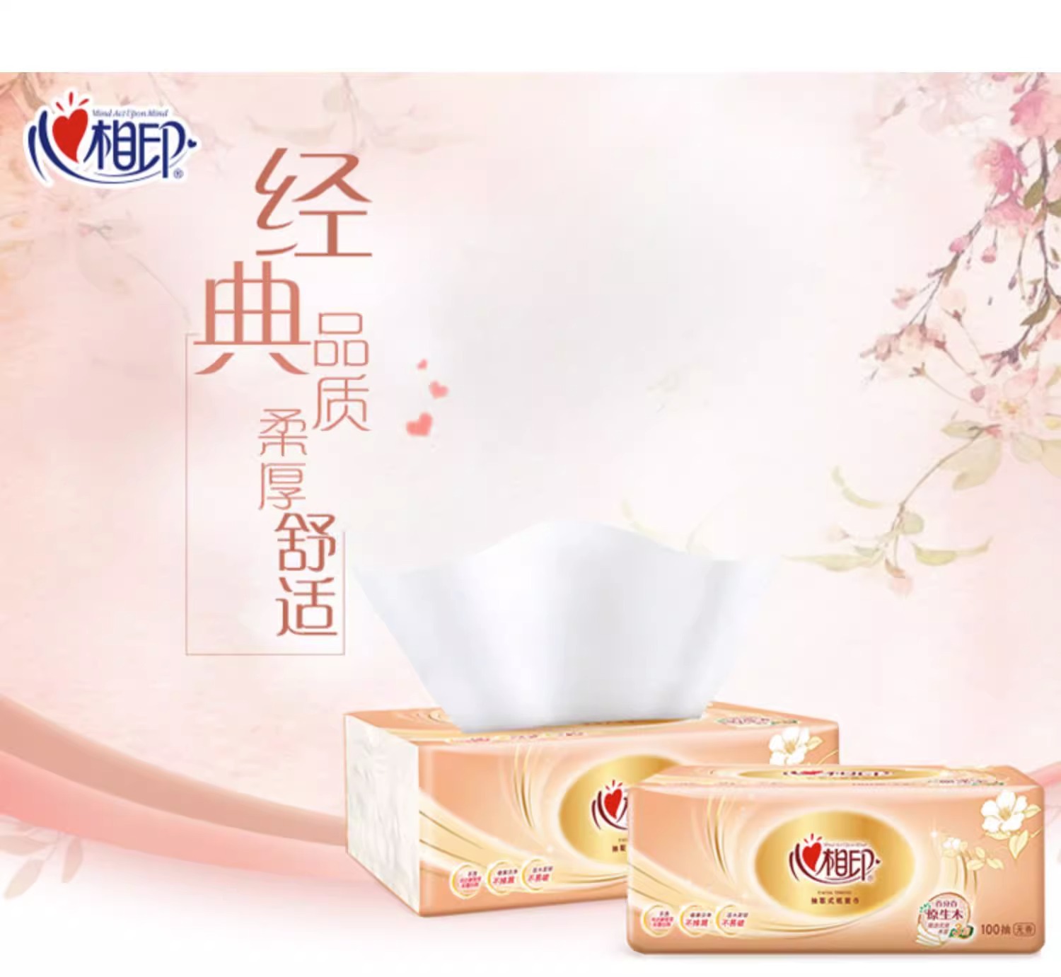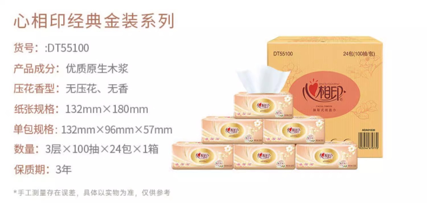 【原生木浆❗湿水不易破】心相印金装经典抽纸100抽三层纸面巾餐巾纸家用纸软包装。rh