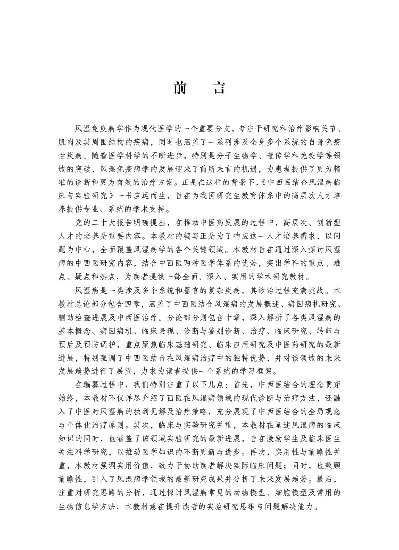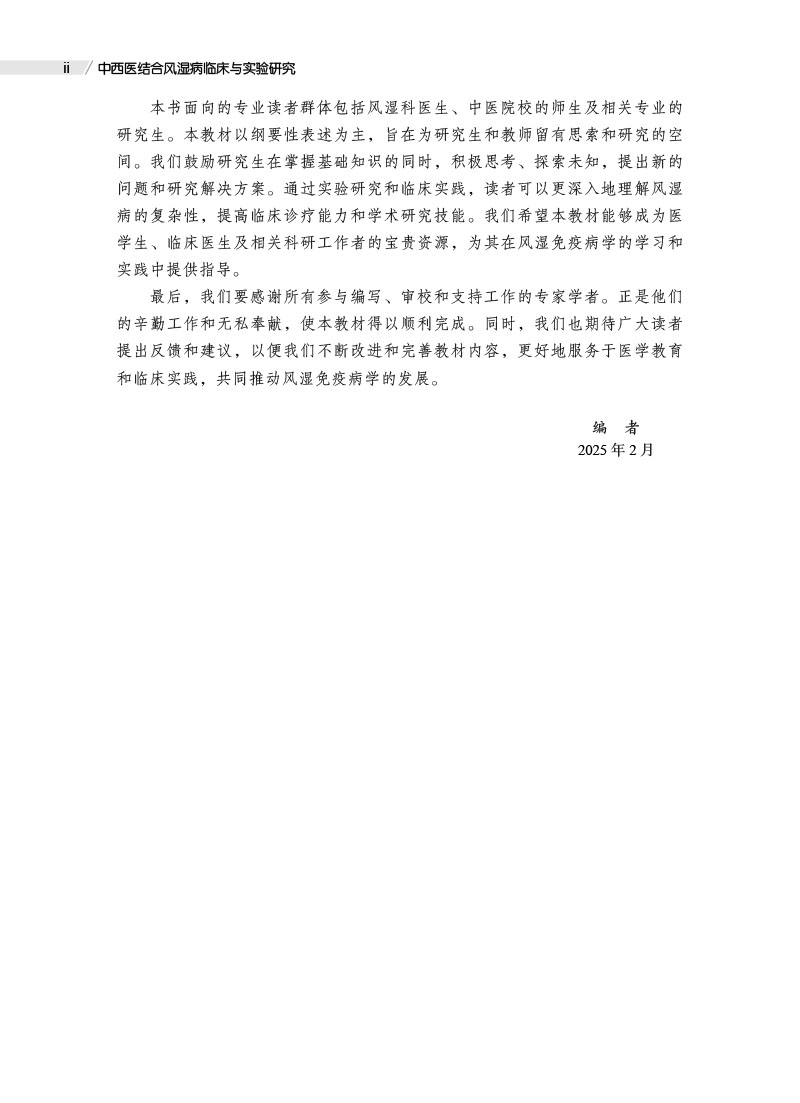 本书是一本专为中医药、中西医结合专业研究生编写的教材,论述中医与西医在风湿病领域的理论、临床实践及实验研究成果,旨在培养高层次的研究型医学人才,为读者提供一个全面、深入理解风湿性疾病的机会。本书以中医辨证论治为主导,结合西医的先进诊断治疗技术,全面介绍了风湿性疾病的中西医临床与实验研究的成果。全书分为总论、分论两部分,总论共四章,分别为中西医结合风湿病发展概述、风湿病中西医病因病机研究、风湿病中西医辅助检查进展及风湿病中西医治疗。分论共十章,系统阐述了各风湿病的概说、病因病机、临床表现、诊断与鉴别诊断、治疗、临床研究、转归与预后、预防调护等,重点聚焦于临床基础研究、临床应用研究及中医药研究的最新进展,强调中西医结合在风湿病治疗中的优势,并展望了该领域未来的发展前景。教材不仅注重理论知识的传授,还强调临床实际应用的培养,通过实验研究等内容,增强了教材的实用性和操作性。此外,书中还融入了最新的研究成果,反映了风湿病领域的最新进展,对于提高风湿病的诊疗水平具有重要的指导意义。