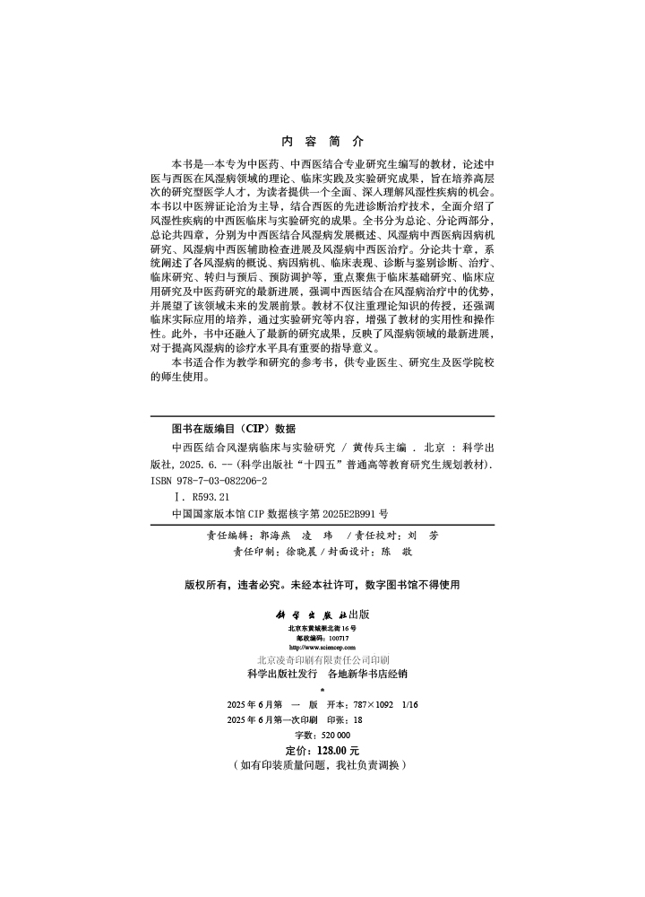 中西医结合风湿病临床与实验研究 十四五普通高等教育研究生规划教材 黄传兵 主编 适用中医学 中西医结合临床医学 科学出版社