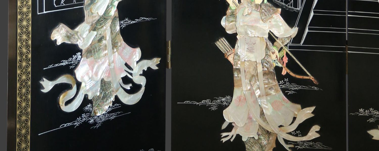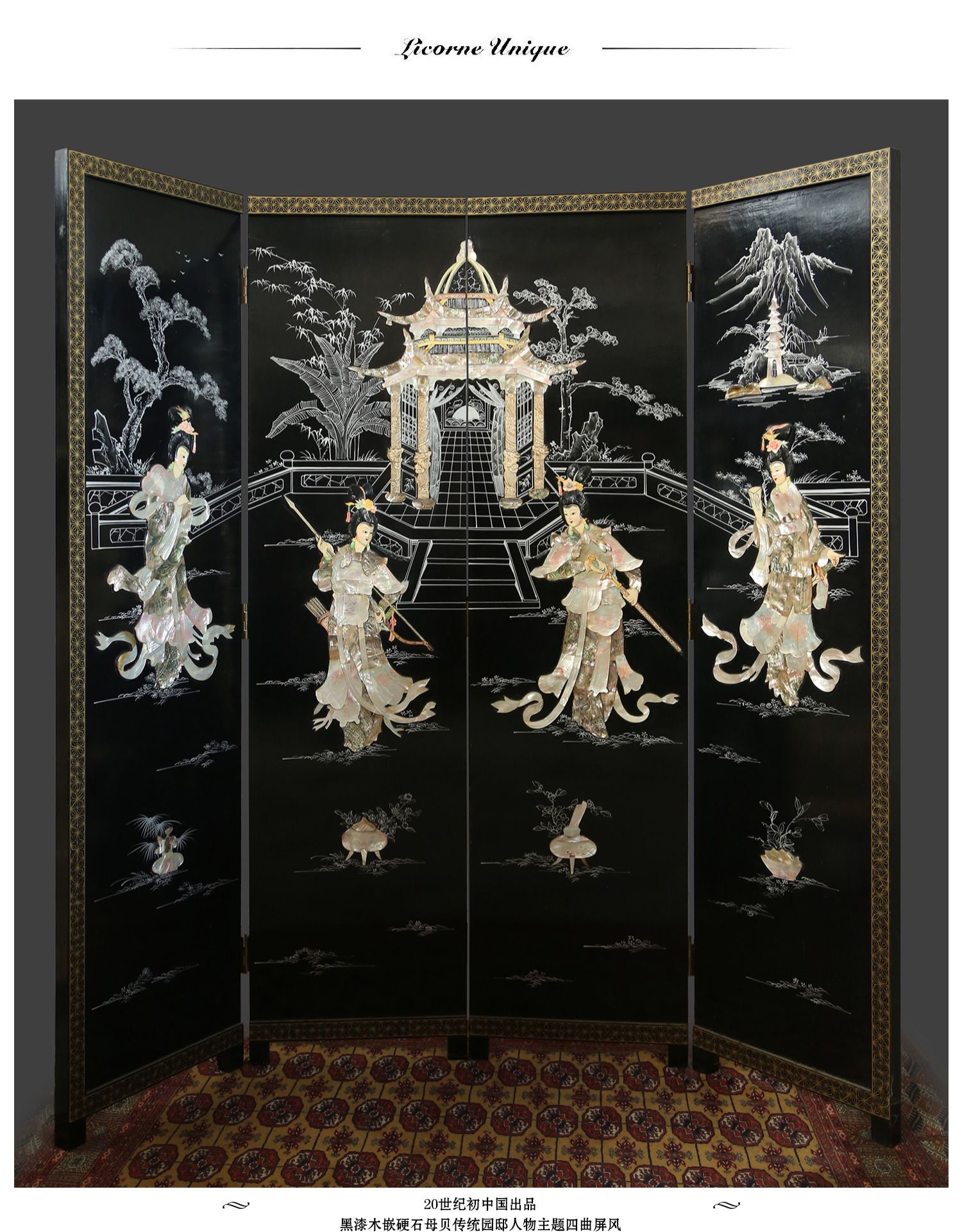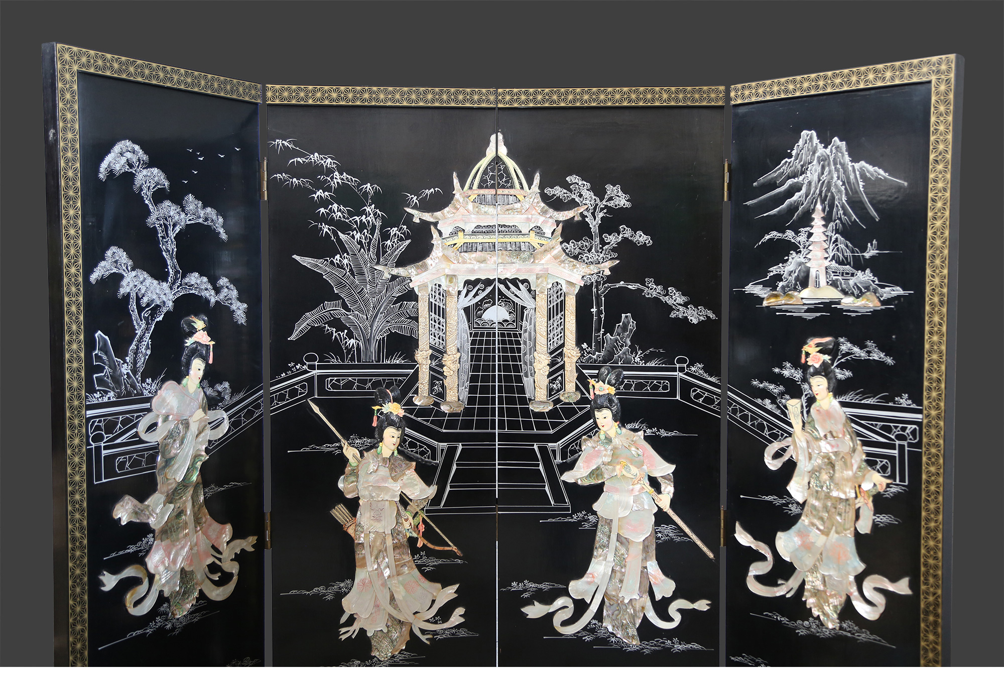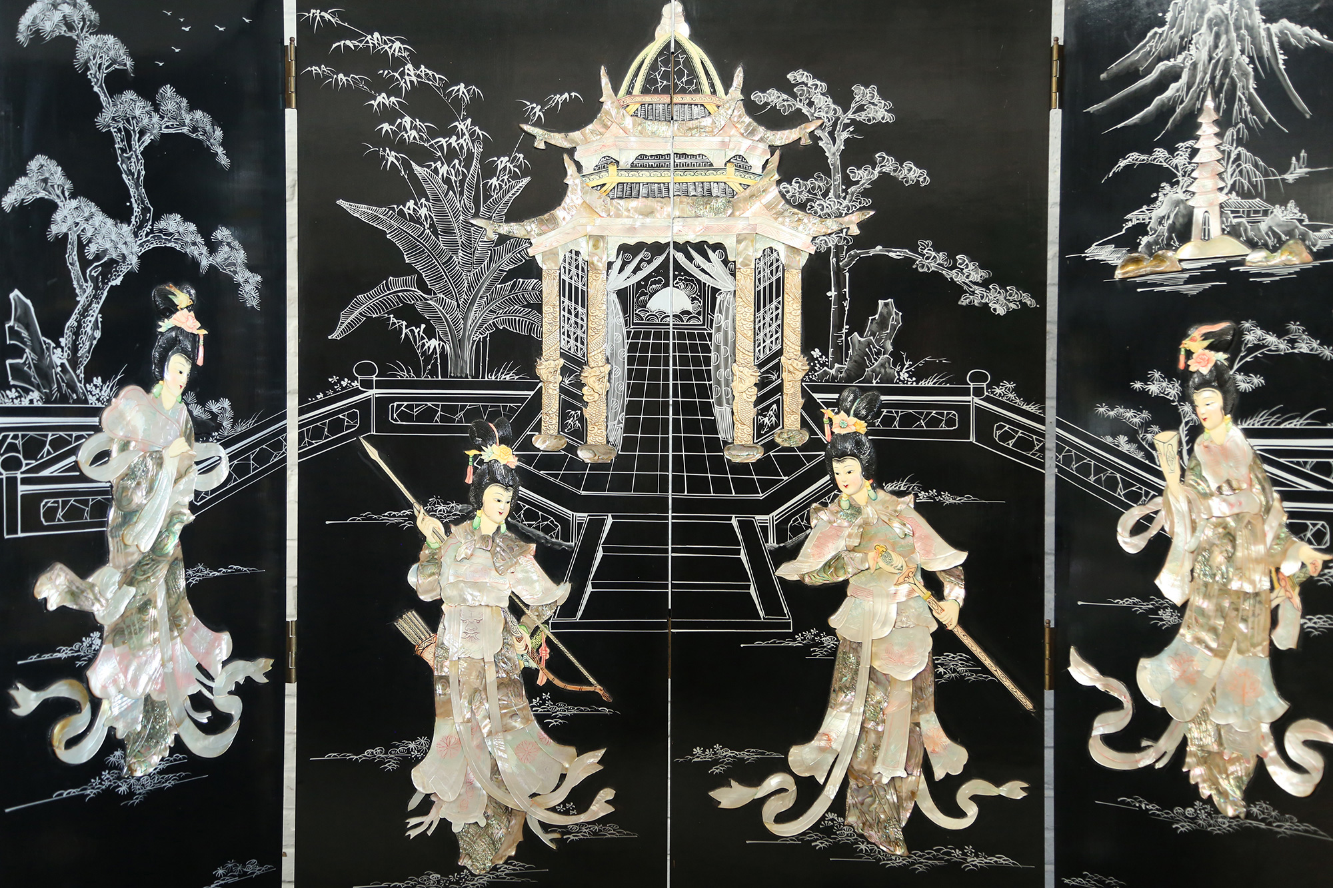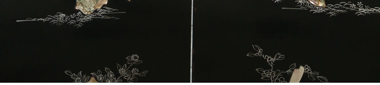 独角鹿西洋古董中国黑漆木嵌硬石母贝传统园邸人物主题四曲屏风