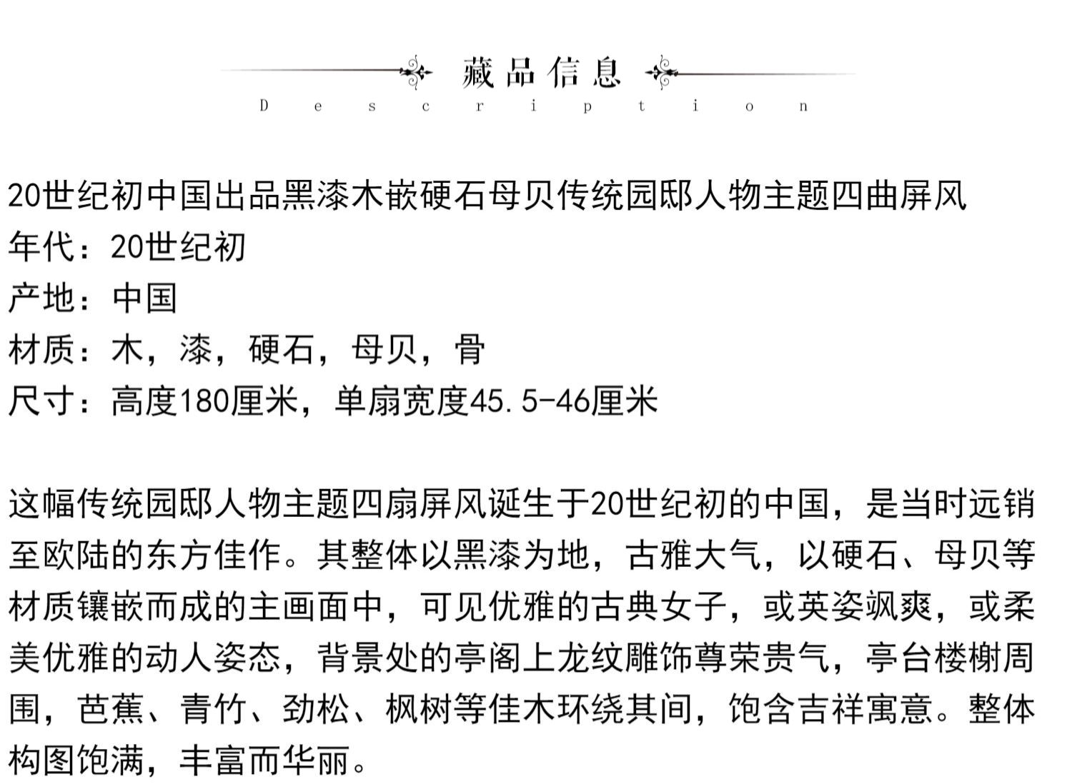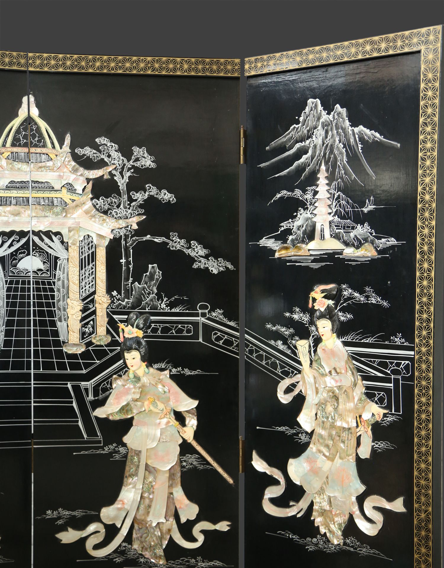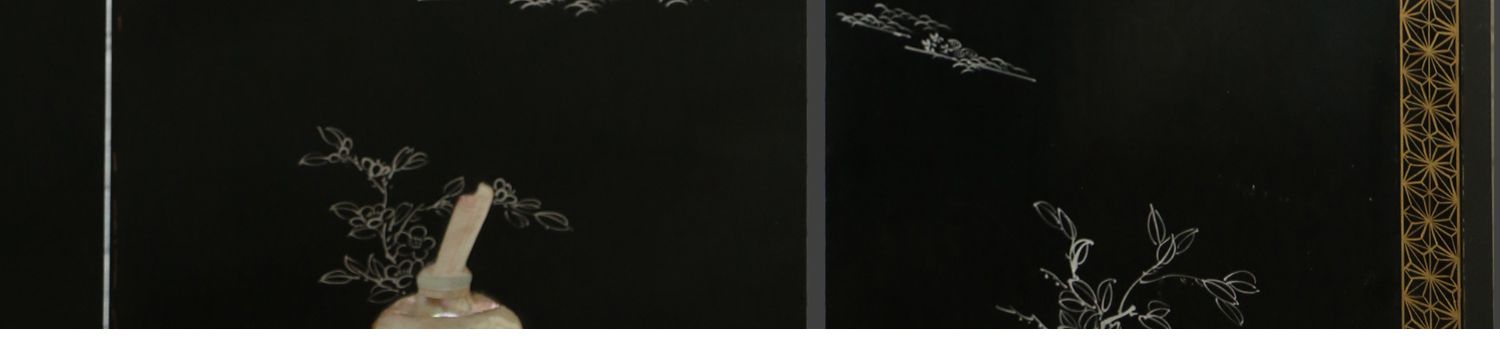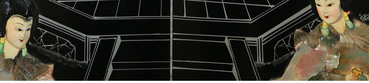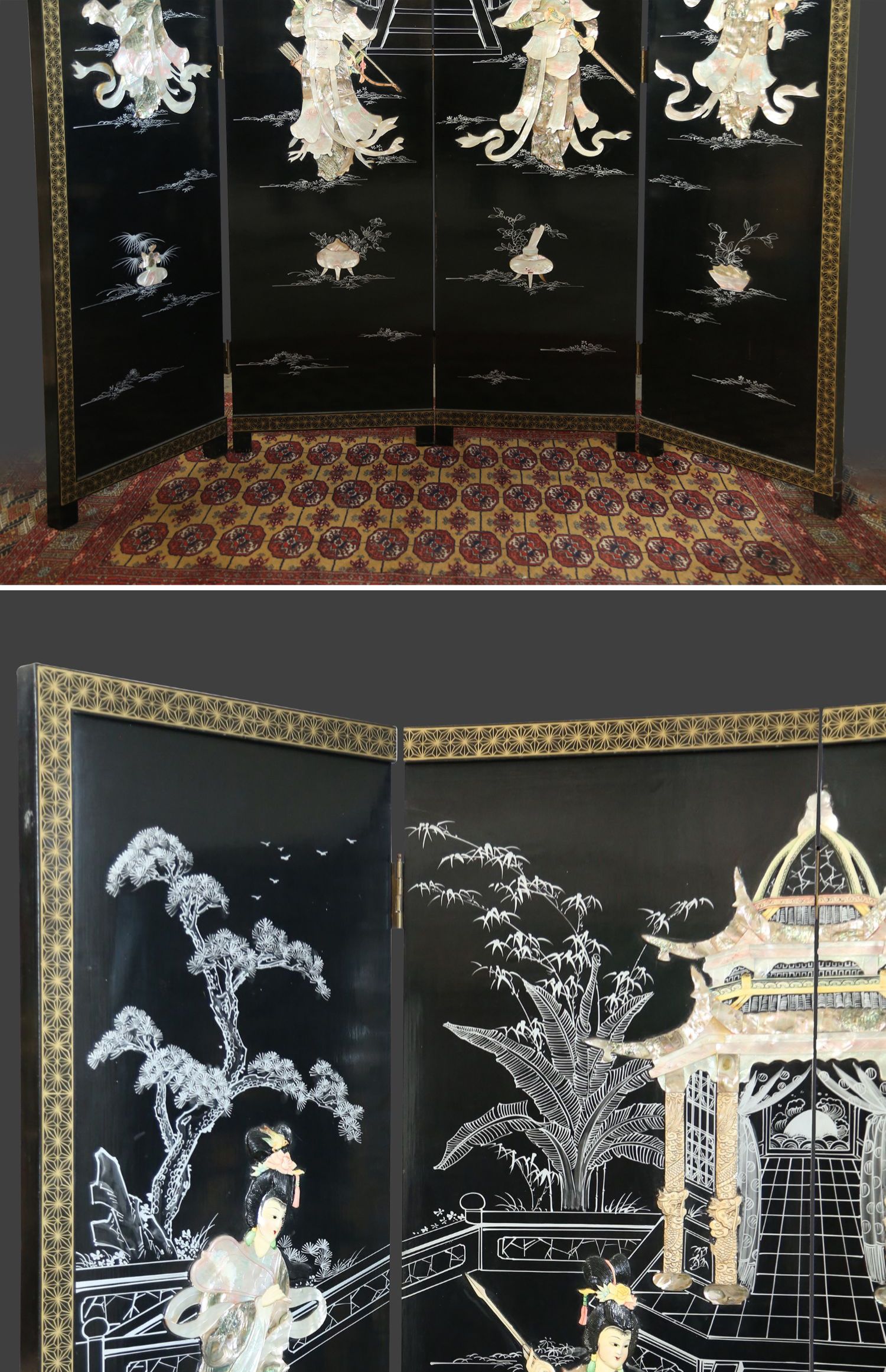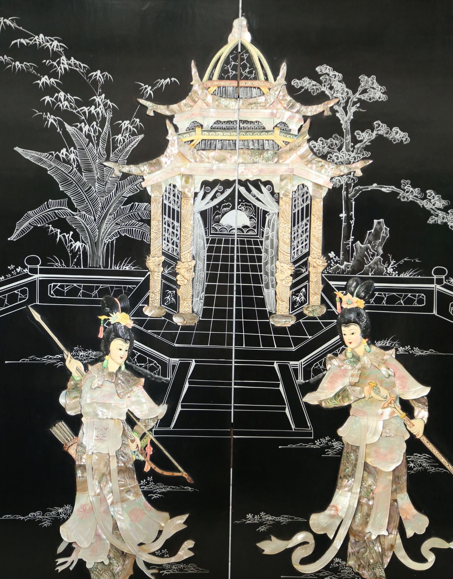 独角鹿西洋古董中国黑漆木嵌硬石母贝传统园邸人物主题四曲屏风