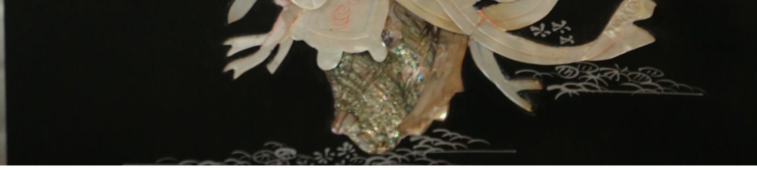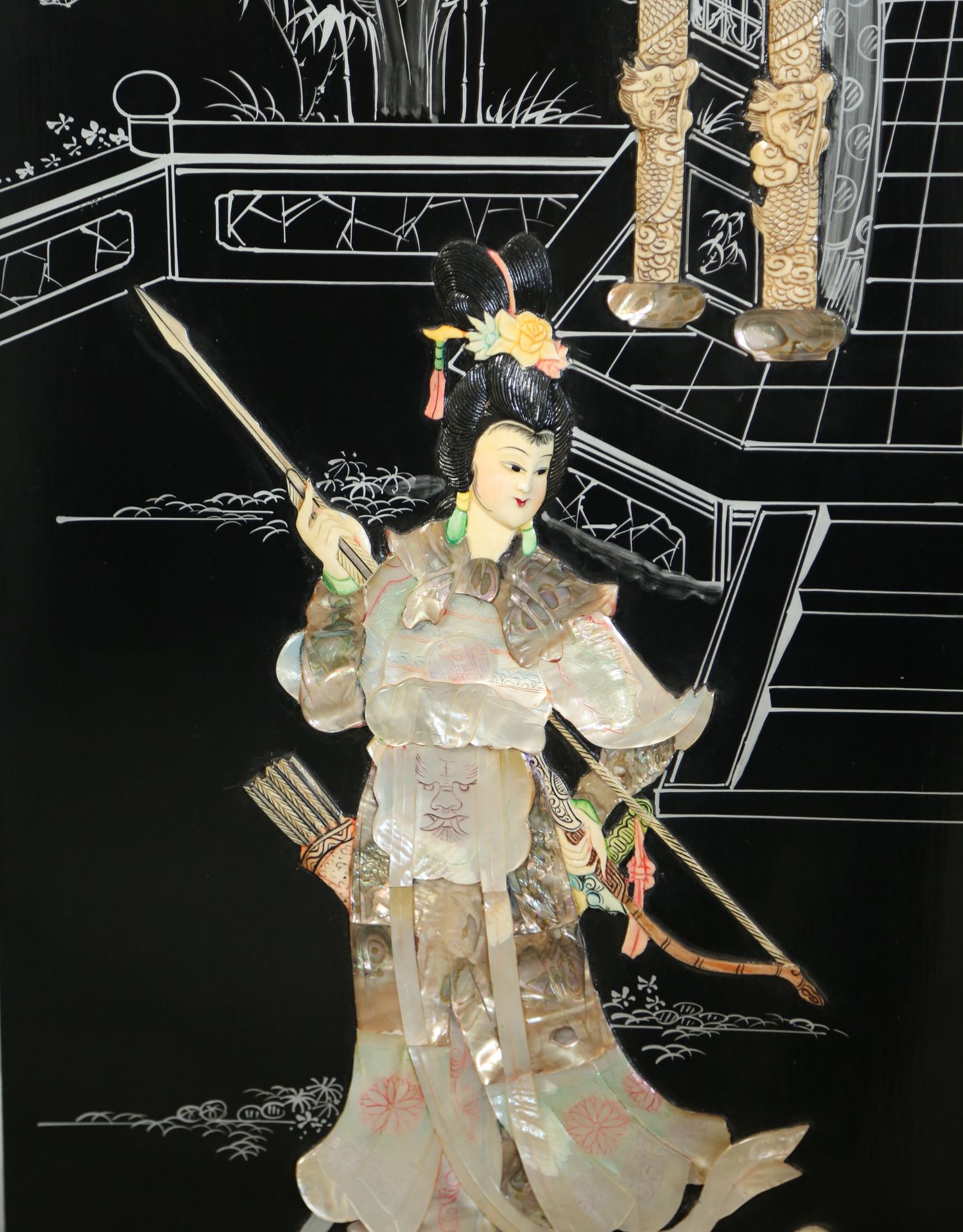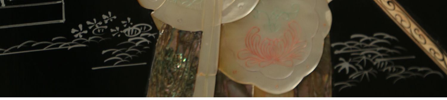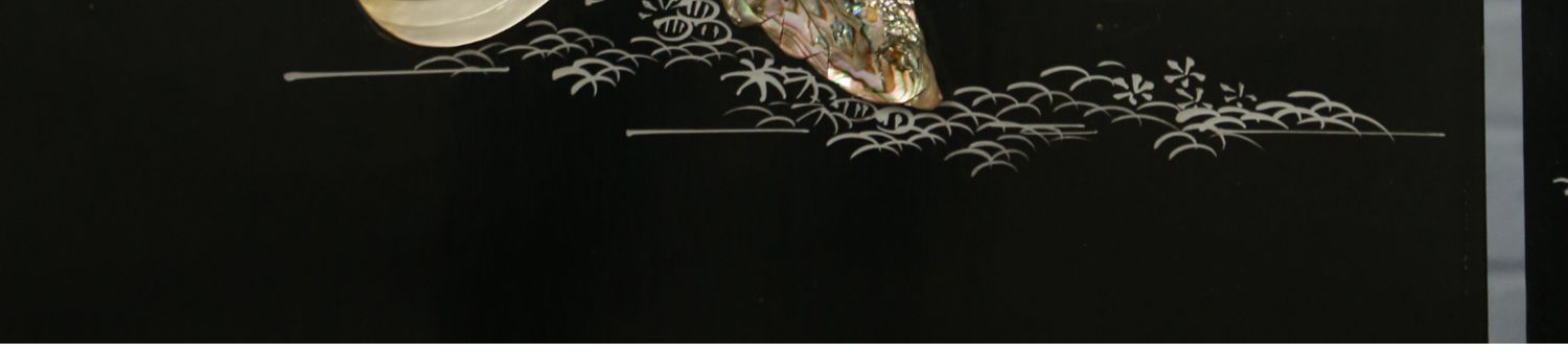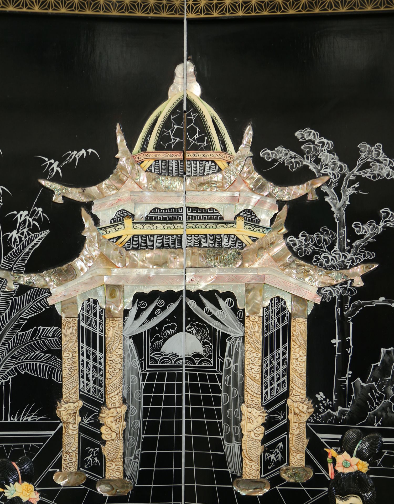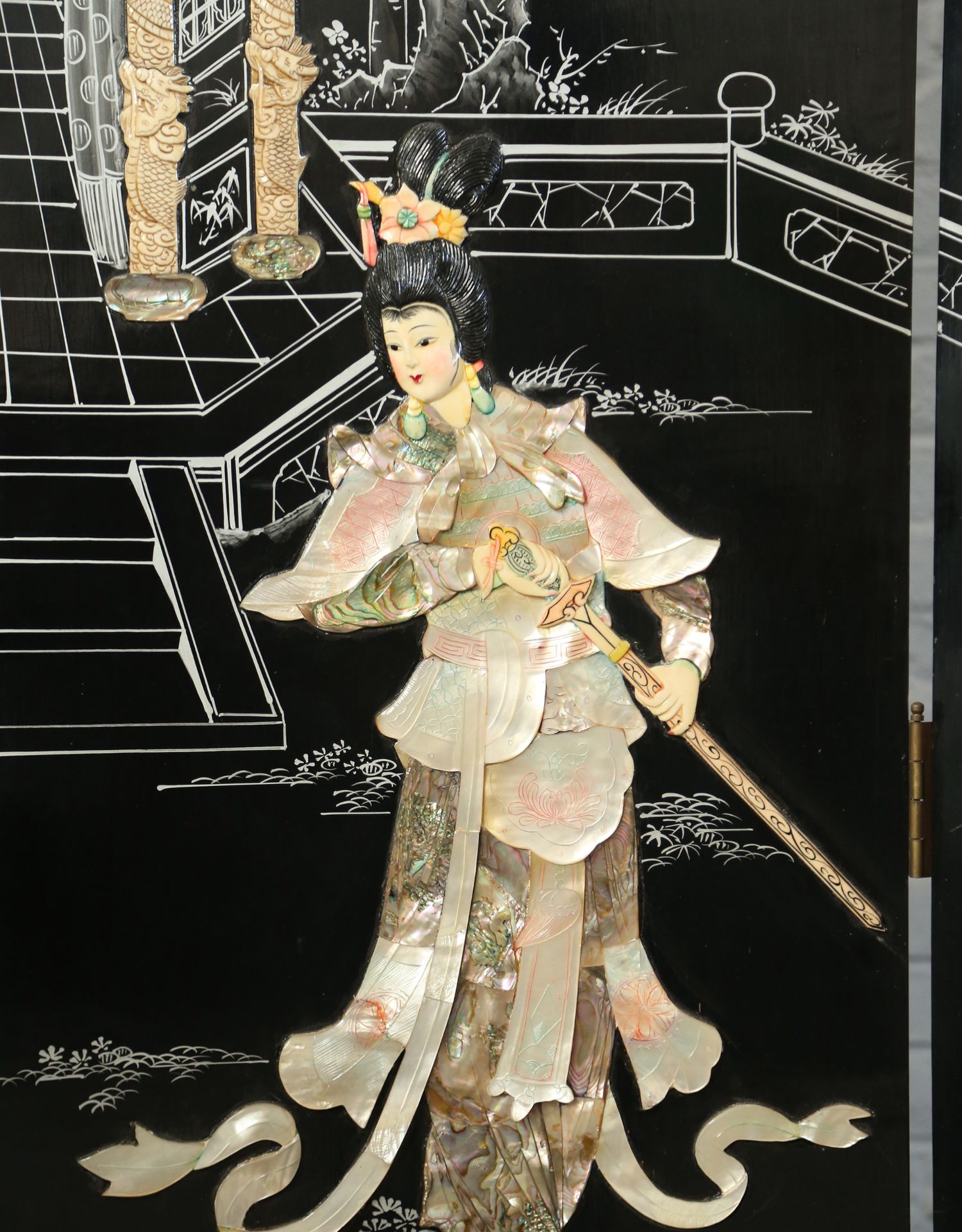 独角鹿西洋古董中国黑漆木嵌硬石母贝传统园邸人物主题四曲屏风