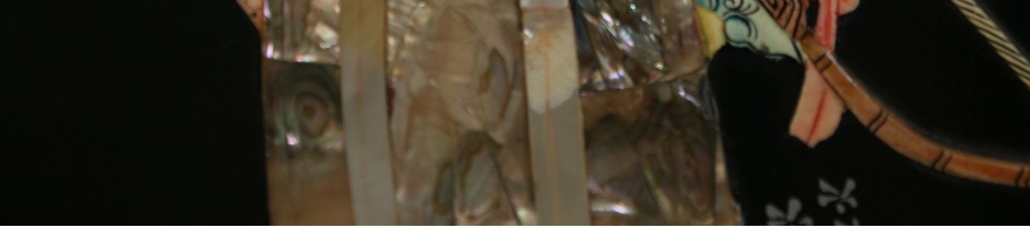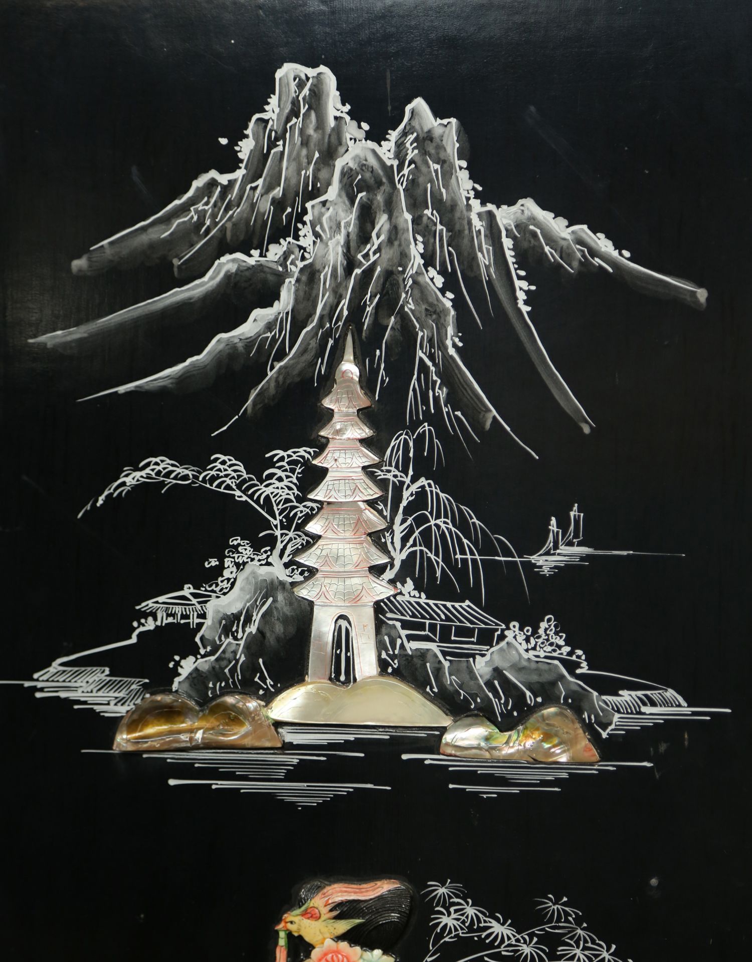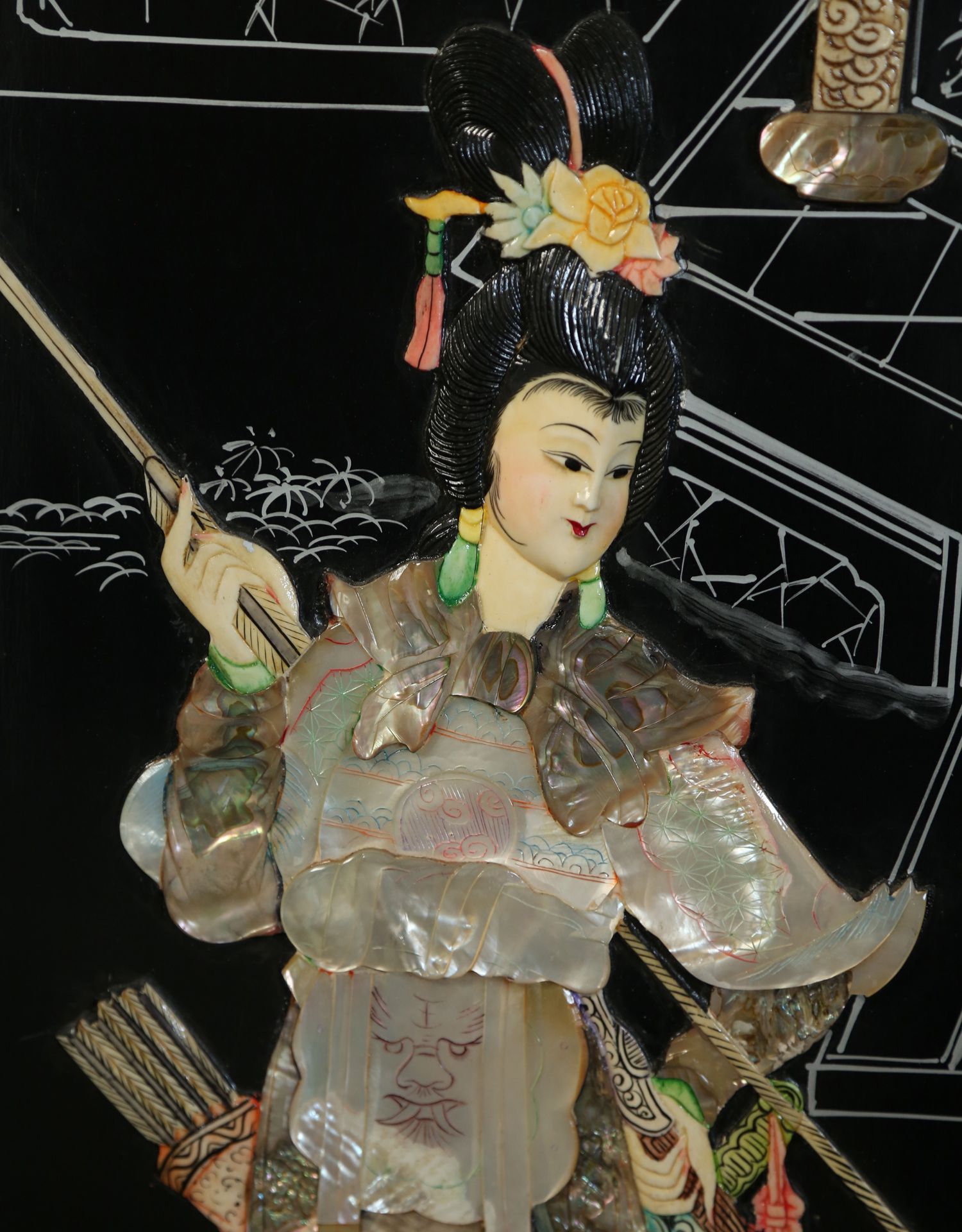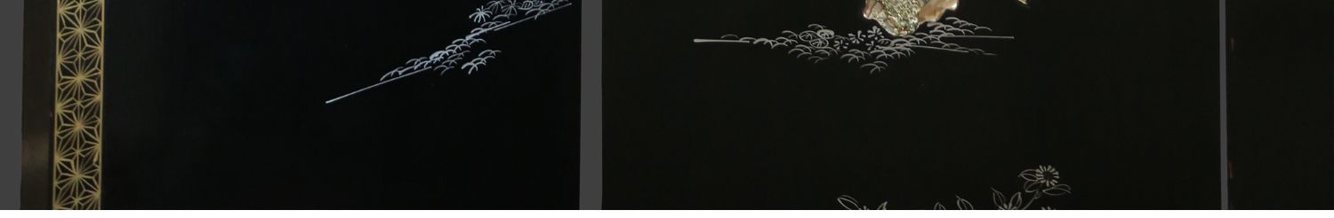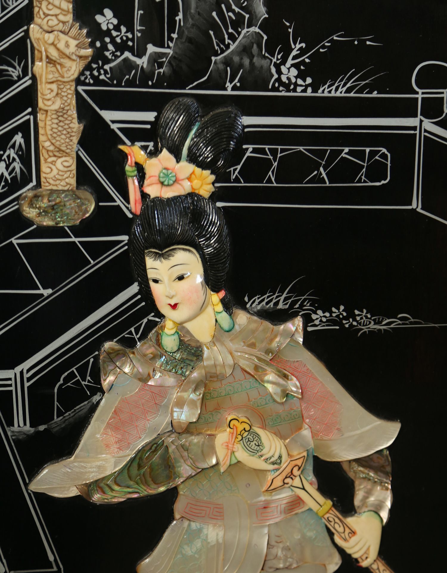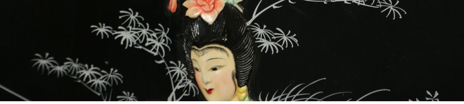 独角鹿西洋古董中国黑漆木嵌硬石母贝传统园邸人物主题四曲屏风