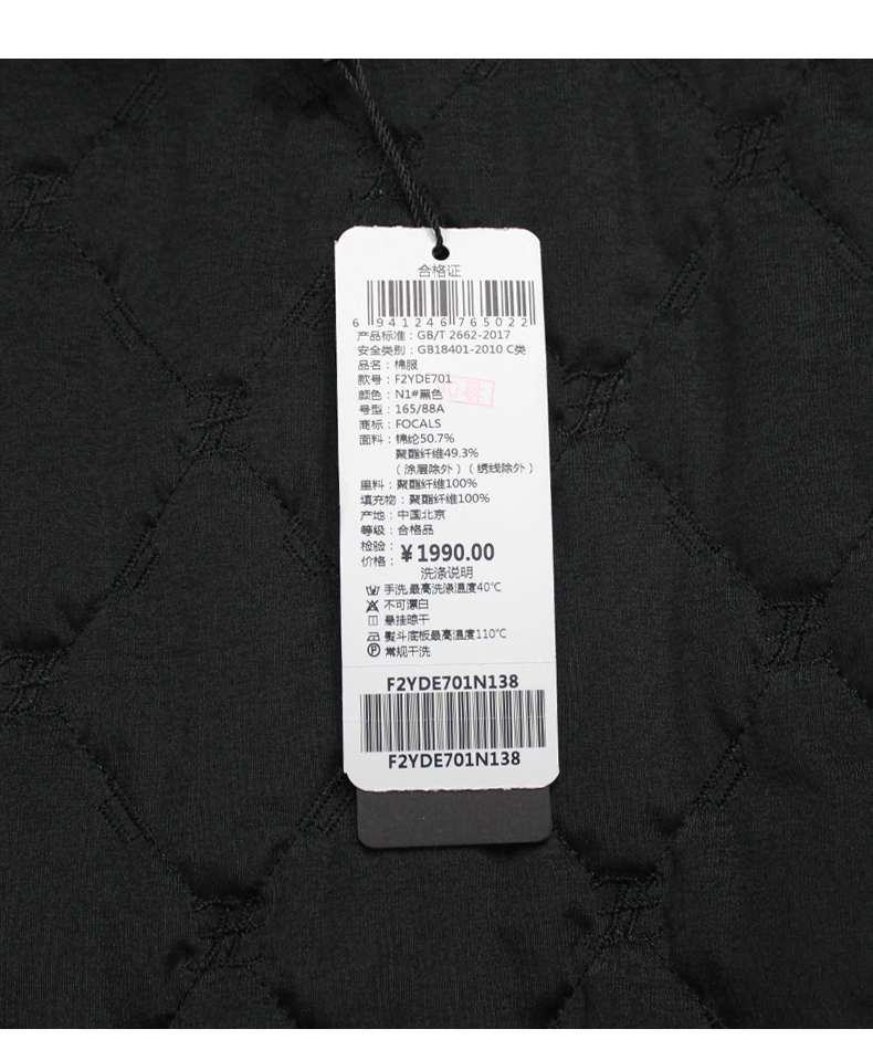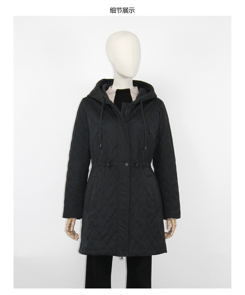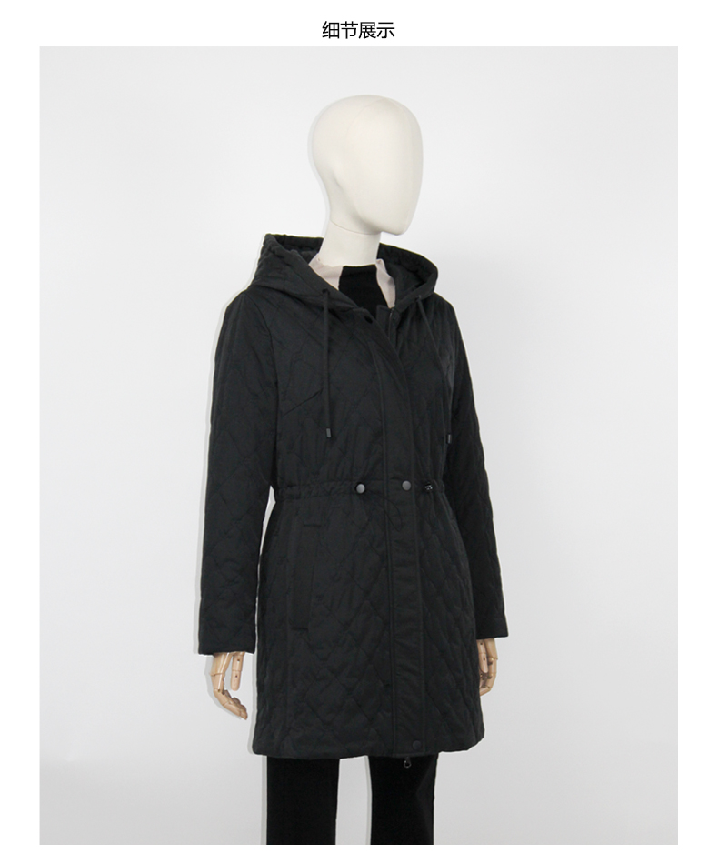 FOCALS福柯斯新款刺绣菱格宽薄棉服中长款连帽棉服F2YDE701N1