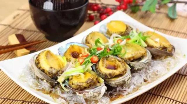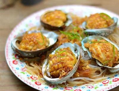 4.粉丝泡软铺在盘底,鲍鱼放回壳里,蒜蓉酱淋在鲍鱼上,再淋一些在粉丝上