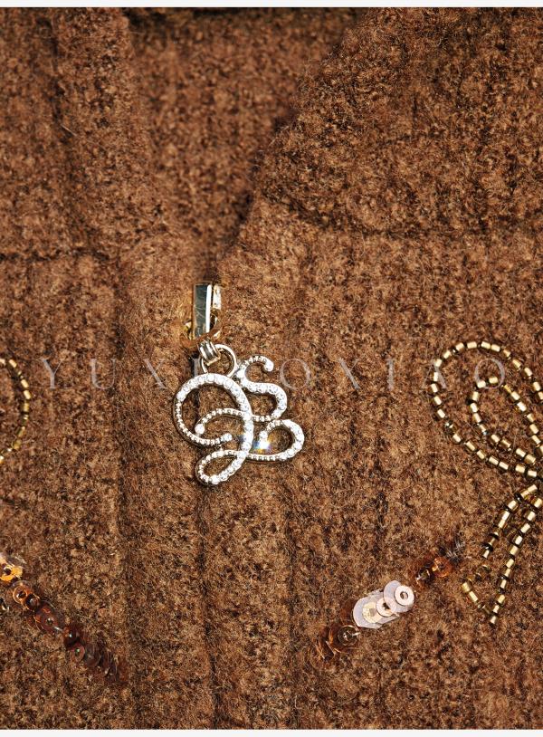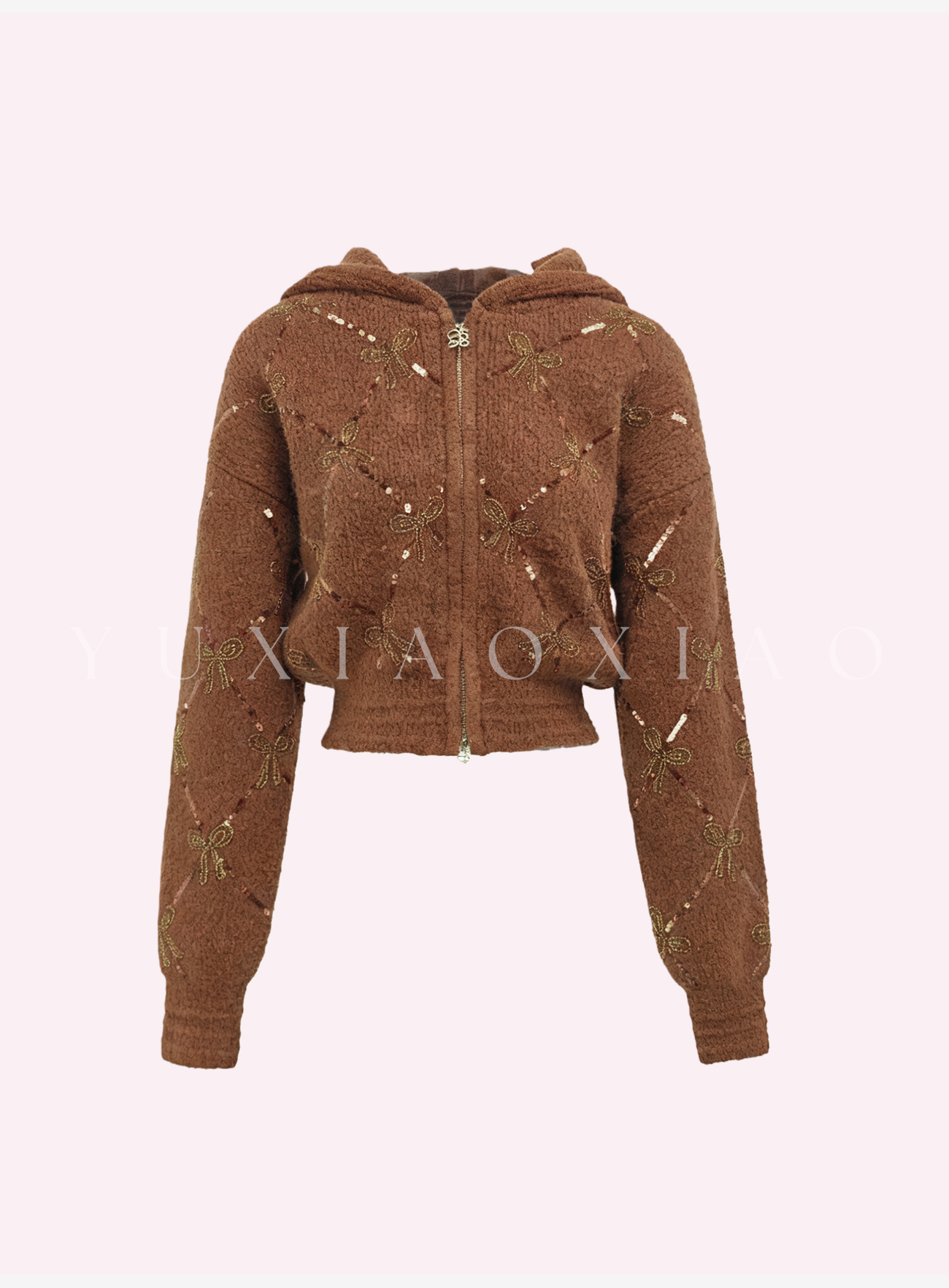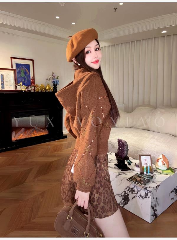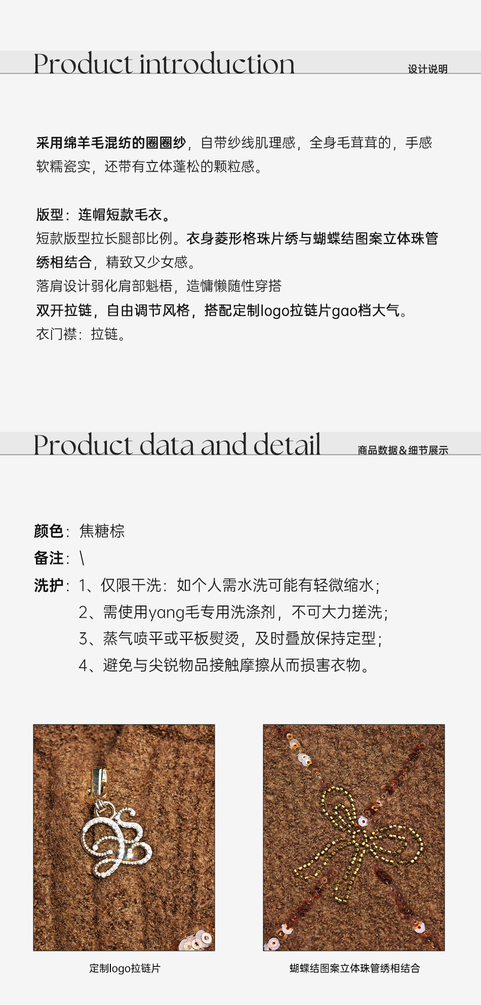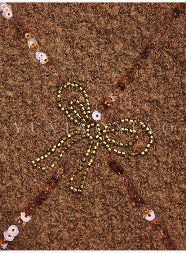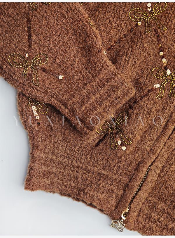 余潇潇【焦糖可露丽】绵羊毛混纺菱格珠片刺绣蝴蝶结连帽毛衣外套