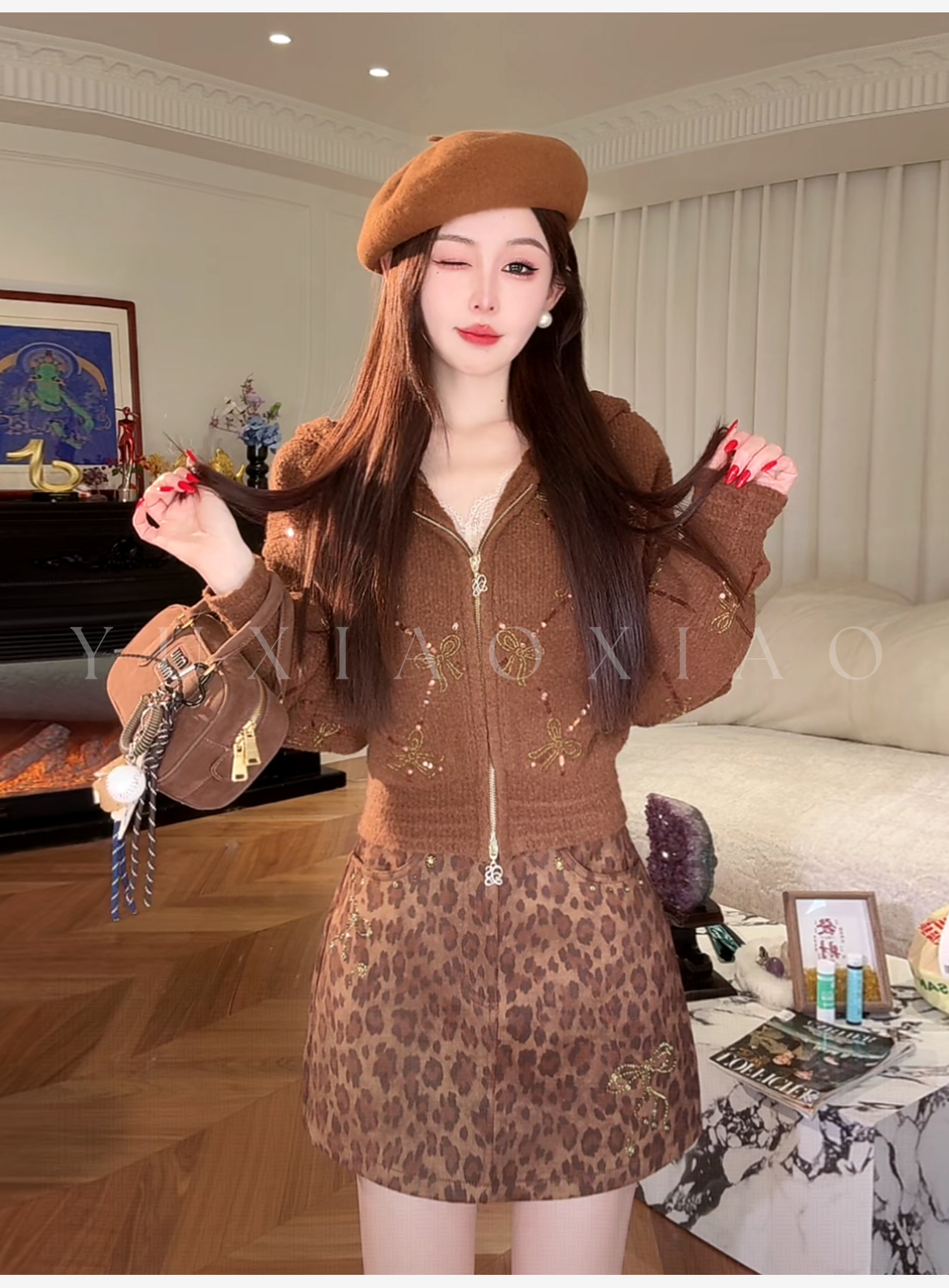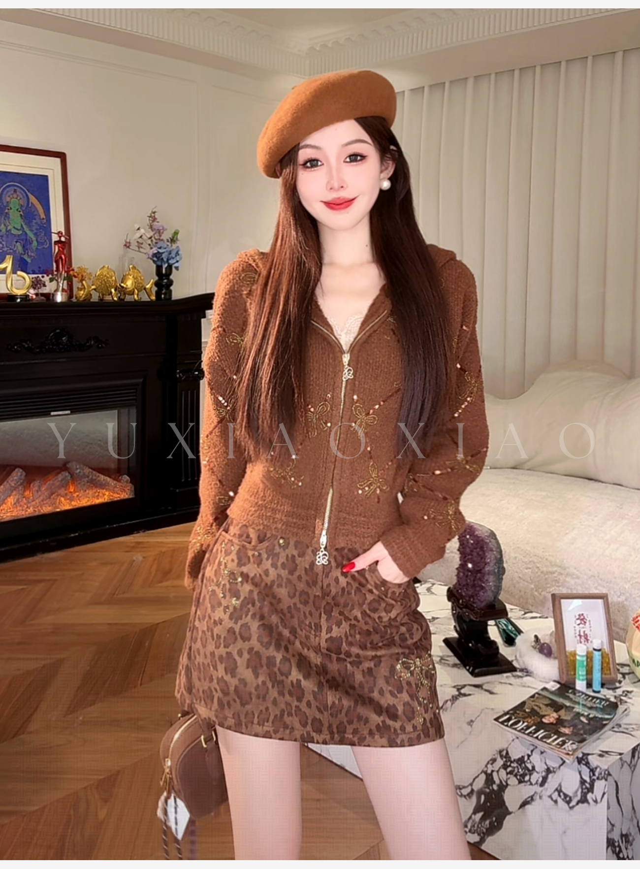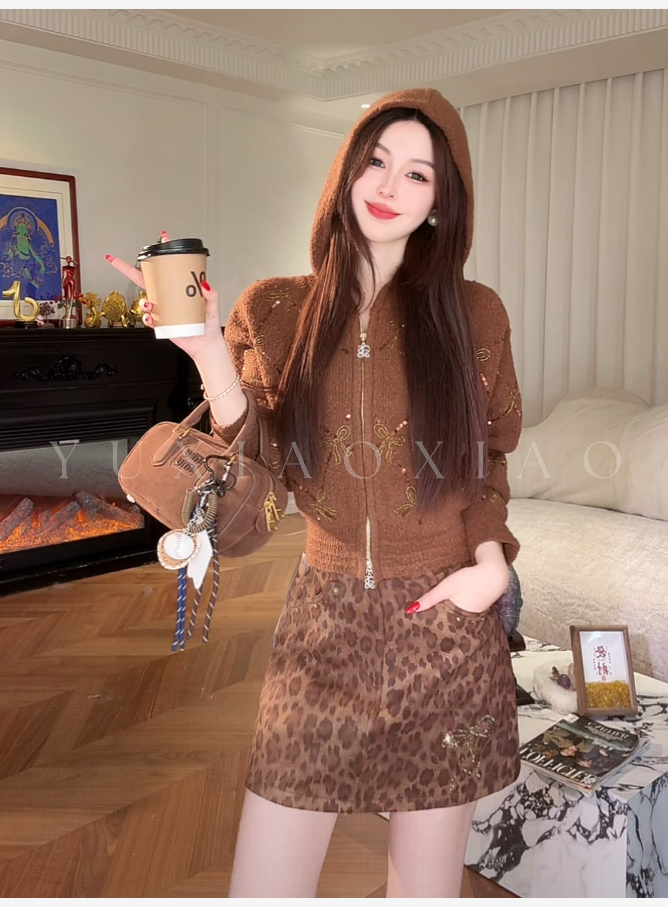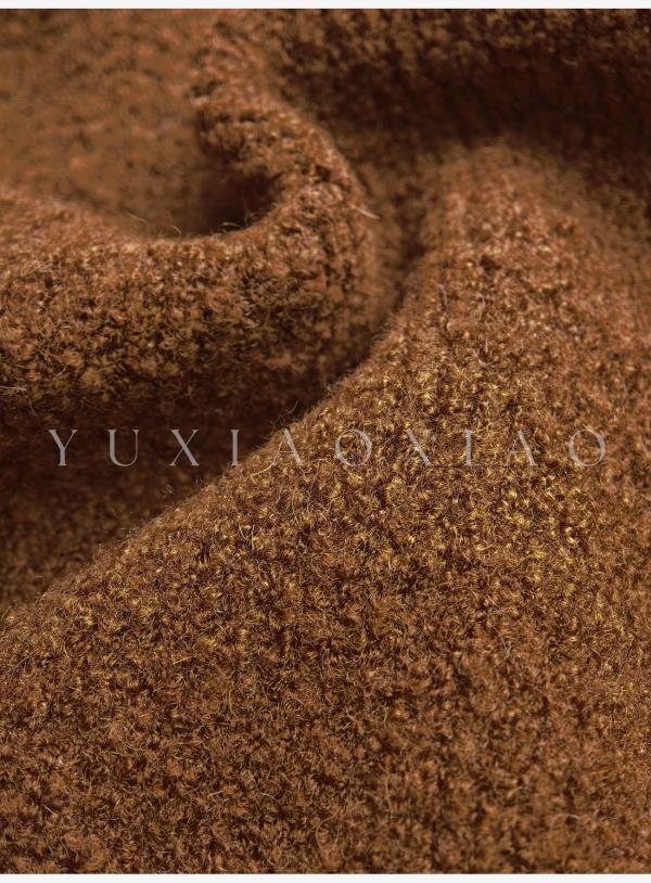 余潇潇【焦糖可露丽】绵羊毛混纺菱格珠片刺绣蝴蝶结连帽毛衣外套