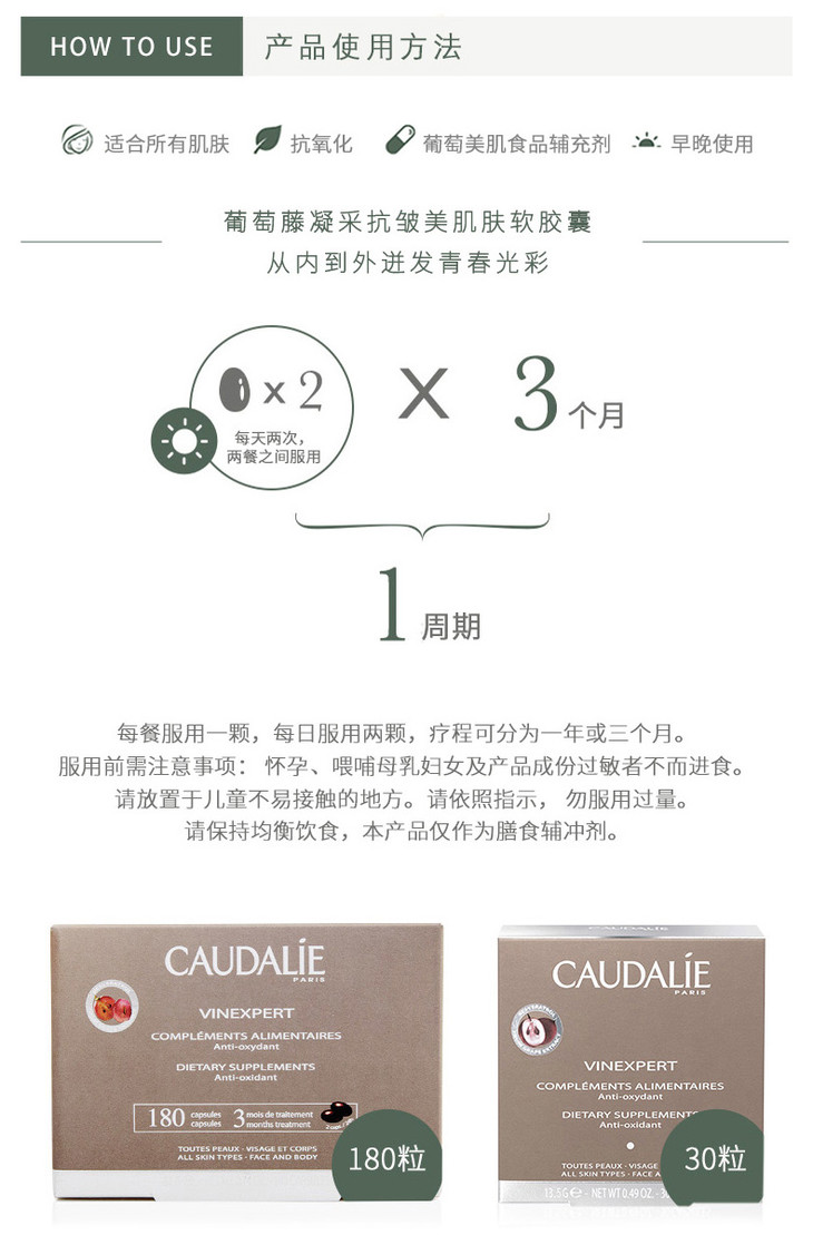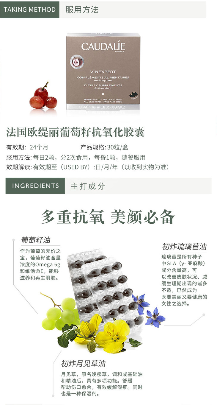 【保税仓】欧缇丽Caudalie欧缇丽 透白葡萄籽凝釆美肌软胶囊30粒