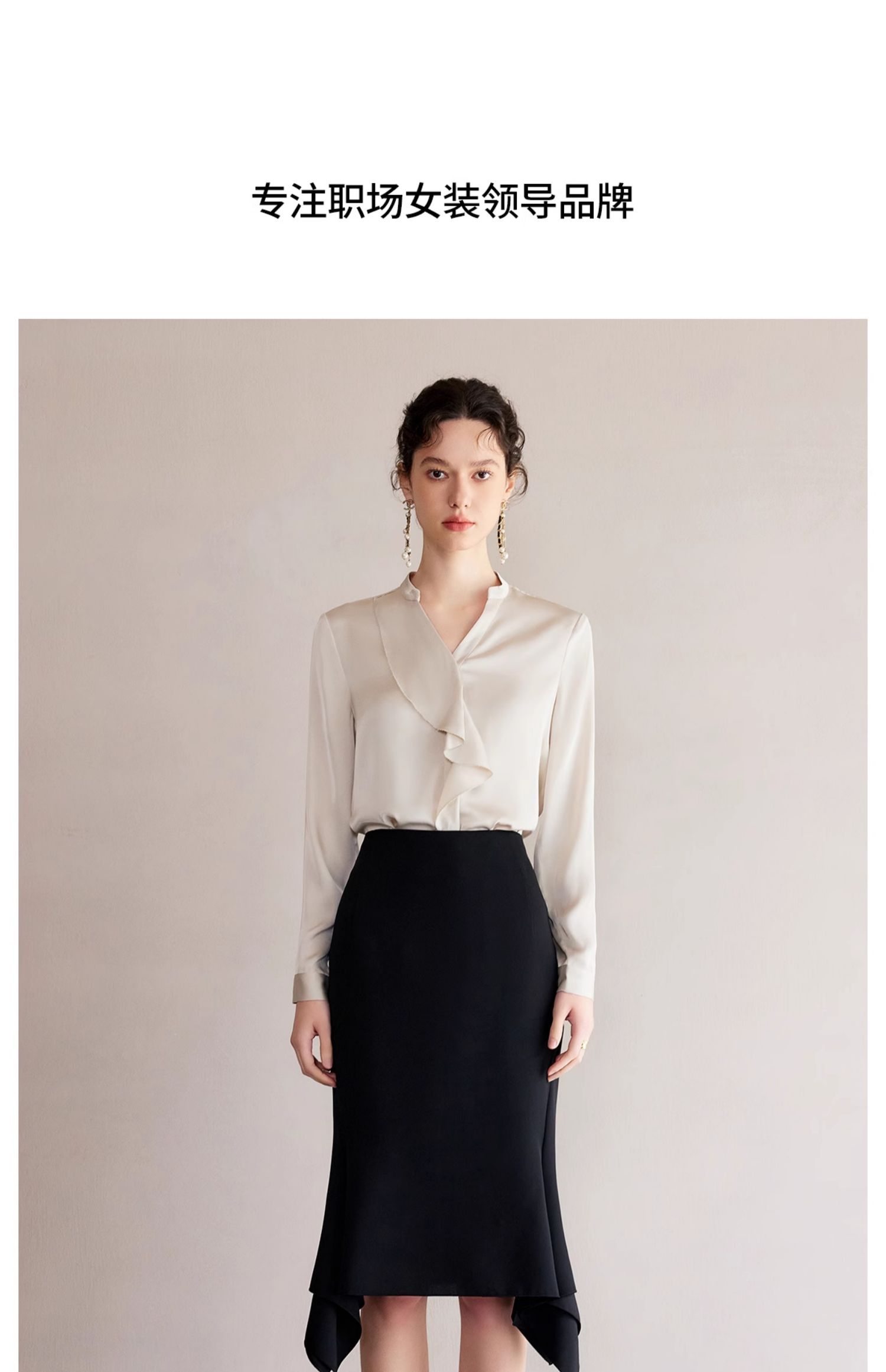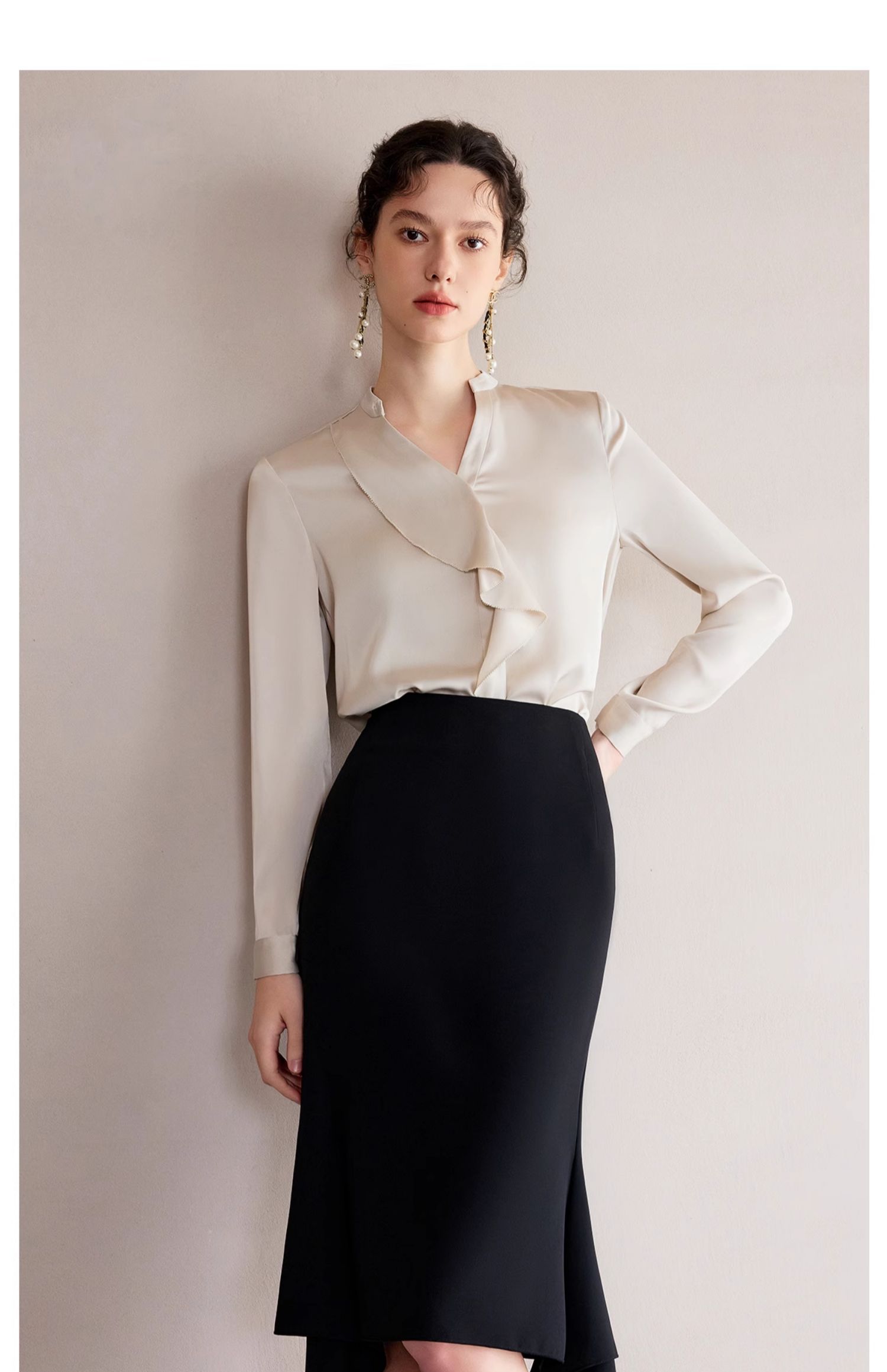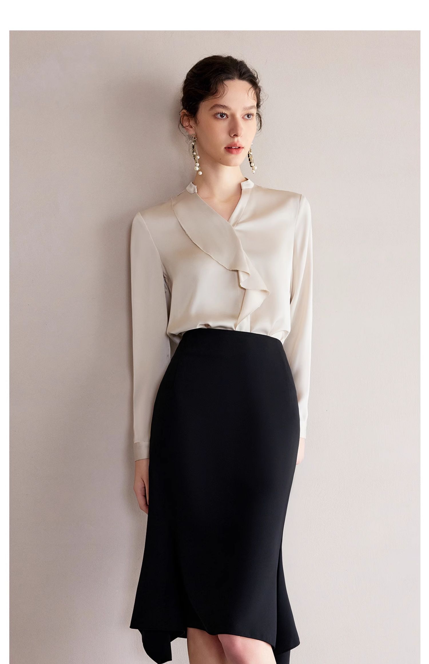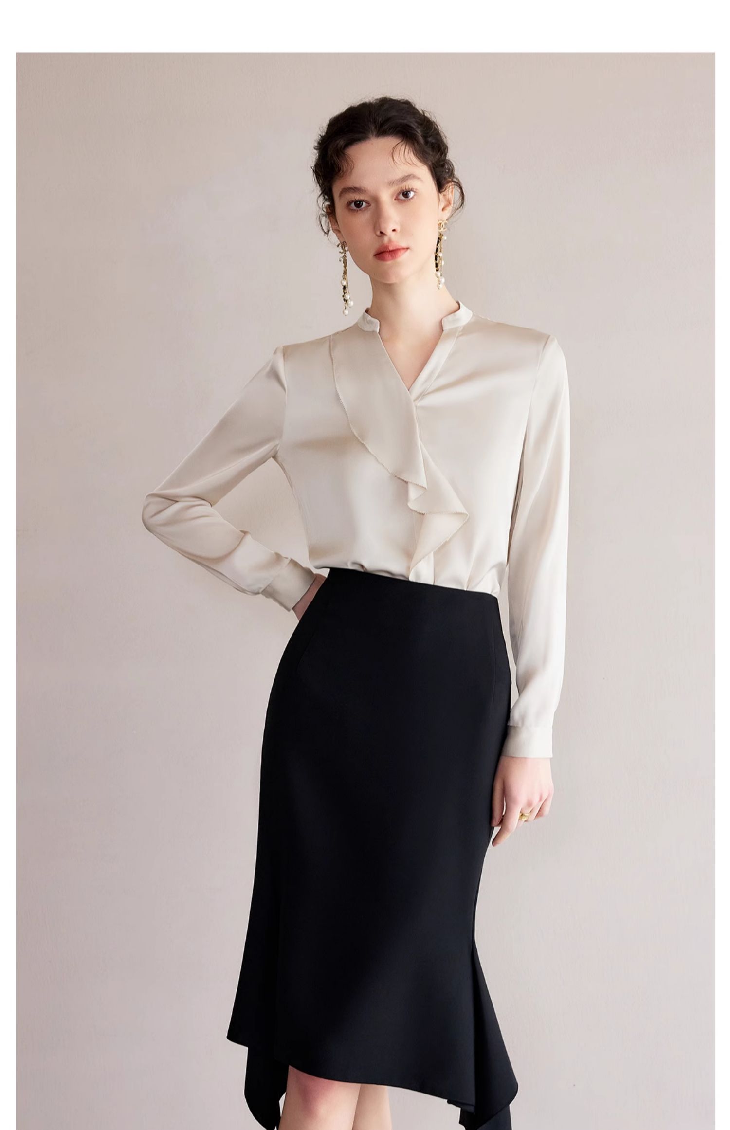 IWY/时髦小姨风穿搭套装新款香槟色长袖衬衫两件套黑色鱼尾半裙B523+S2207