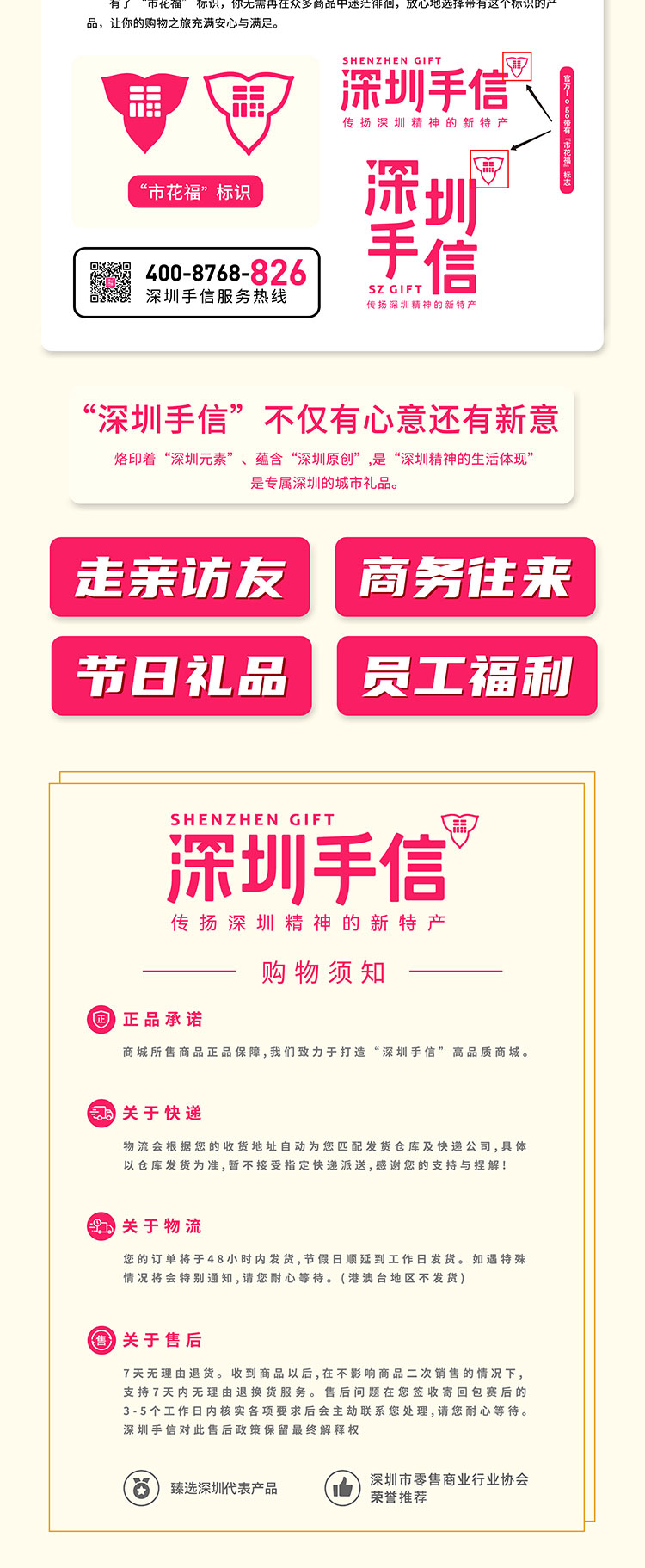 欢迎关注【深圳手信商城】 深圳手信是城市礼品的选购平台,臻选深圳八大优势产业代表产品,深圳市零售商业行业协会推荐。 闭着眼睛挑,每一份都是好礼,是商务往来、旅游出差、走亲访友、员工福利的好礼