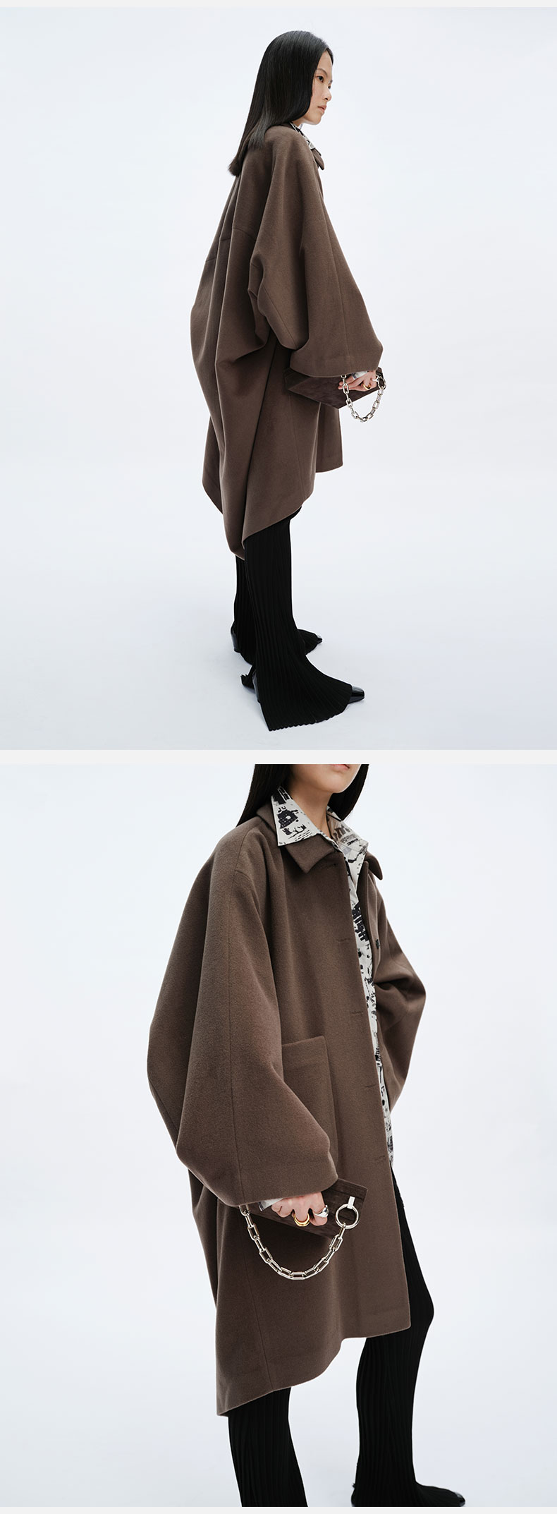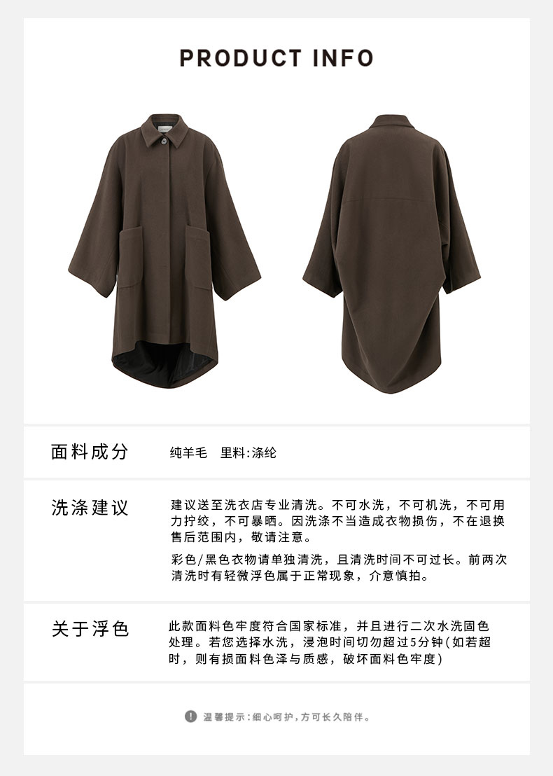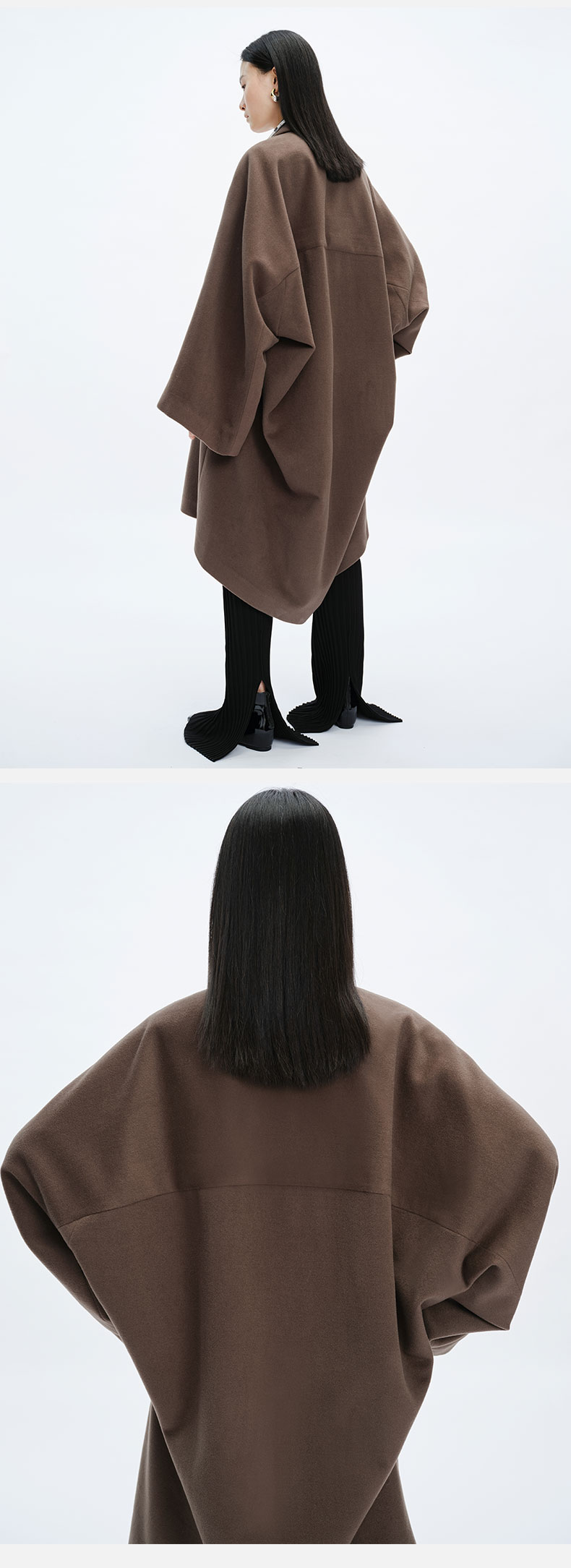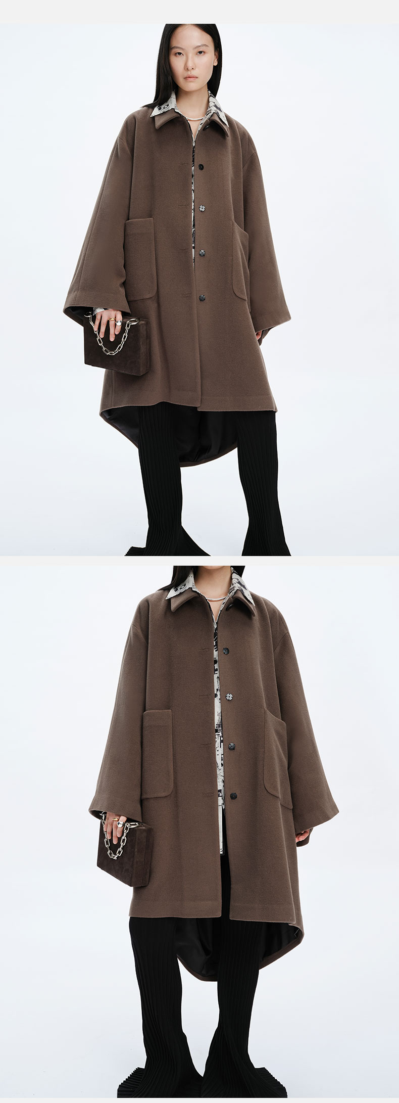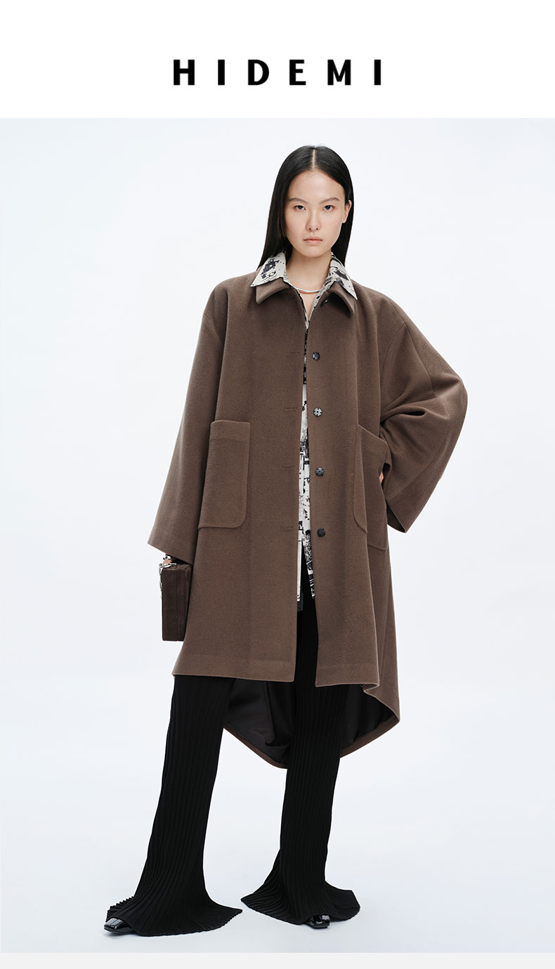 HIDEMI 摩卡色口袋极简大廓形前短后长式羊毛大衣