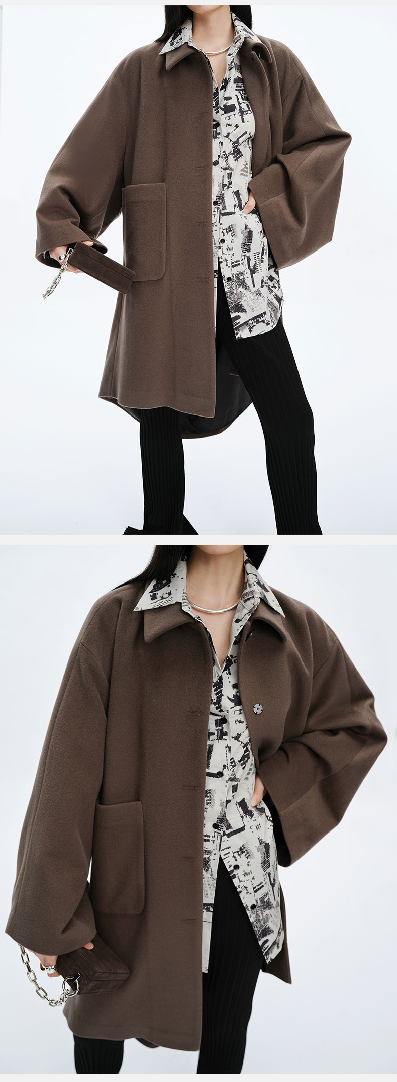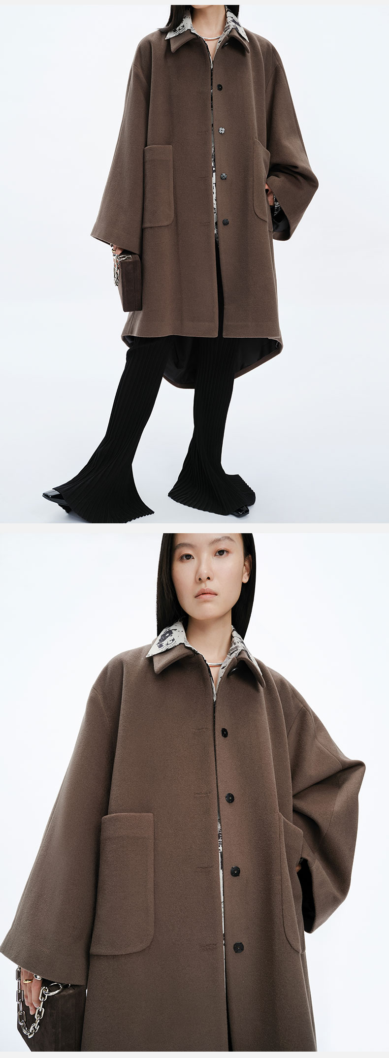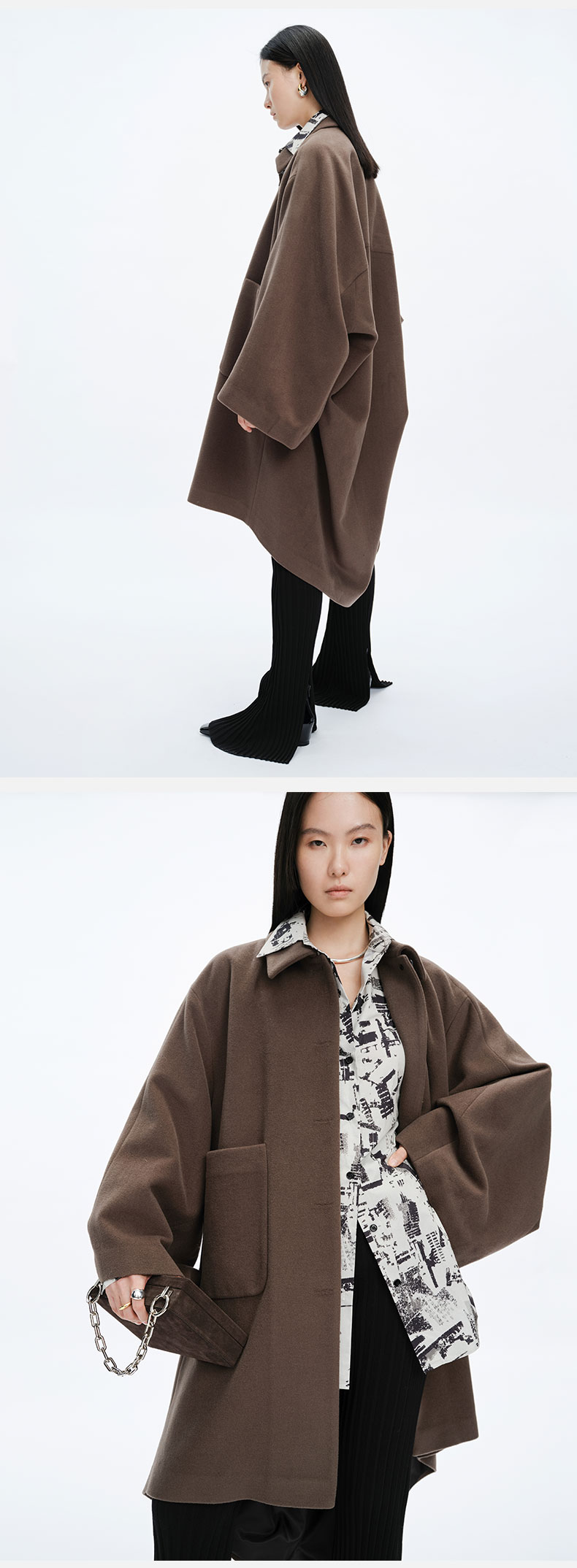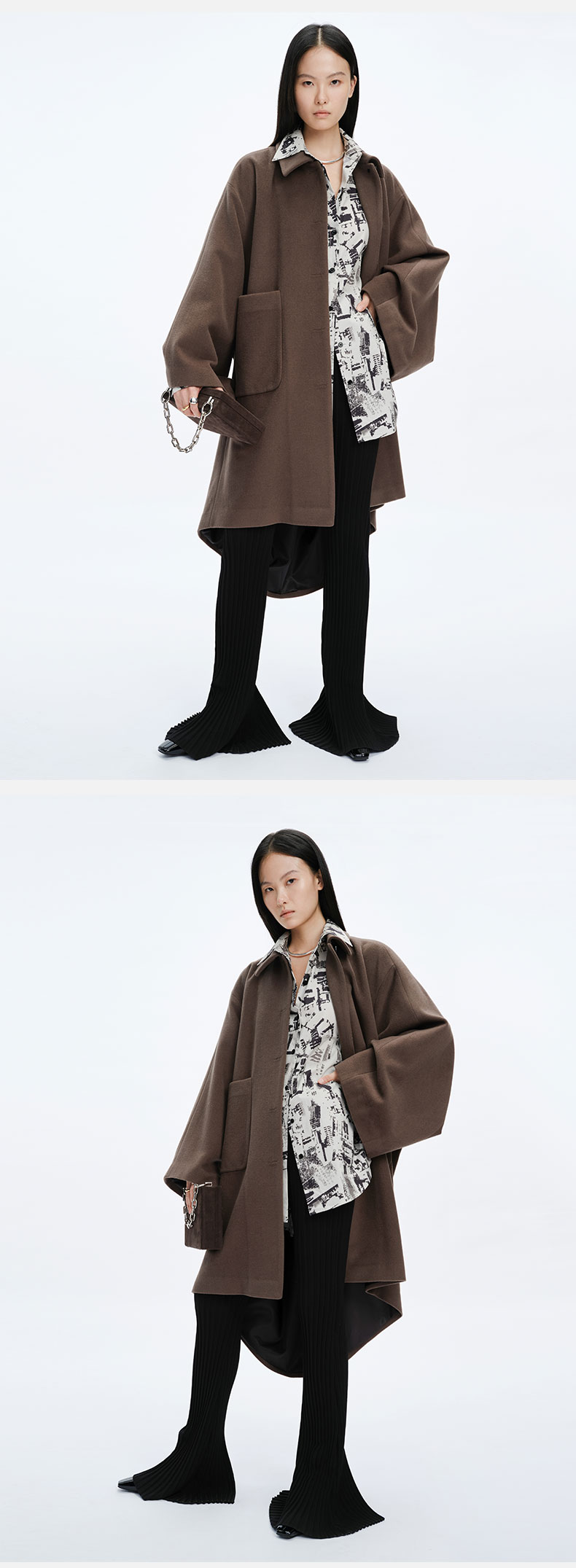HIDEMI 摩卡色口袋极简大廓形前短后长式羊毛大衣