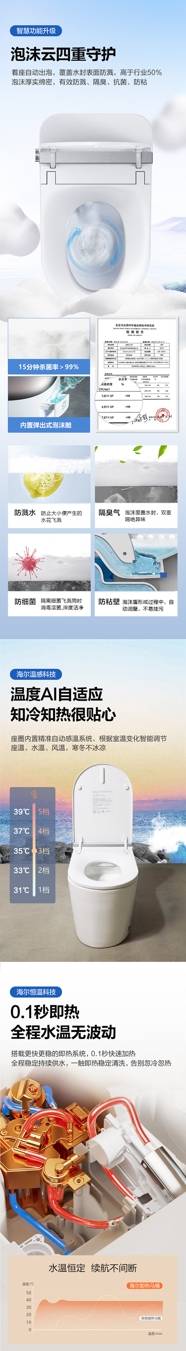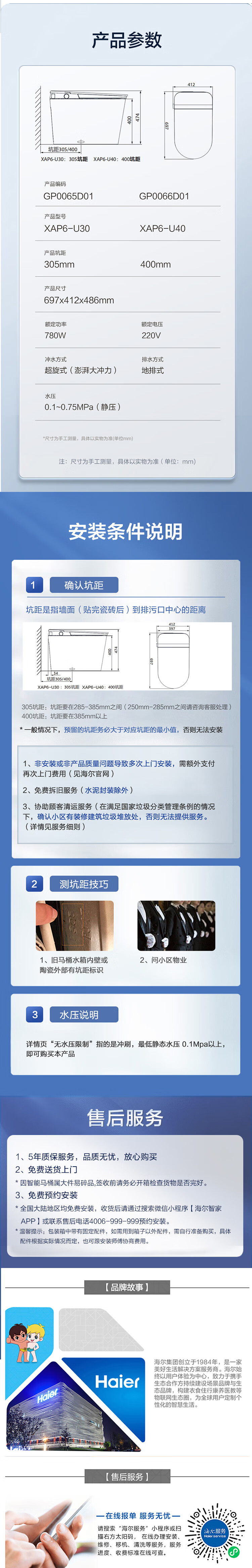 海尔(Haier)智能马桶一体机超旋式冲水零水压泡沫盾家用卧室卫生间轻音坐便器 【海尔售后免费安装】XAP6升级款 防电墙2.0 305坑距( 285-385以内选择)/400坑距 具体坑距咨询客服