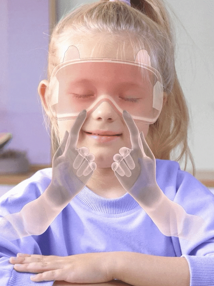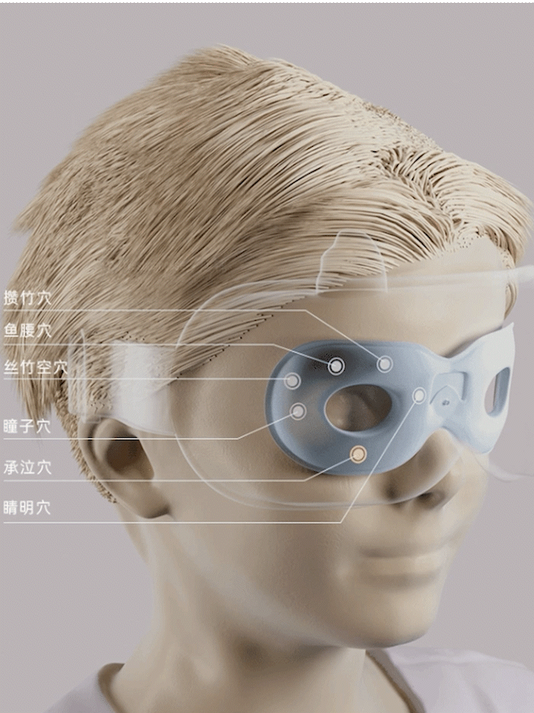 原理:3D气囊围绕全眼周穴位分布,通过电脑芯片控制气囊充放气,模拟人手指腹揉压等手法刺激穴位,让孩子解放双手做眼保健操