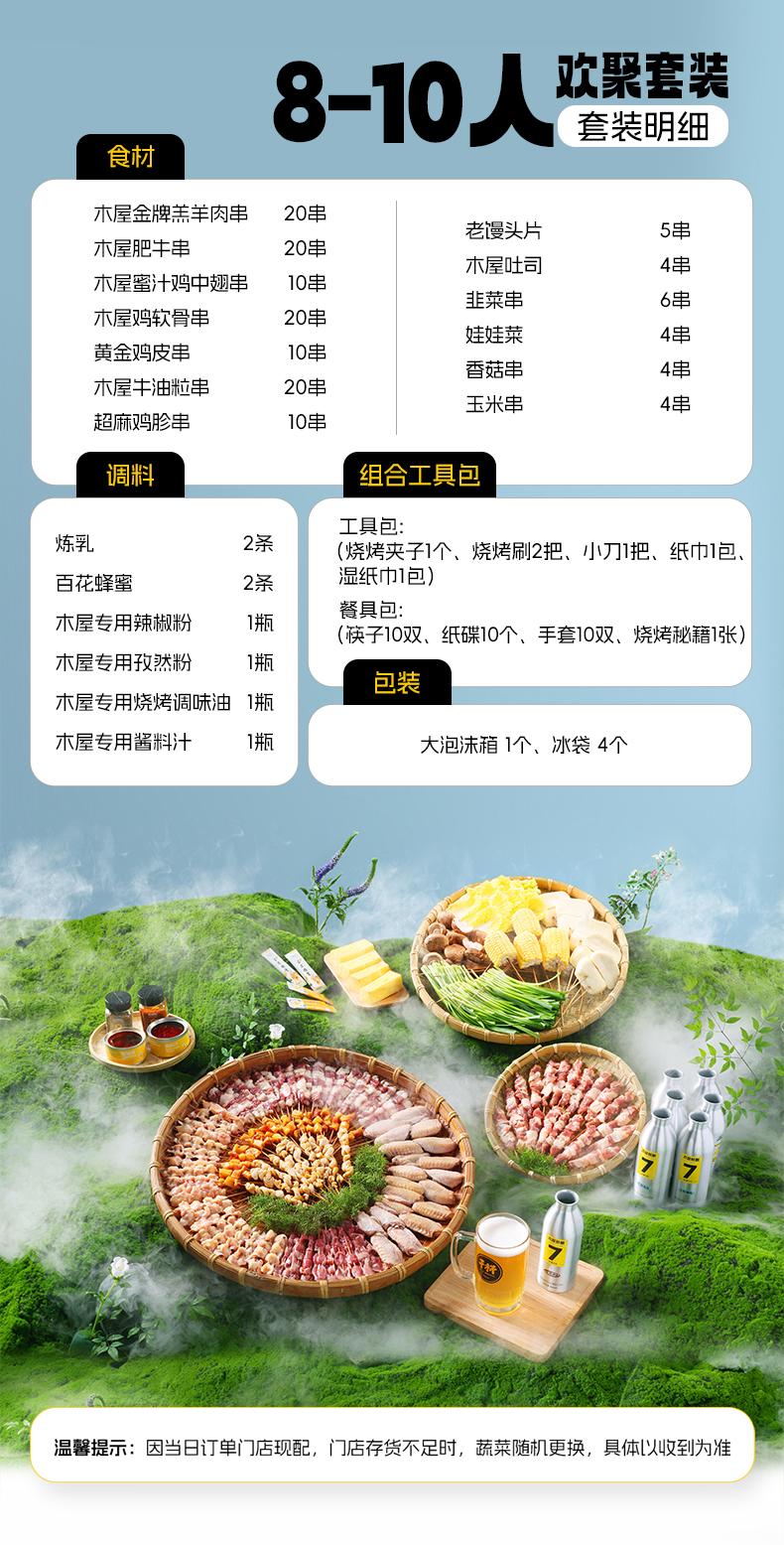 木屋烧烤半成品套装,一键下单,使命必达。 -全国300家门店支持次日到店自提 -全国顺丰包邮,当日下单,次日顺丰送货上门(部分区域除外,实际以顺丰时效为准)