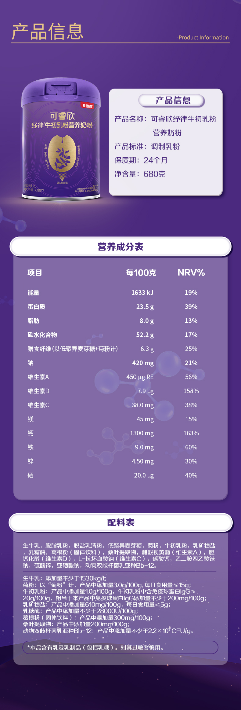 贝因美可睿欣纾律牛初乳粉营养奶粉680克