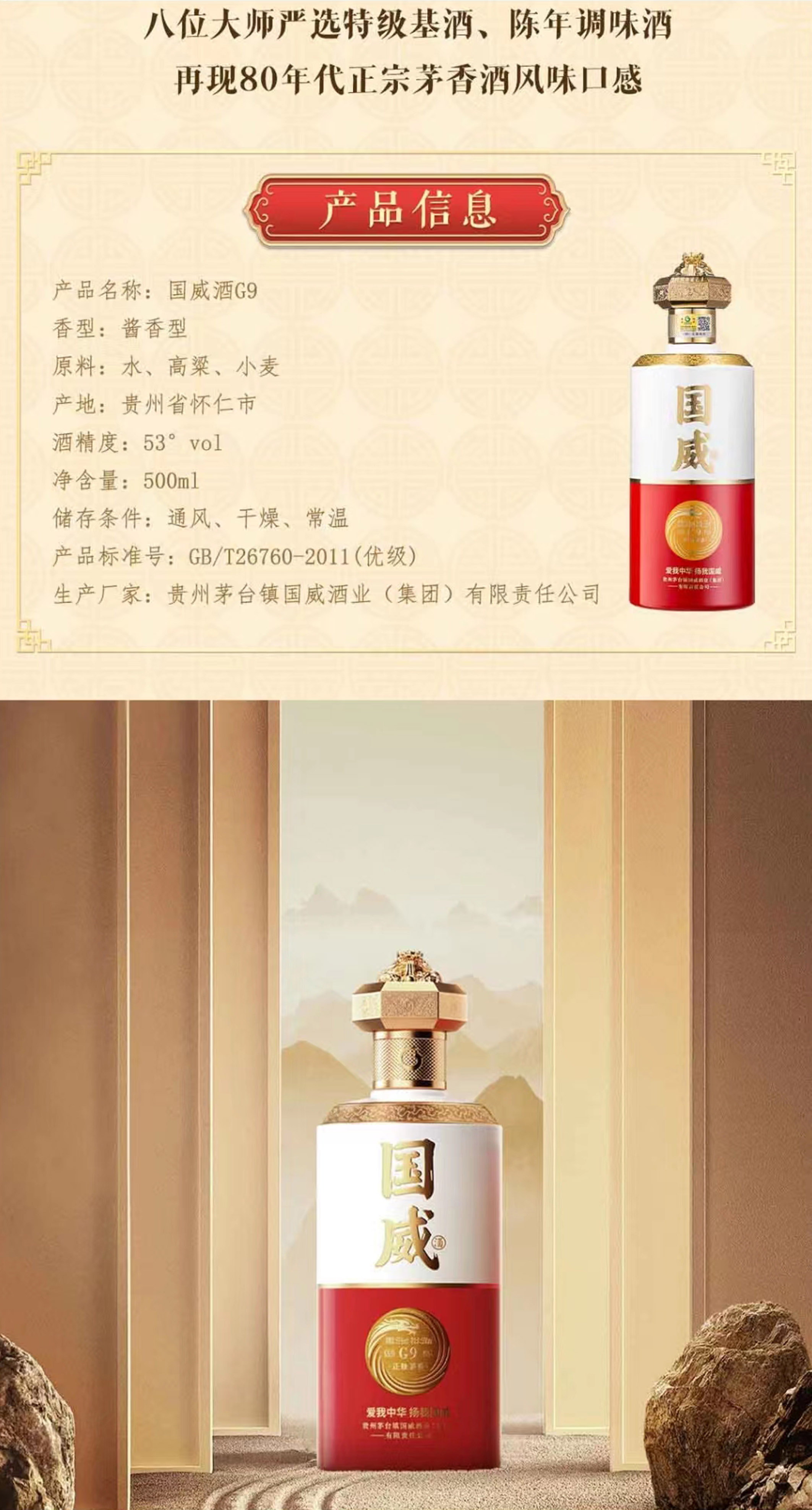 贵州国威酒 G9 酱香型白酒 53度 500ml*1瓶/6瓶整箱