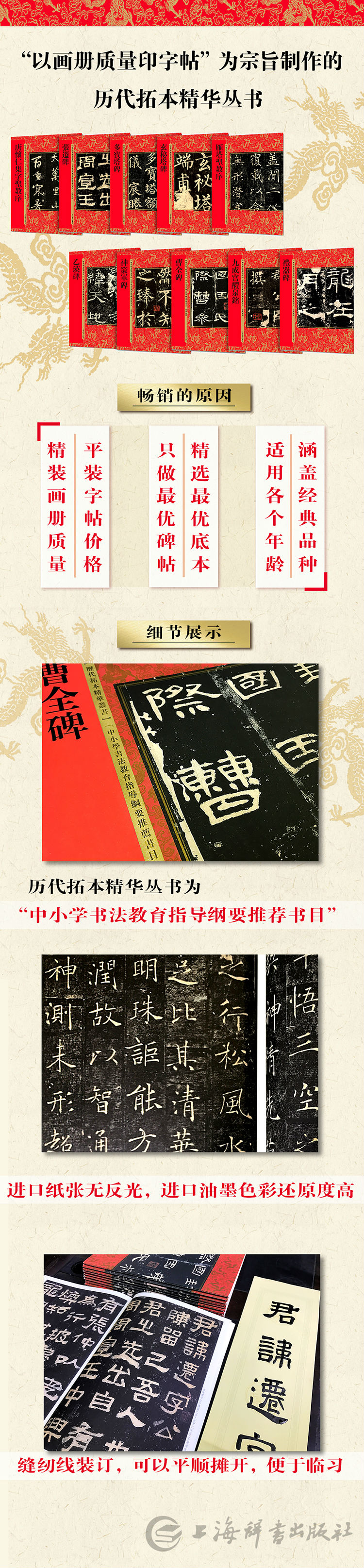 金装版•历代拓本精华系列共二十本,精选历代碑帖精粹,印刷精美,版面清晰,是赏书、习书的典范。本系列品种多样、书体丰富,适合习书者观赏、临习。本书为金装版•历代拓本精华系列之一《乙瑛碑》。《乙瑛碑》全称《汉鲁相乙瑛请置孔庙百石卒史碑》,又称《孔庙置守庙百石卒史碑》、《孔庙置守庙百石孔和碑》,东汉桓帝永兴元年(153年)立。《乙瑛碑》是汉隶成熟时期的典型作品。它的艺术成就,备受后世学者和书家的赞美。书法工整精细,秀丽而有骨力,风格秀逸多姿,充分展显了汉隶的成熟与风格,为汉碑、汉隶之精品。