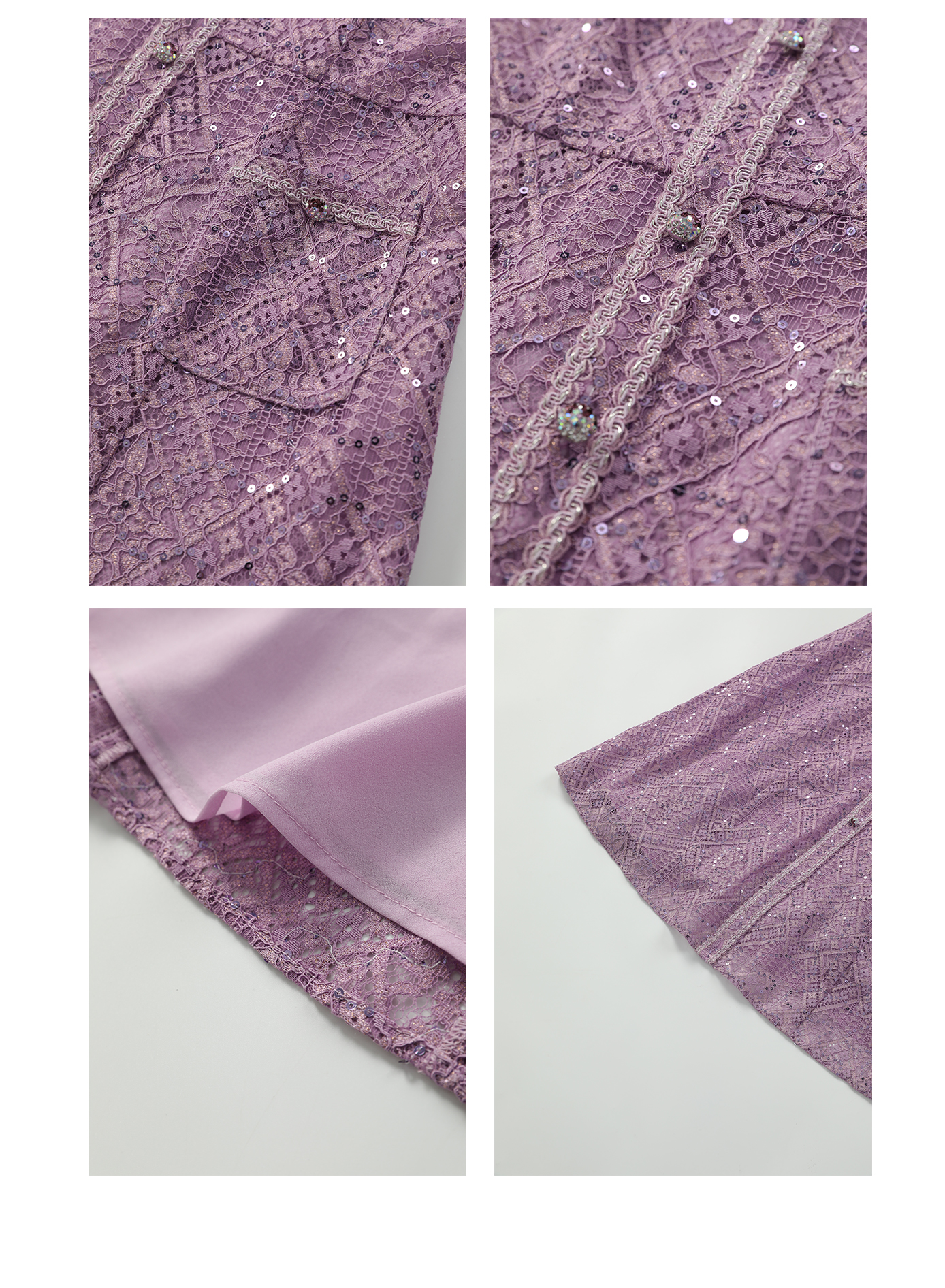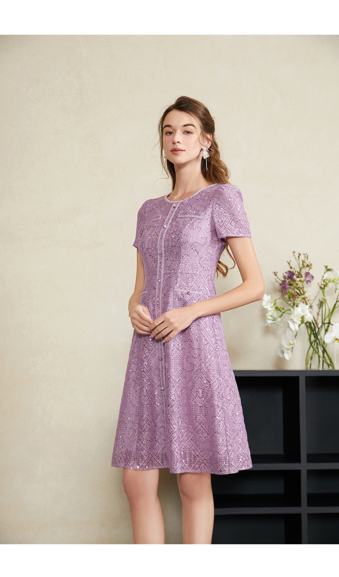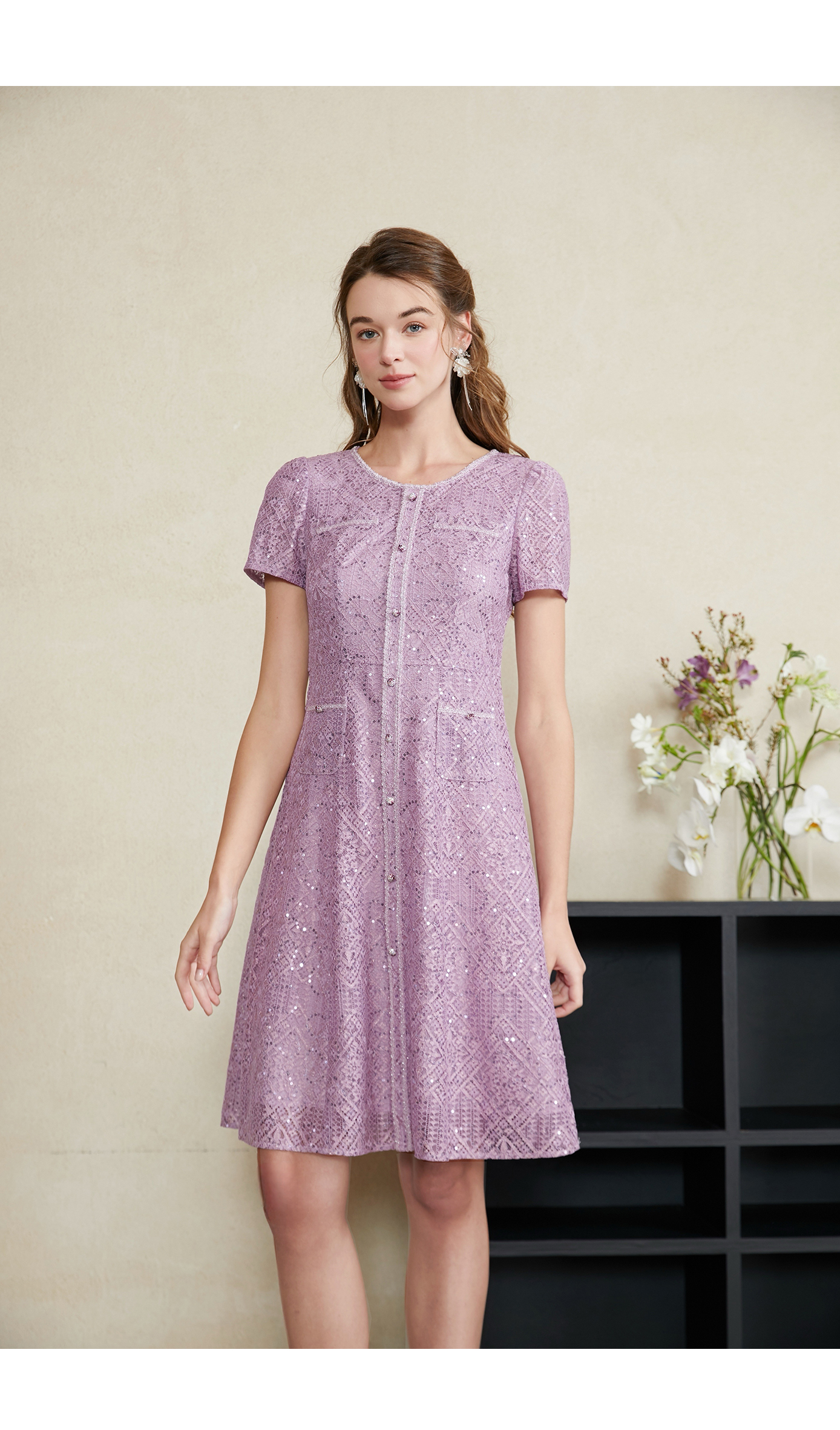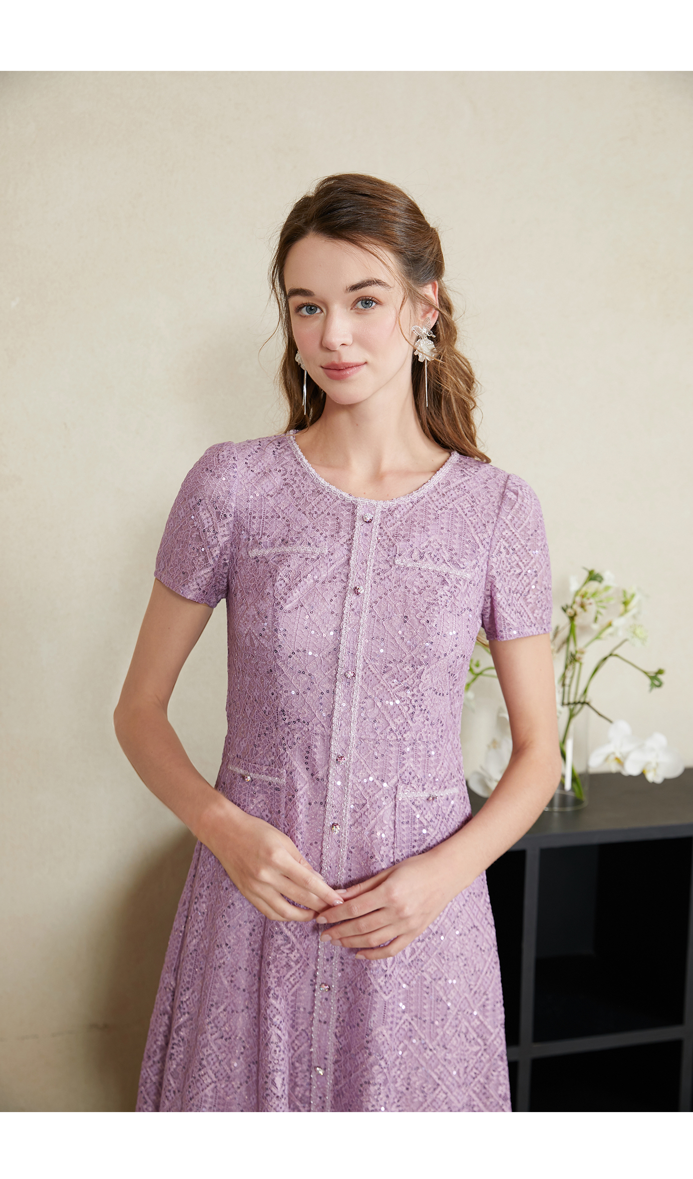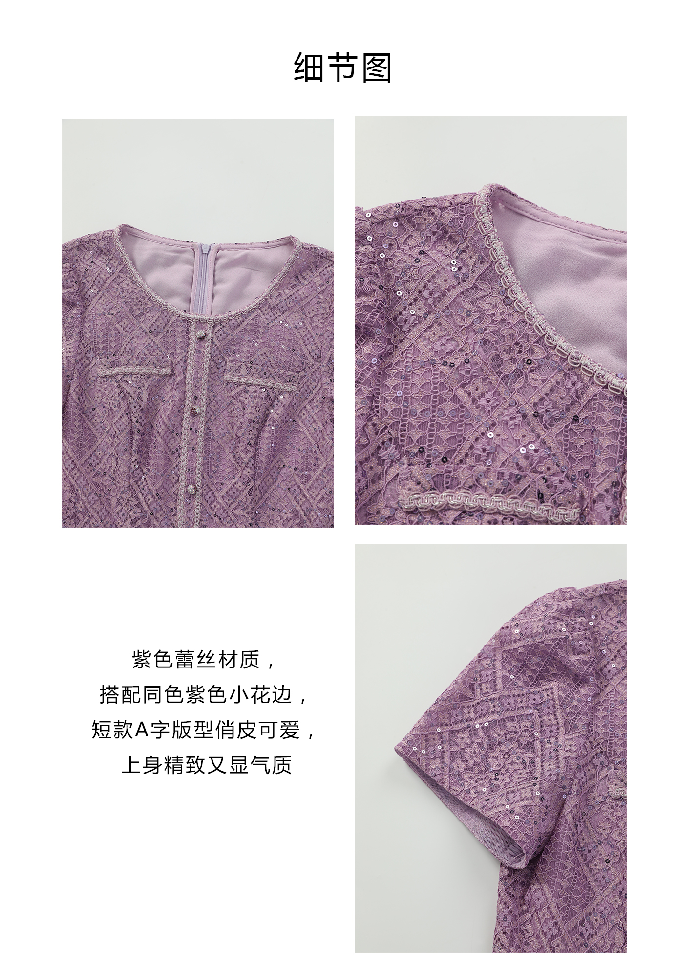 司歌蕾丝小香风圆领短袖收腰连衣裙A911161X