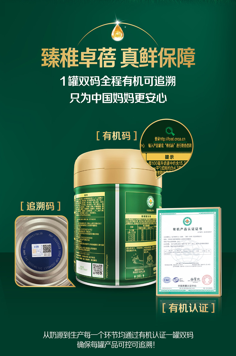 飞鹤臻稚卓蓓有机婴儿配方奶粉听装1段700g