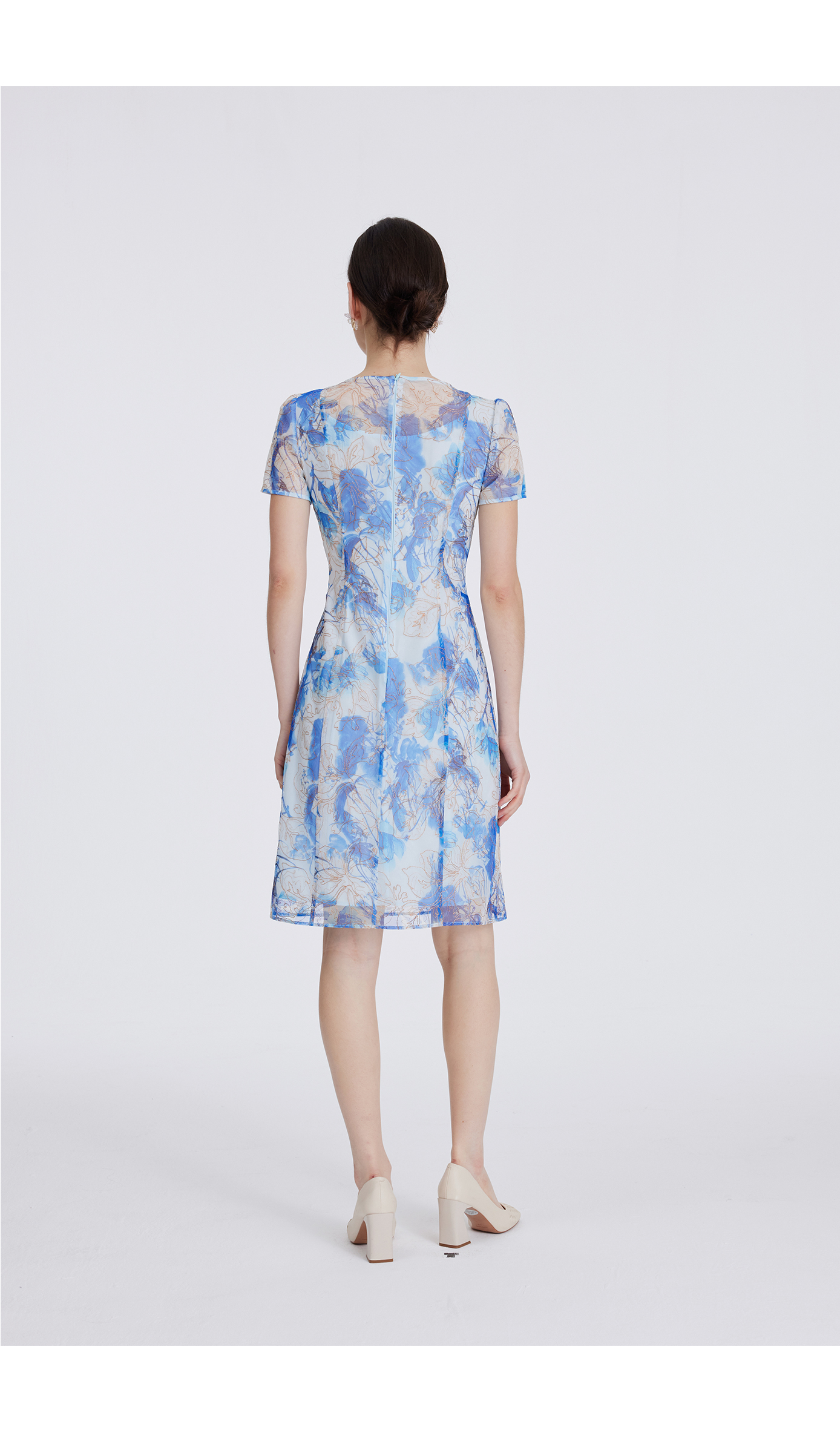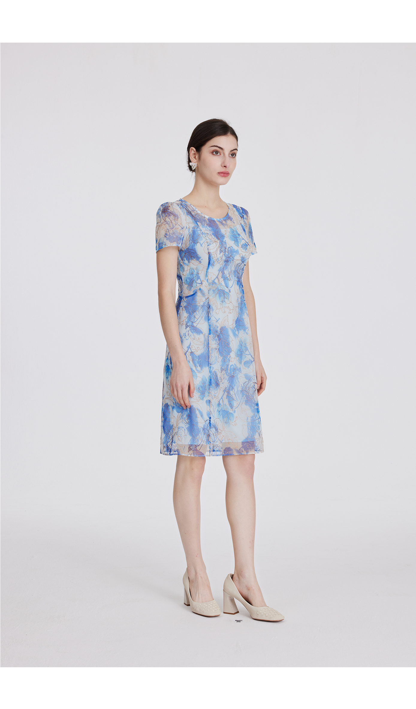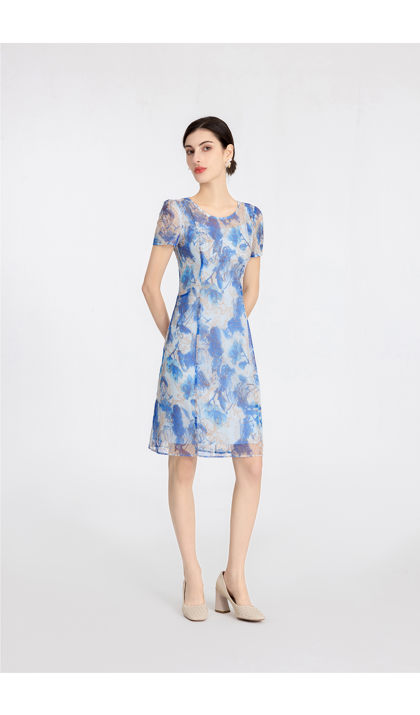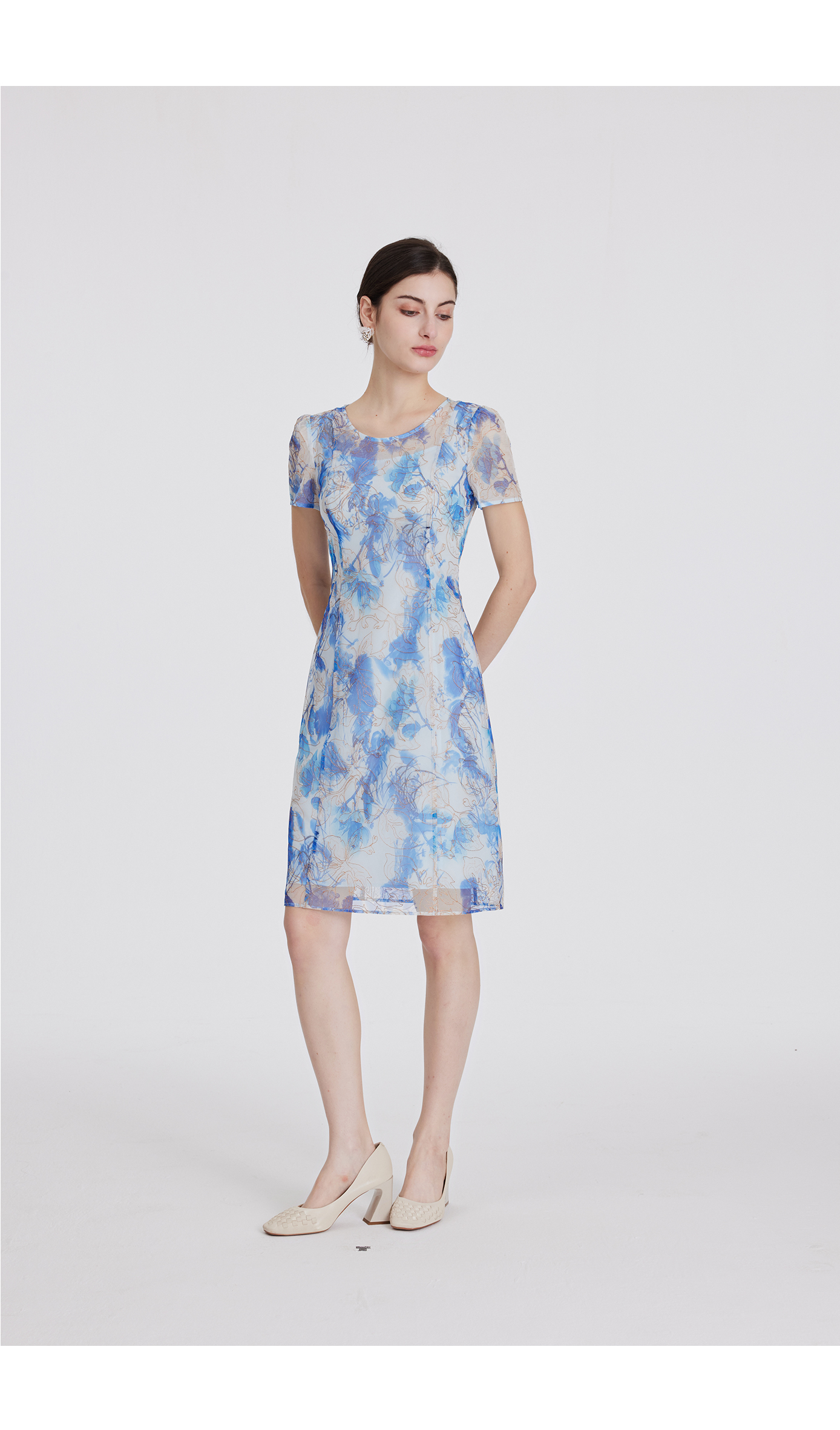 司歌刺绣印花大圆领连衣裙短袖端庄优雅A891190X