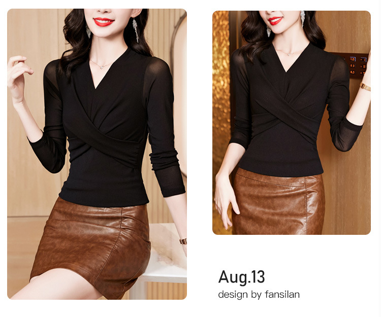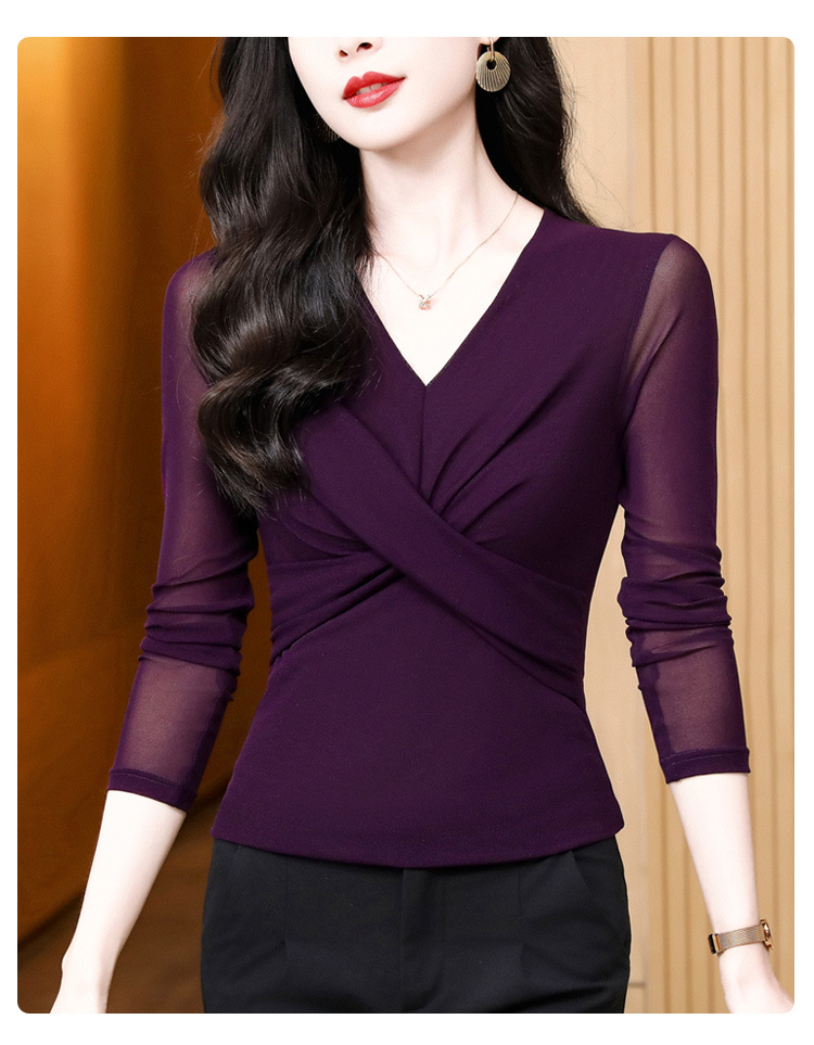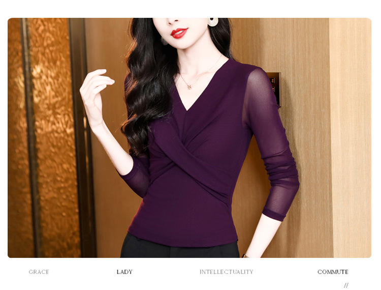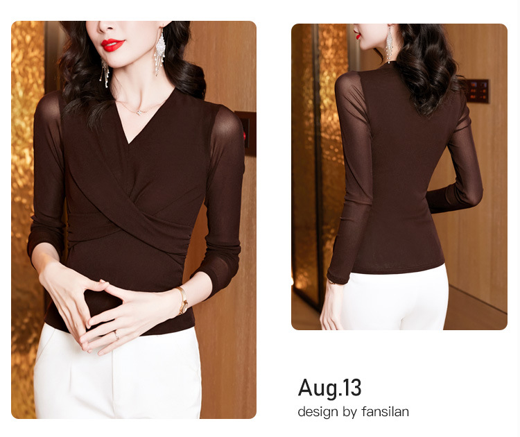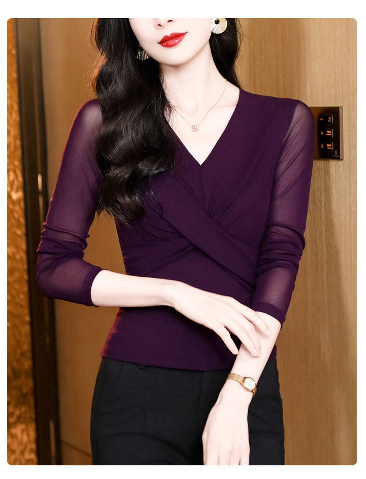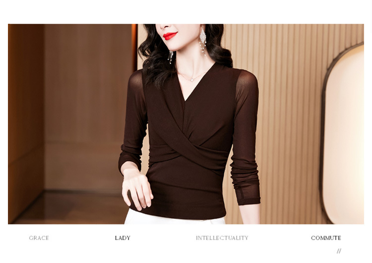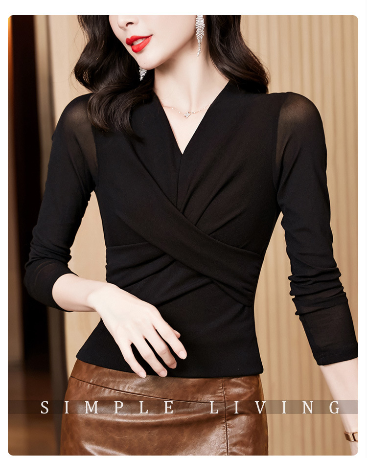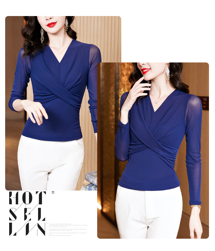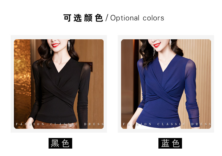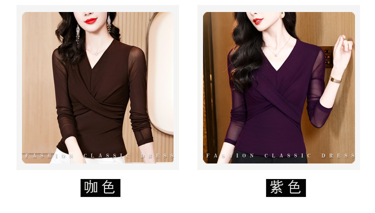 洋气时尚百搭V领长袖,纯色气质网纱打底衫修身显瘦T恤K-E37M2381