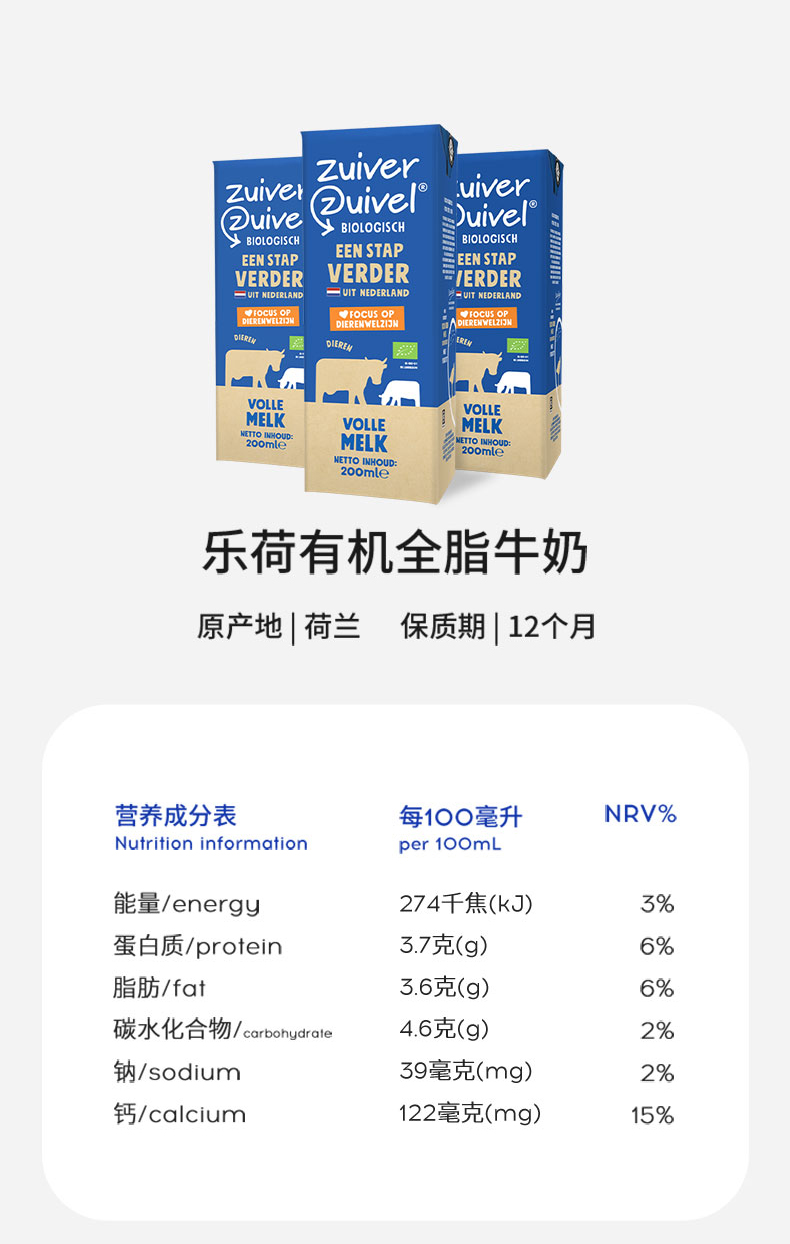 【代发】荷兰进口乐荷有机纯牛奶 200ml/盒