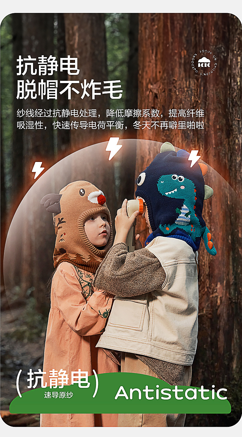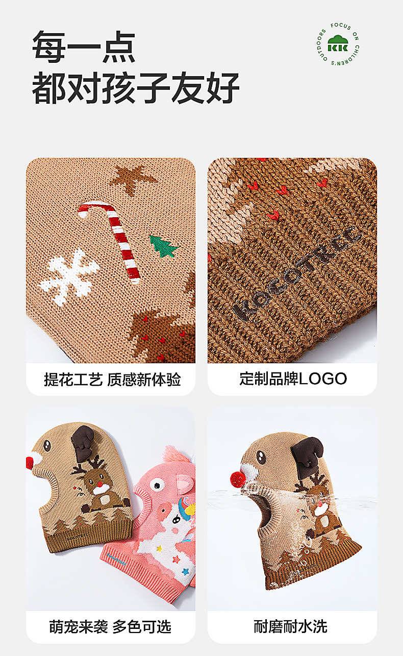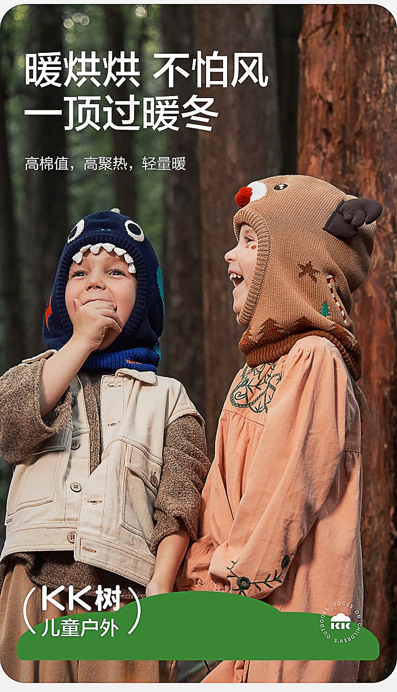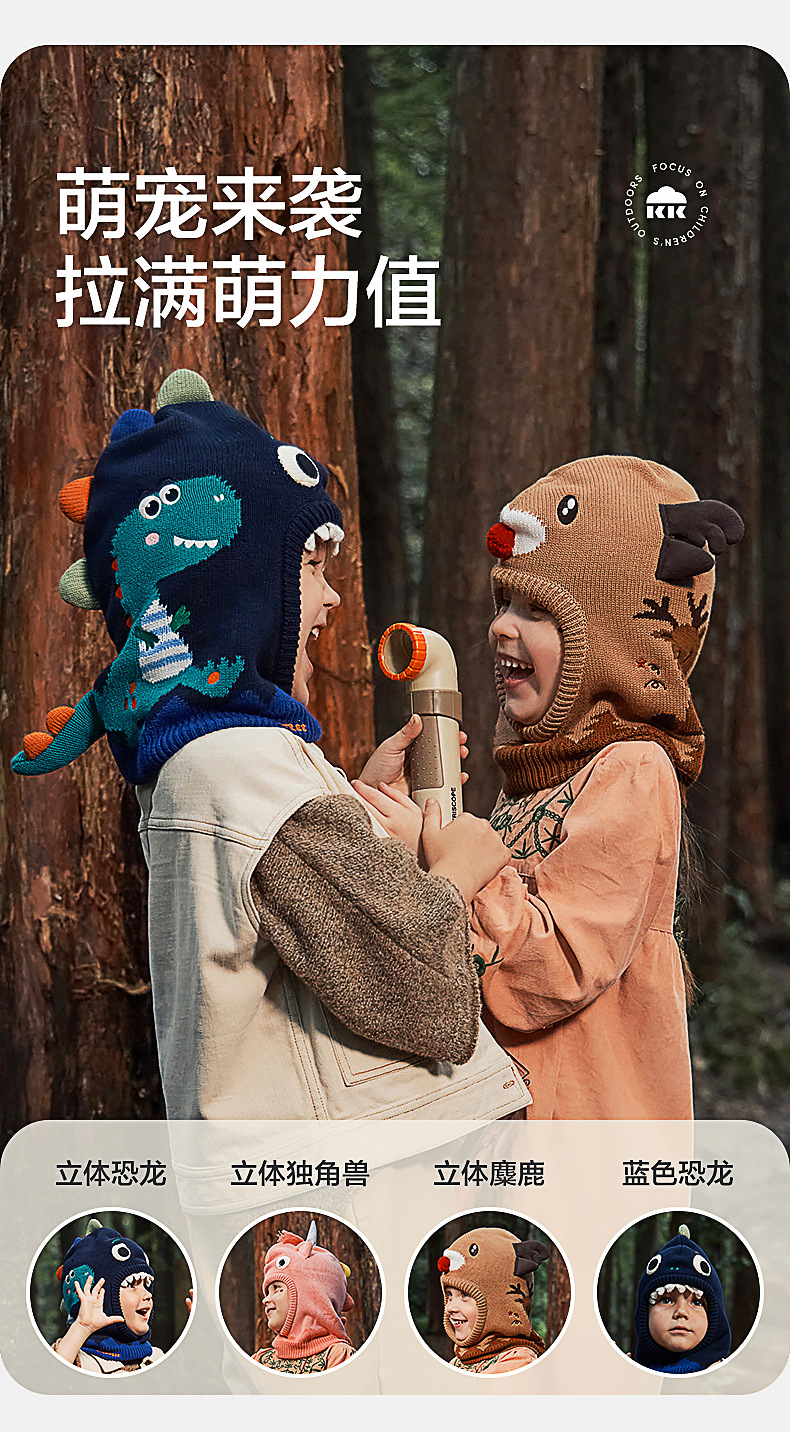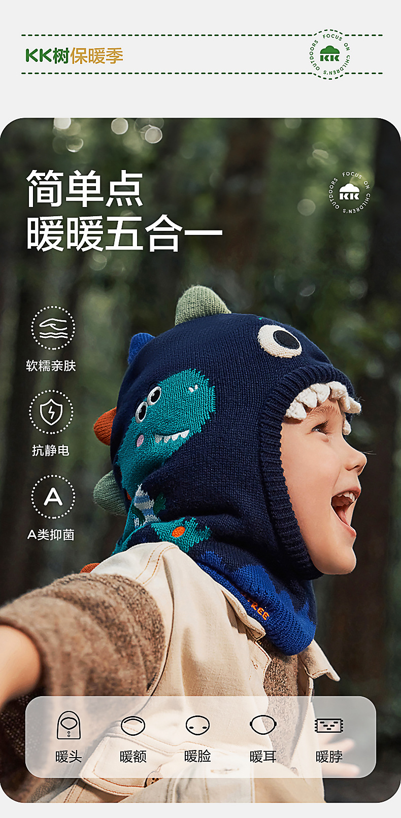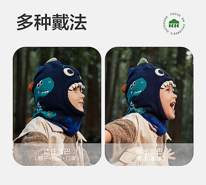 KK树防风保暖围脖一体儿童帽子秋冬季男女童护脸护耳宝宝针织帽子