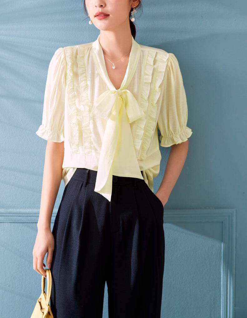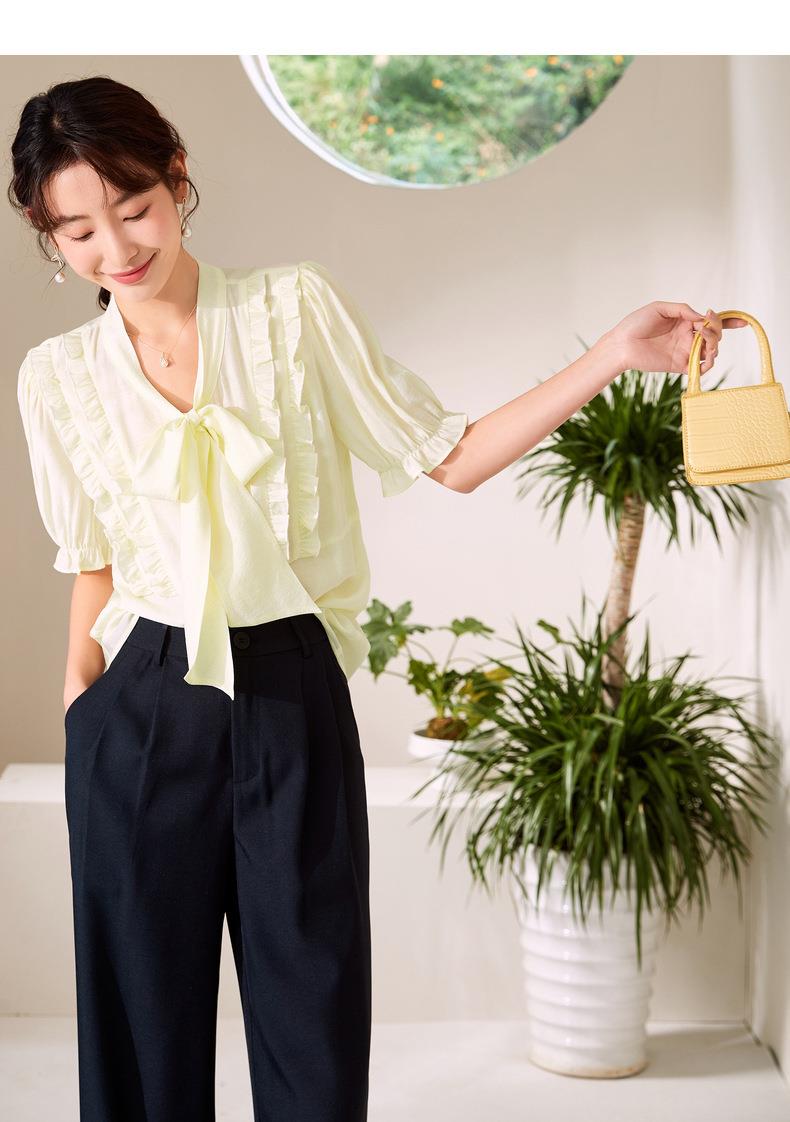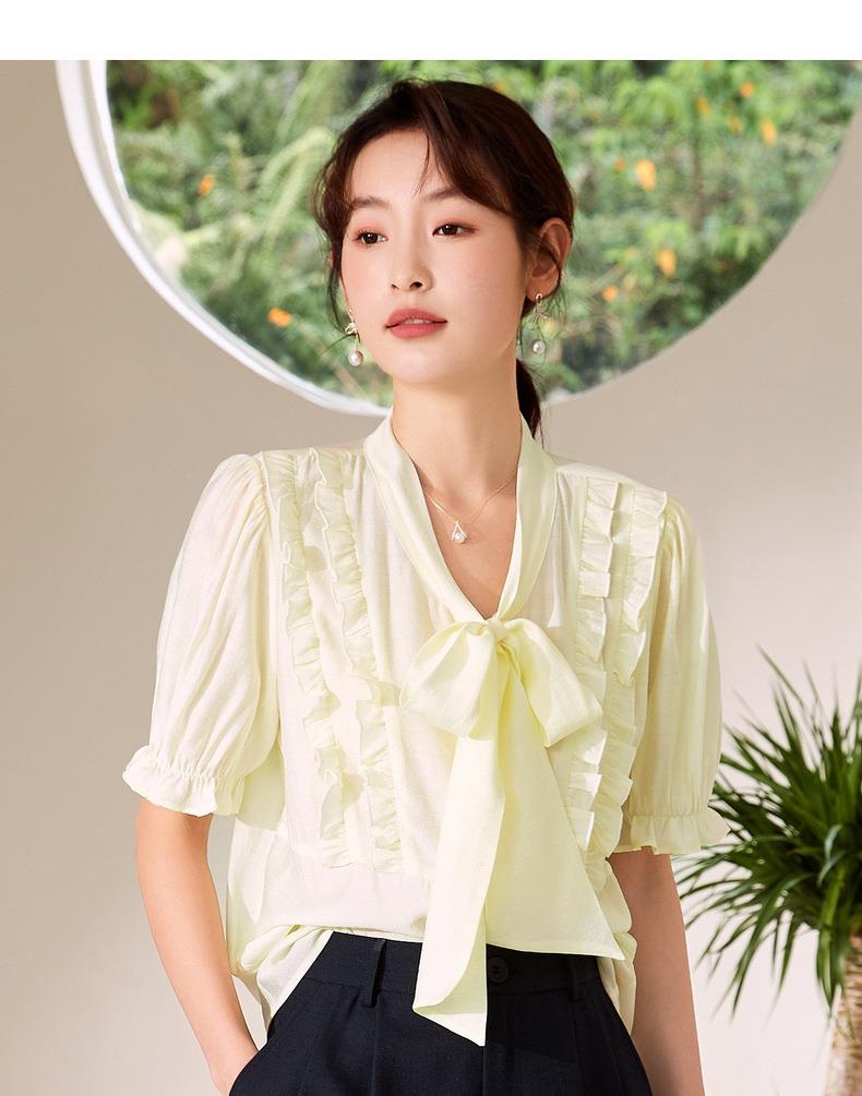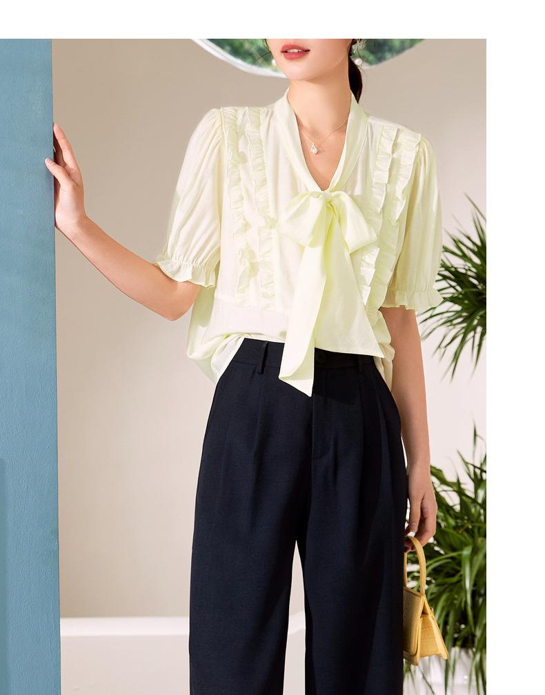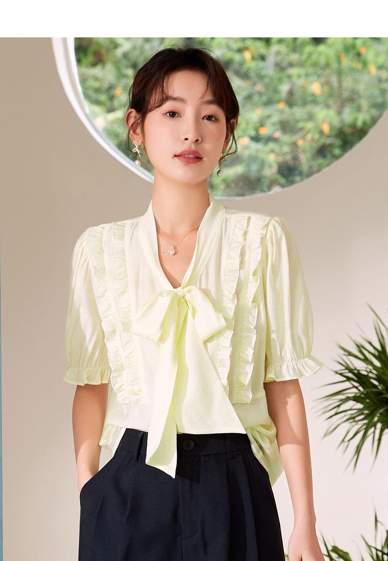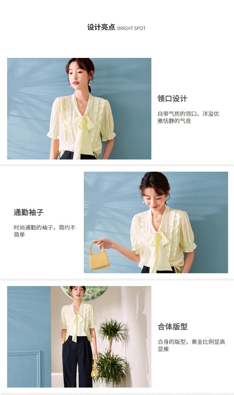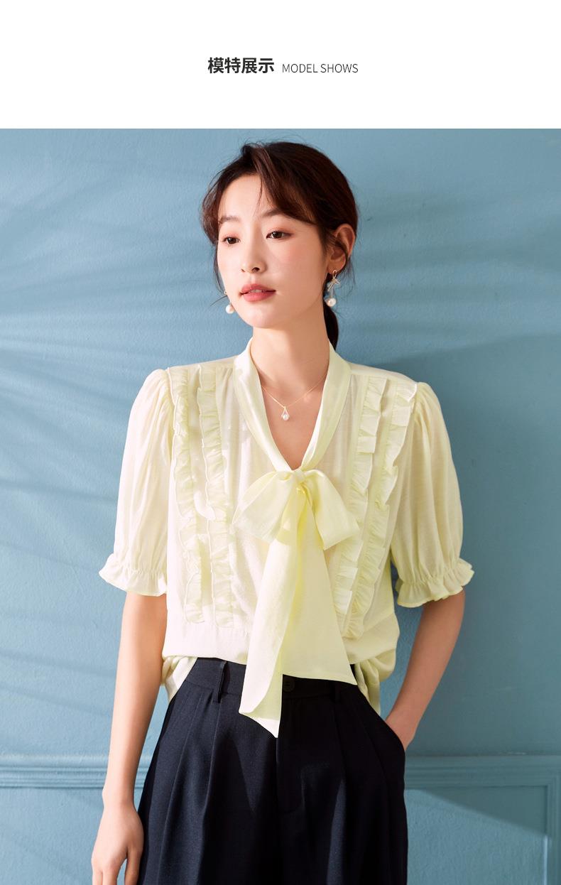 百姿 蝴蝶结木耳边衬衫女2023夏季新款法式优雅直筒短袖女装衬衣