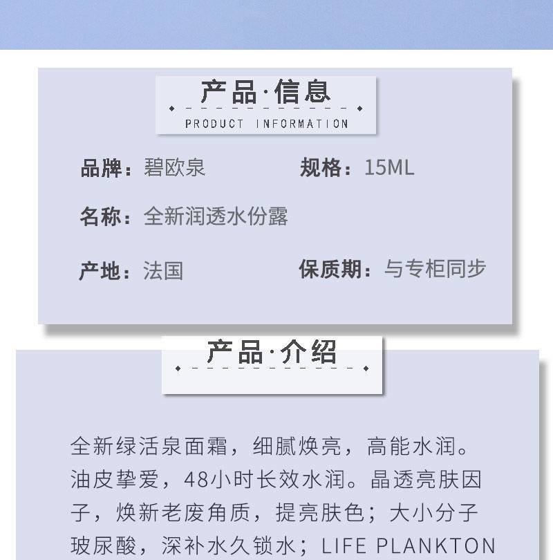 【爆款超低价预售 急单慎拍】碧欧泉全新润透水份露15ml清爽控油保湿绿活泉面霜
