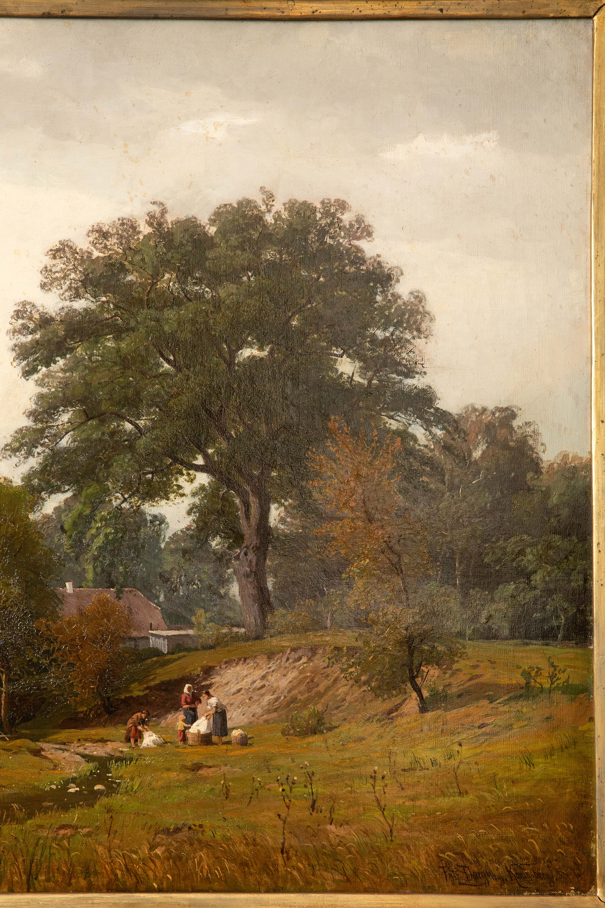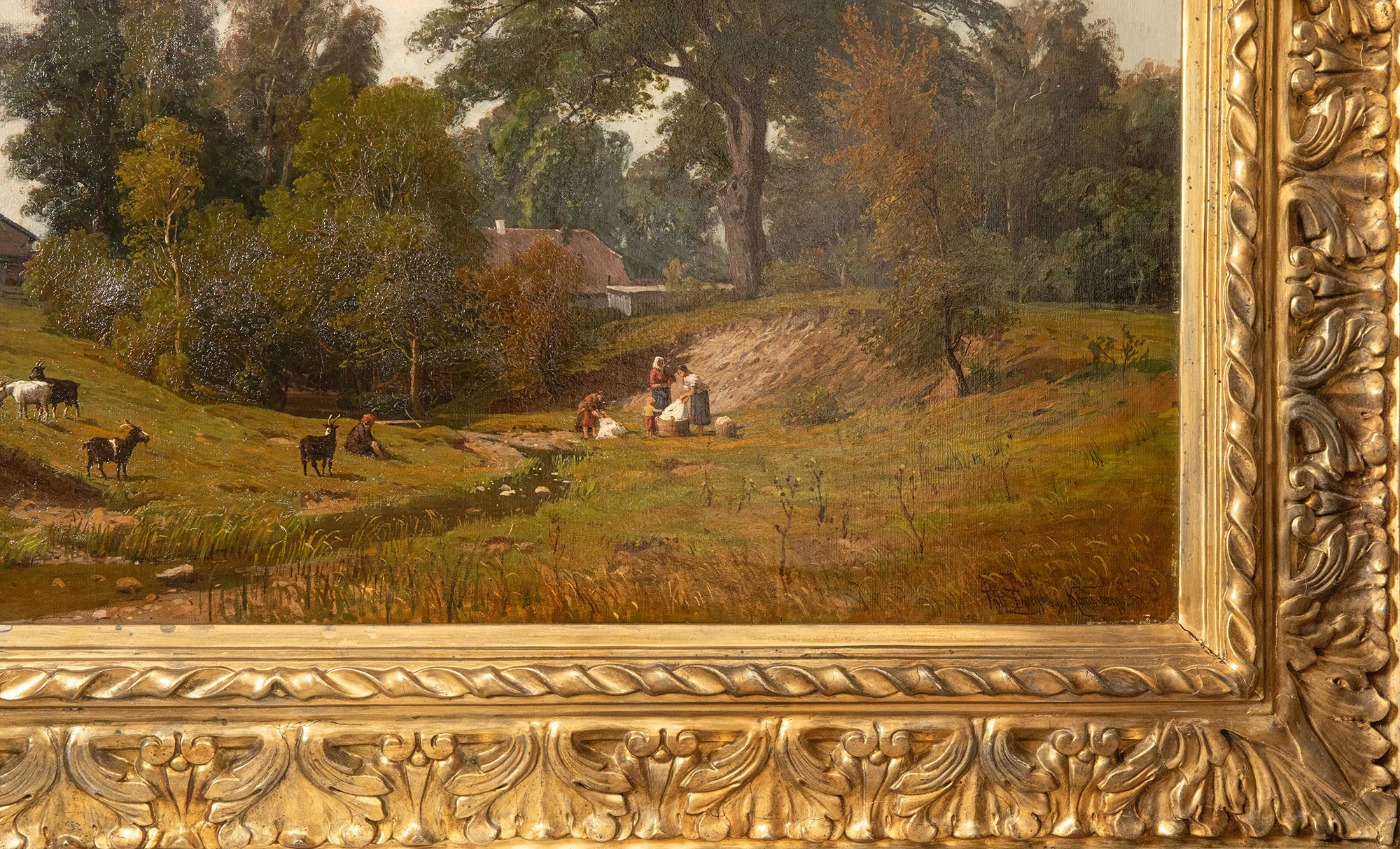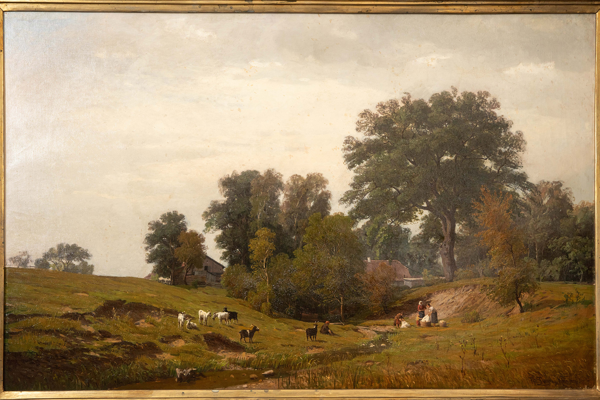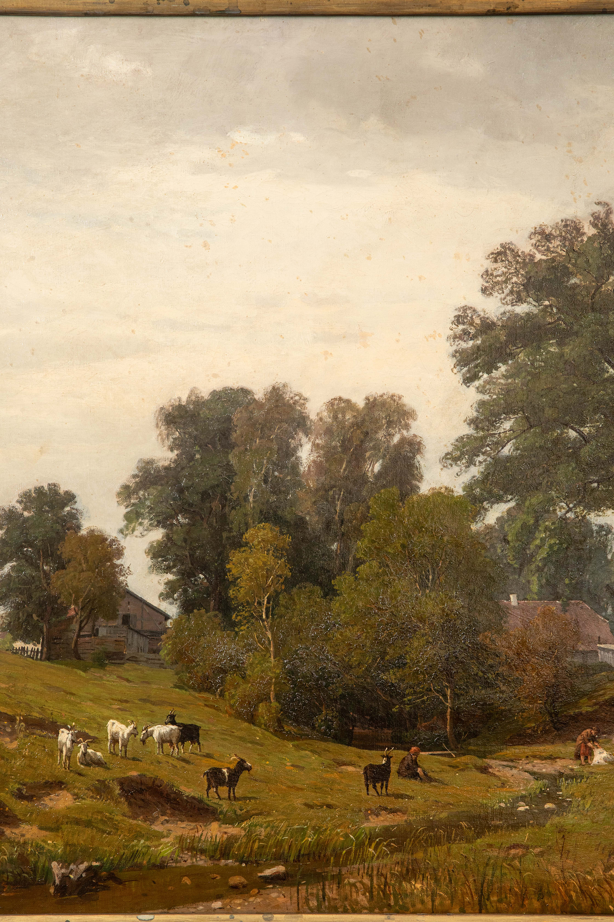 19世纪德国画家Fritz Daegling签名出品大型风景主题布面油画《人物与动物山水》