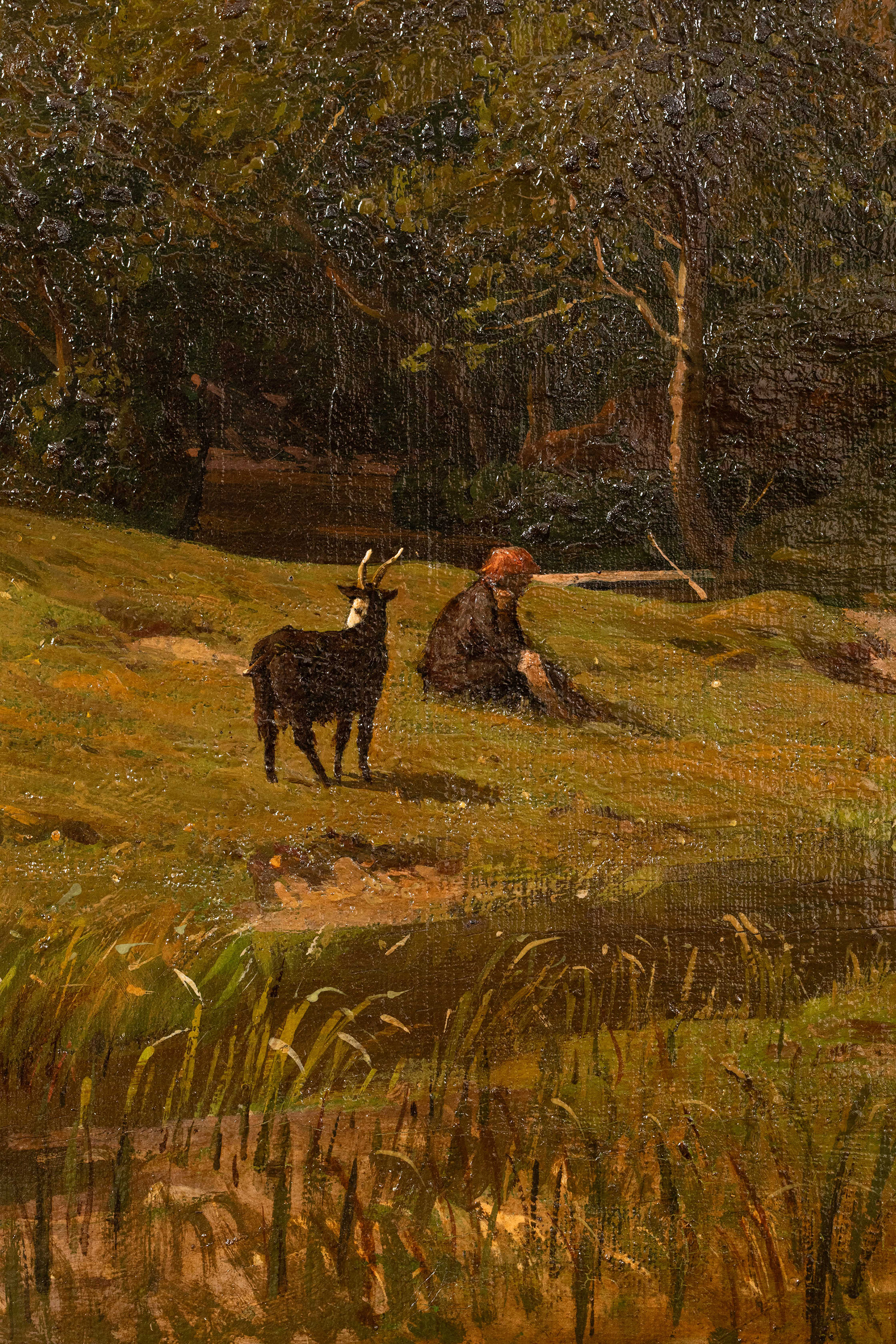 独角鹿西洋古董19世纪德国画家Fritz Daegling签名出品大型风景主题布面油画《人物与动物山水》